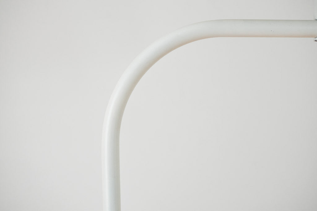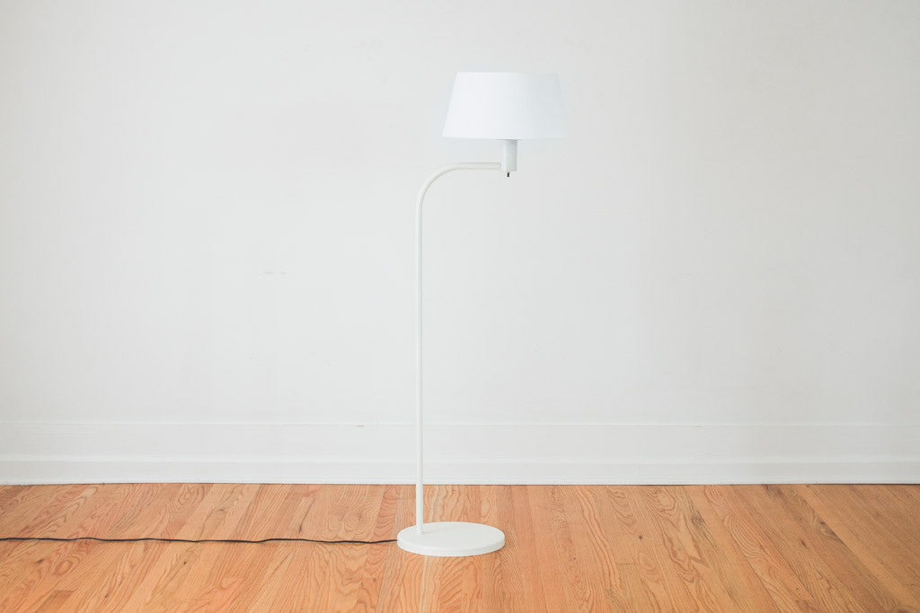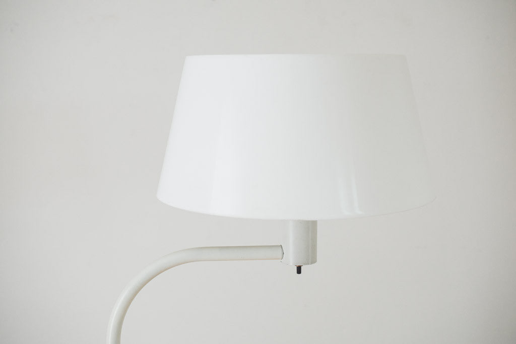 This Modern Mid Century floor lamp has a white metal base with plexiglass shade. It's in good shape with age related wear. See pictures for detailed condition.