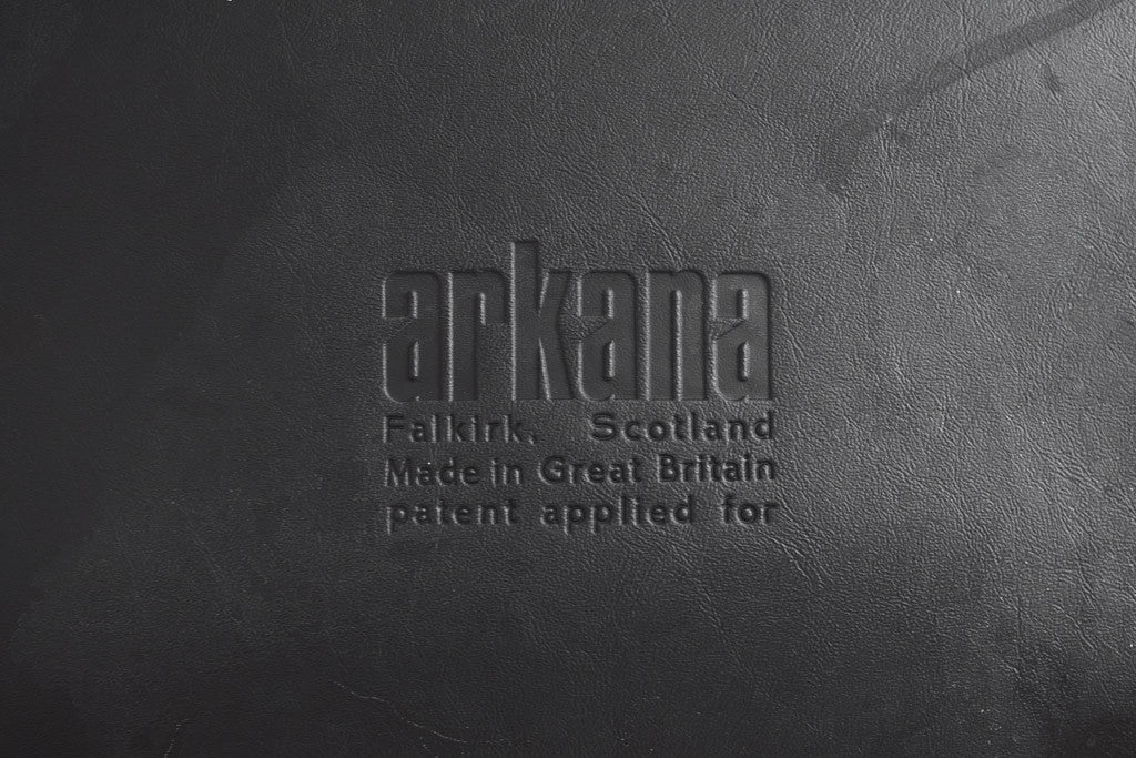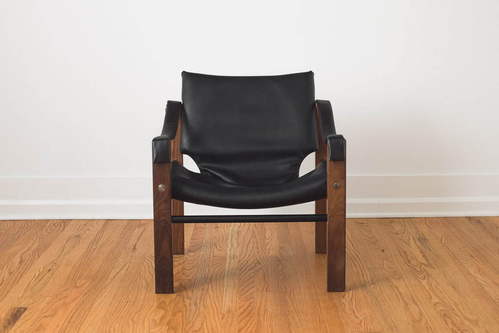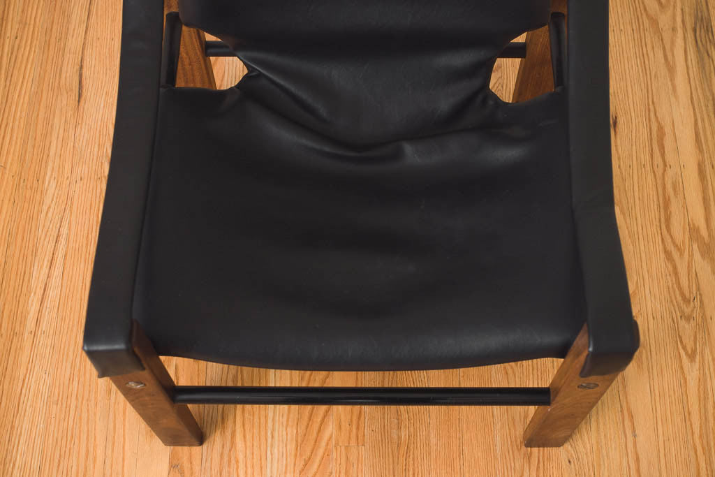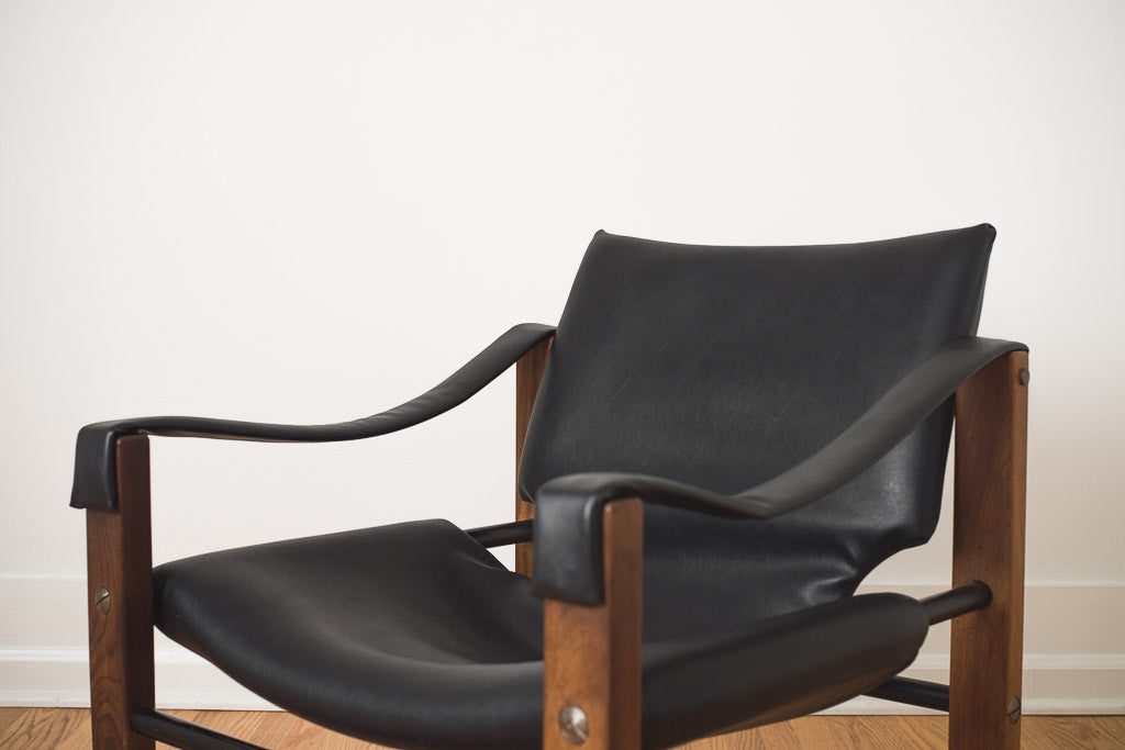 This Mid Century Maurice Burke safari chair was manufactured by Arkana in the UK. It has thick, black naugahyde upholstery on a teak and metal frame. It's in good shape with age related wear. See pictures for detailed condition.