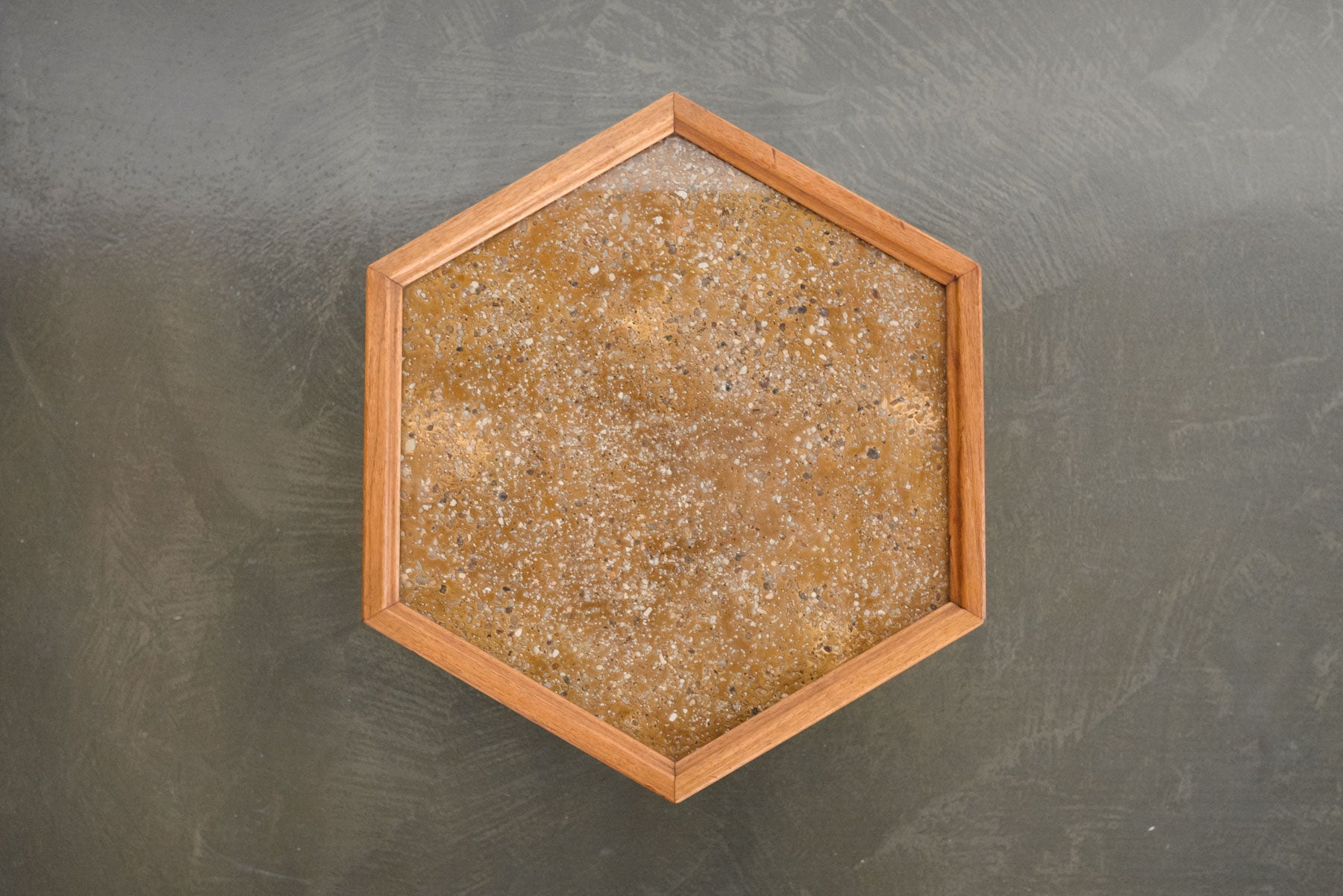 style: Mid Century, modern, hexagon, side/end table, plant stand material: wood (walnut), copper, glass brand: John Keal for Brown Saltman age: vintage condition: good, age related wear - see pictures