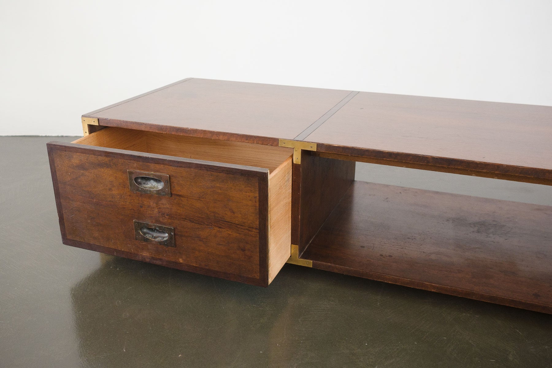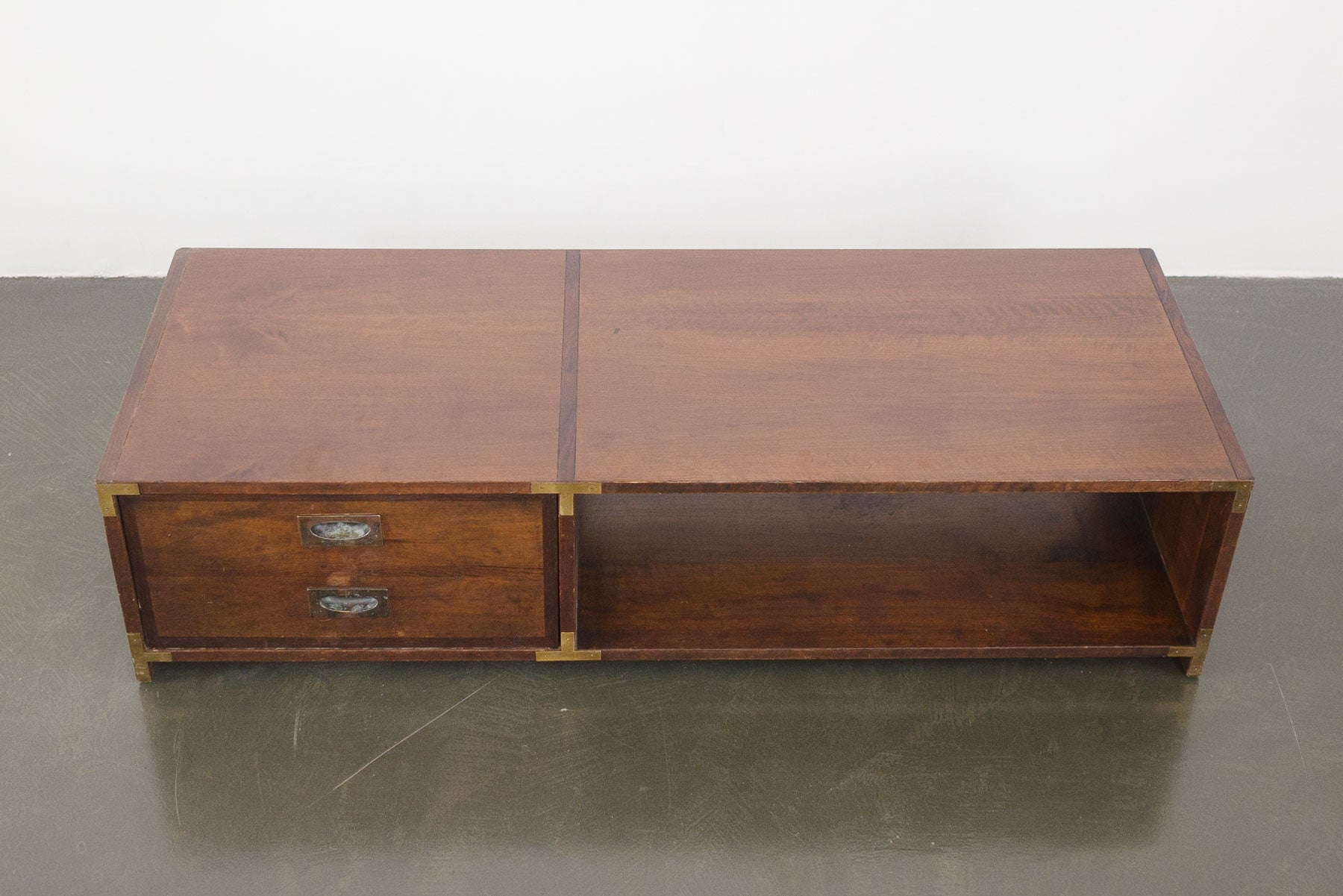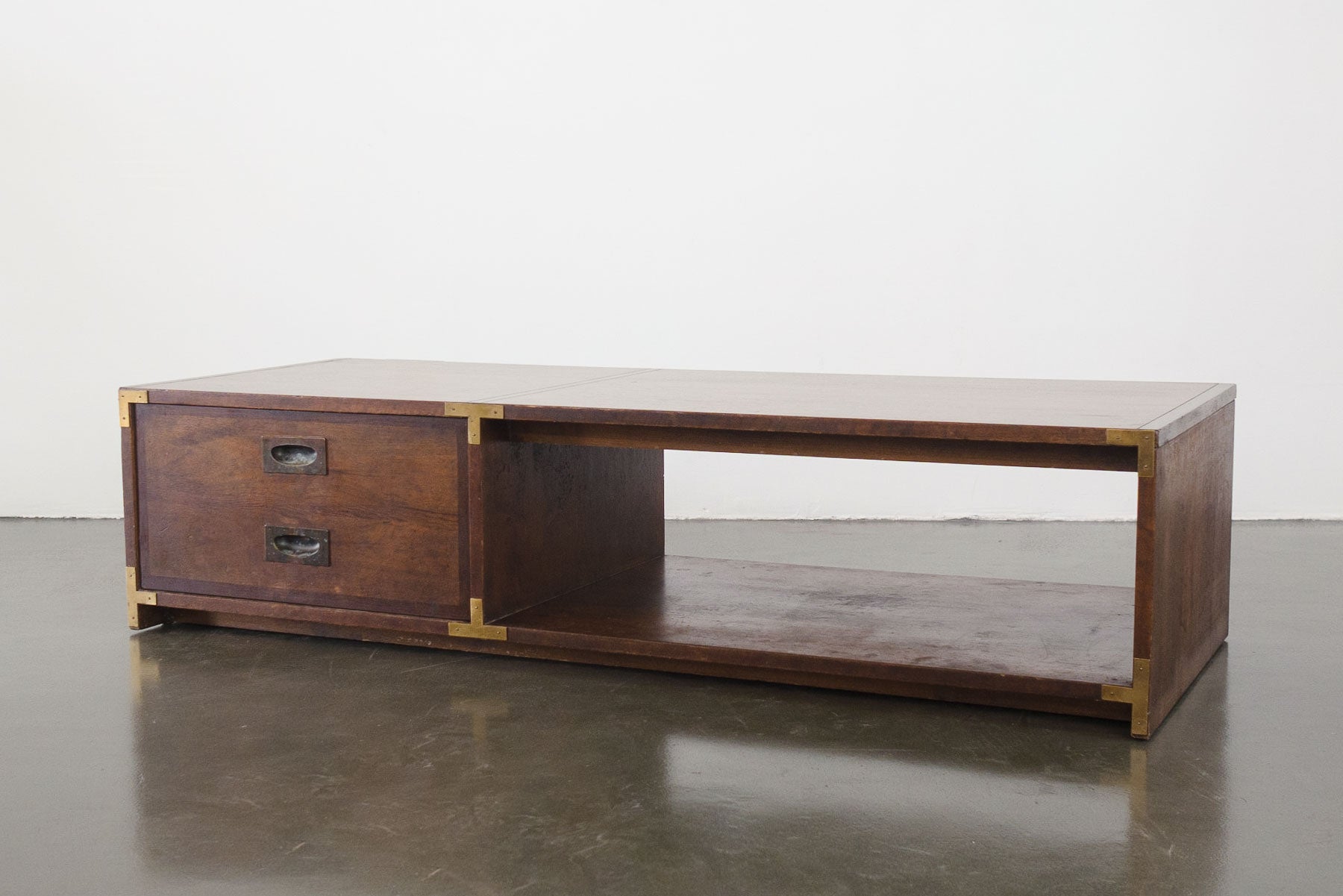 style: modern, storage, shelf, coffee tablematerial: wood (walnut), brass accentsbrand: Lane, USAage: vintage, Mid Centurycondition: good, age related wear - see pictures