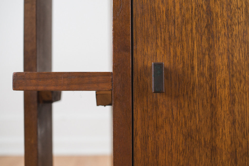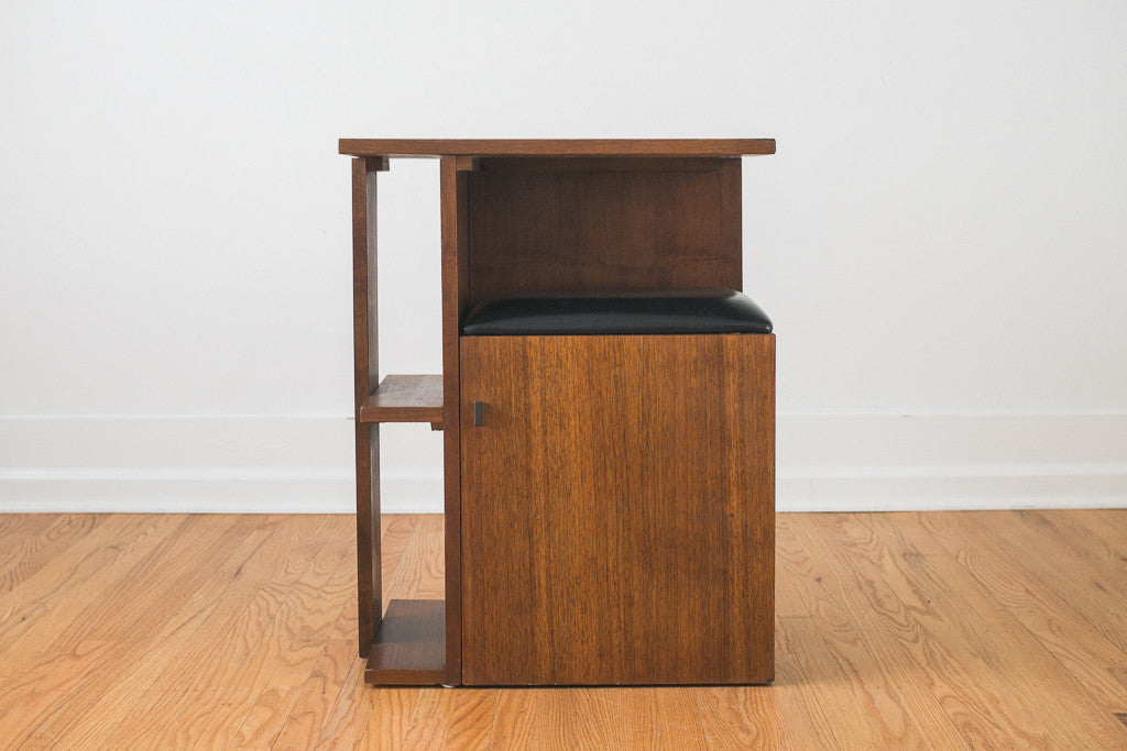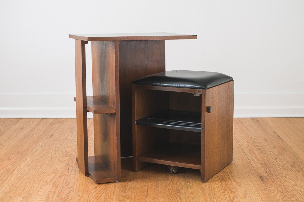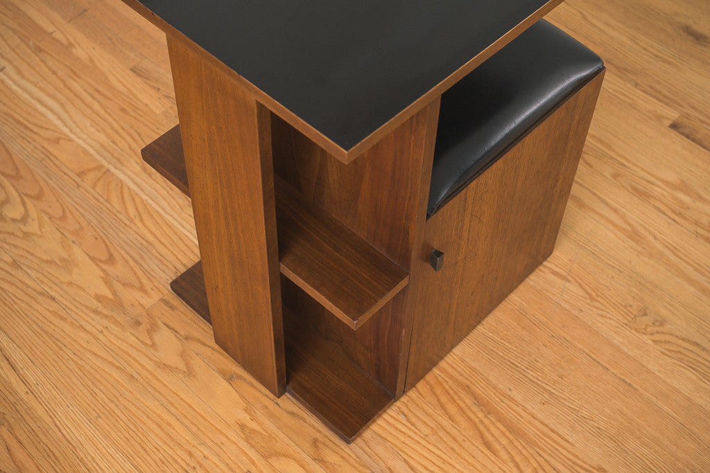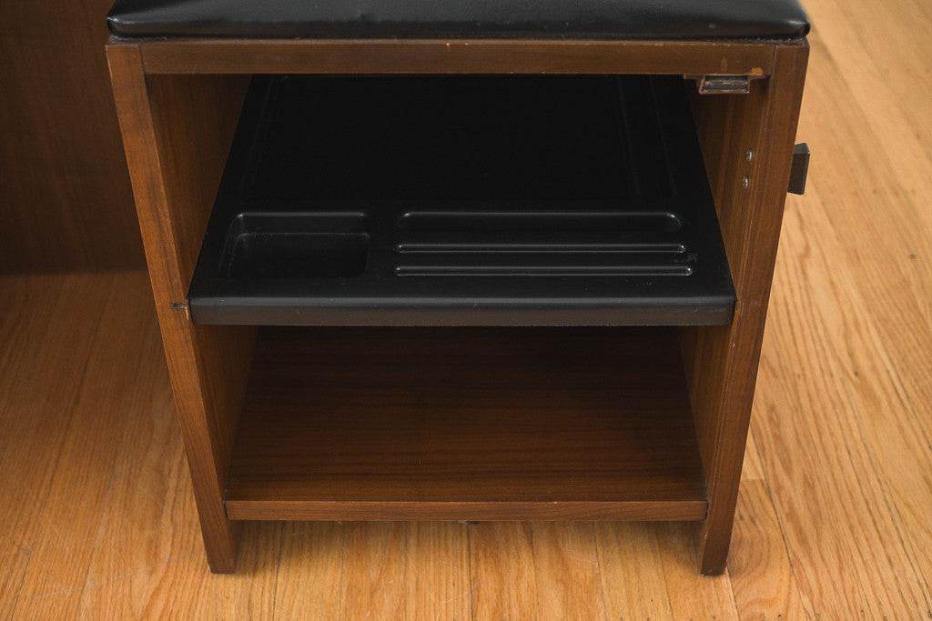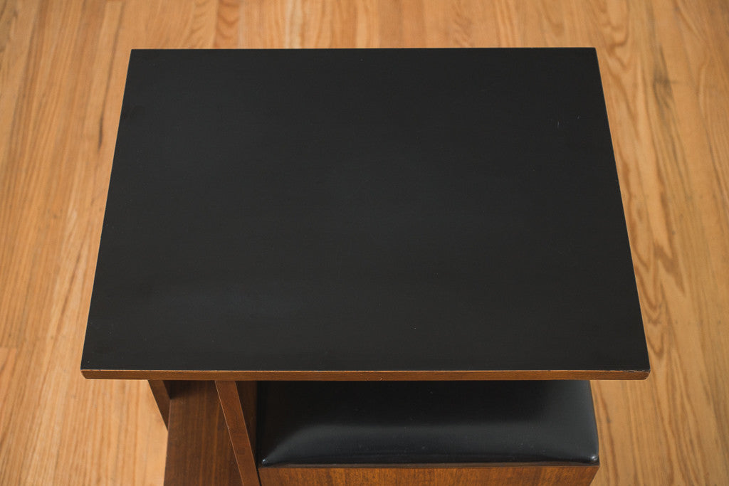 material: wood (walnut), black solid surface top, naugahyde, casters, plastic tray