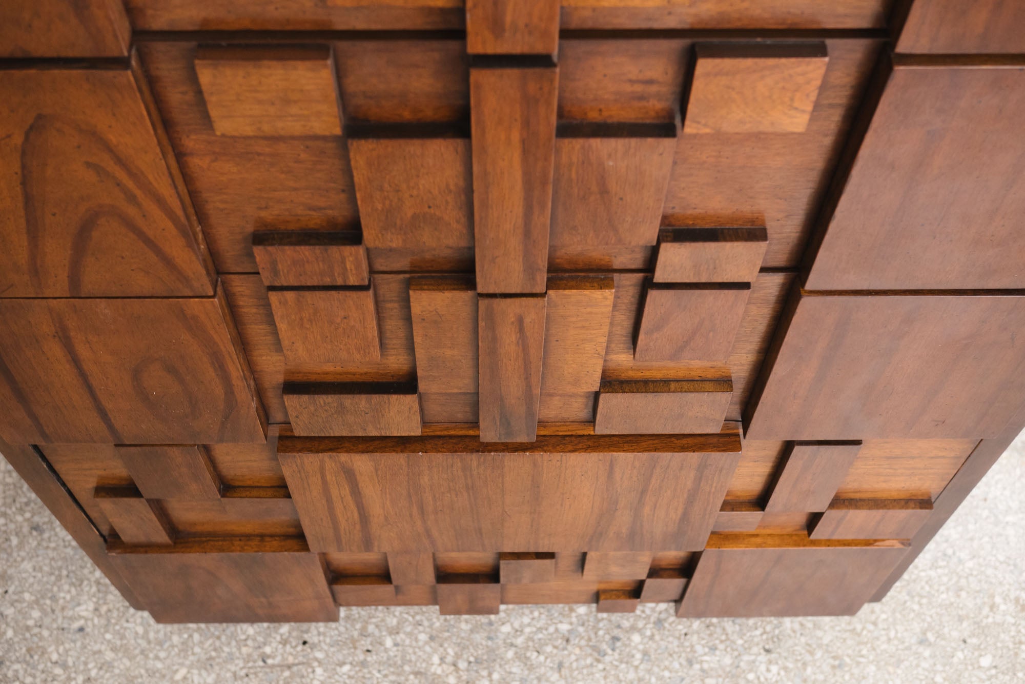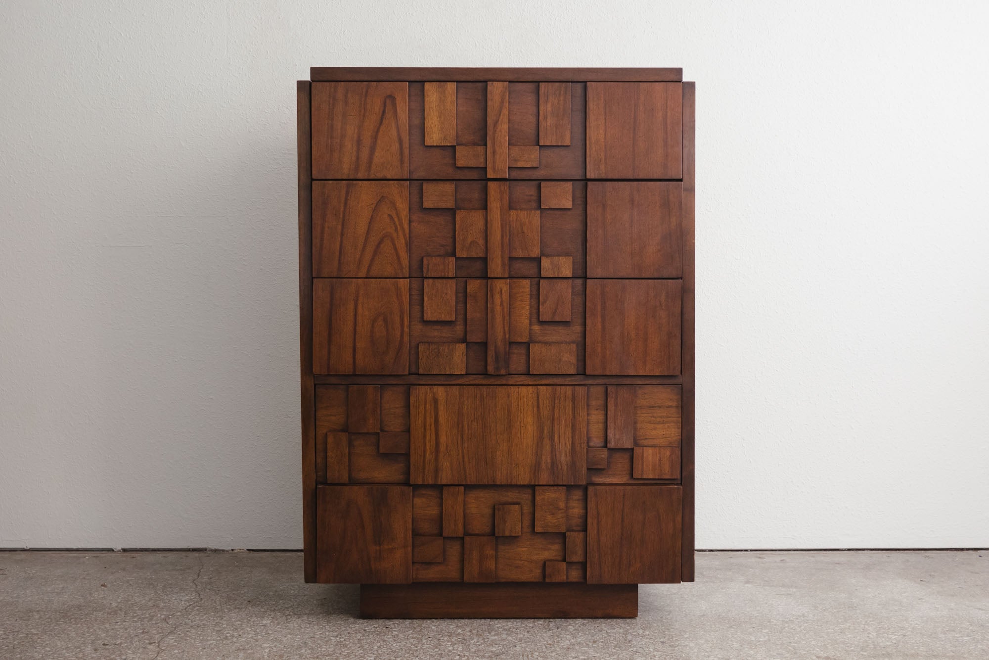 style: modern, brutalist, cubist, chest of drawers, dresser material: wood (walnut) brand: Lane Mosaic (5 drawer) age: vintage, Mid Century condition: good, age related wear - see pictures