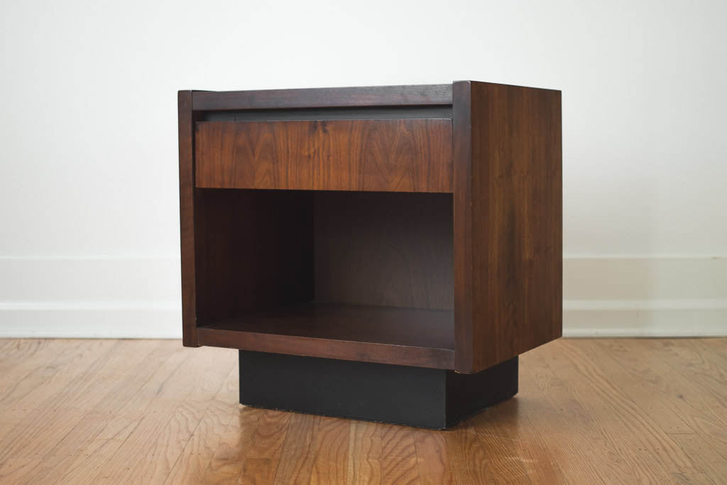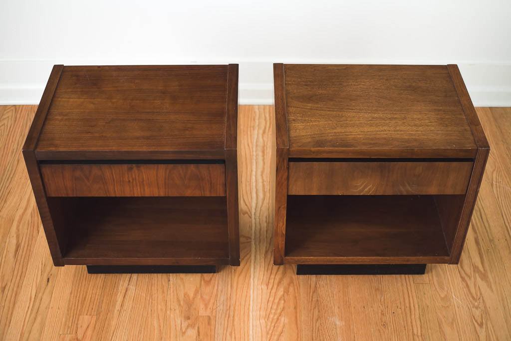 This pair of Mid Century nightstand side tables were made in the USA by Lane. They're walnut with a single drawer and open shelving below. They're in good shape with age related wear. See pictures for detailed condition.