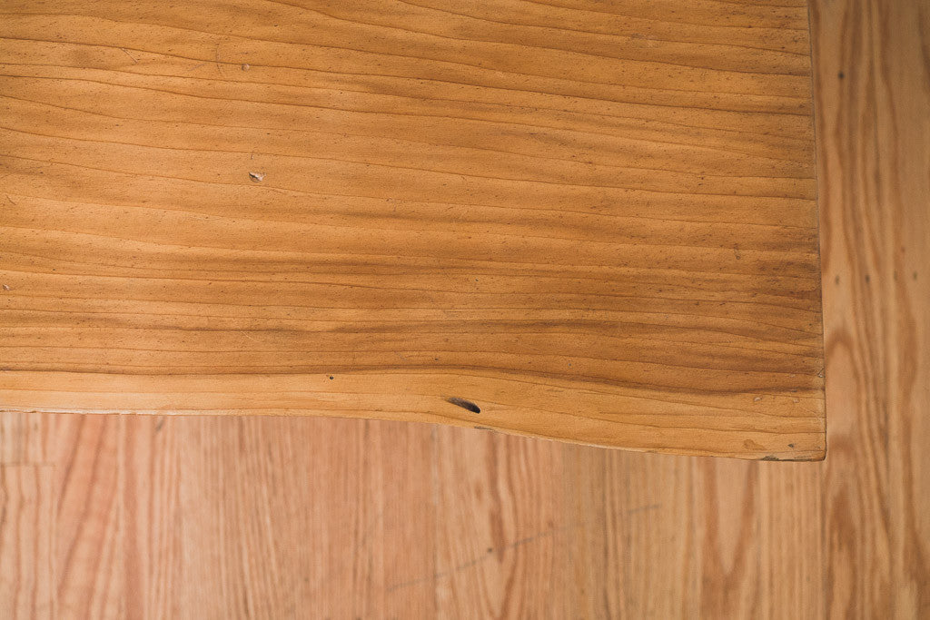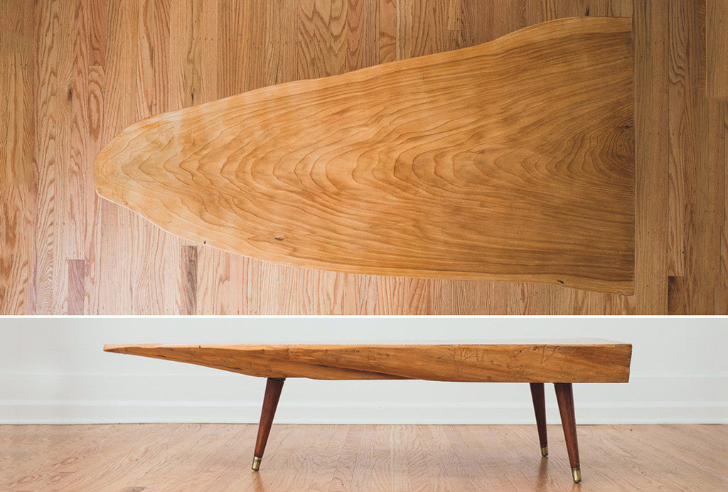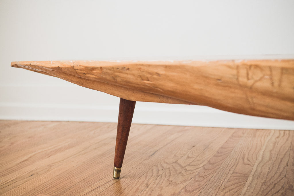 This Mid Century live edge slab coffee table has a lacquered finish and tapered leg base. It's in good shape with age related wear. See pictures for detailed condition.