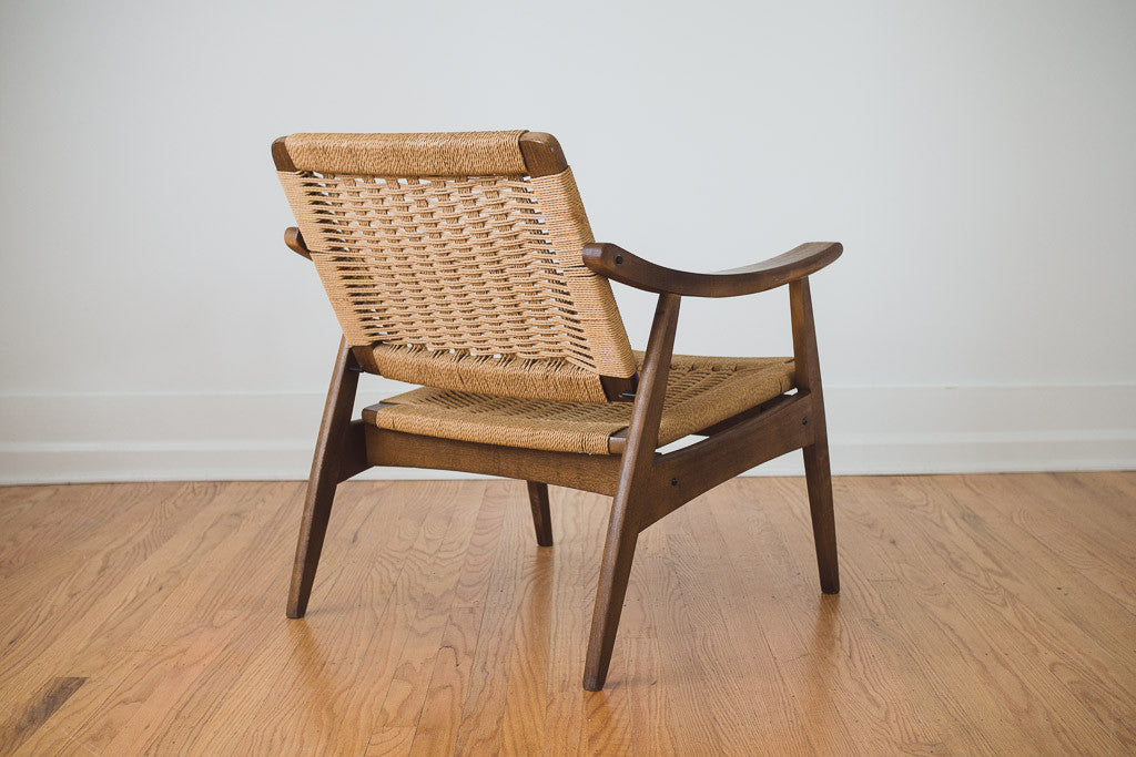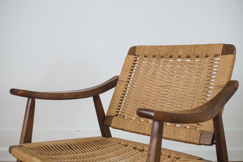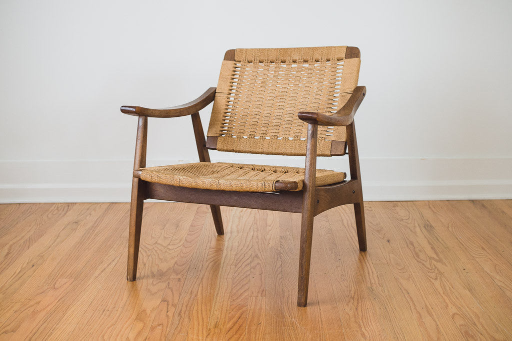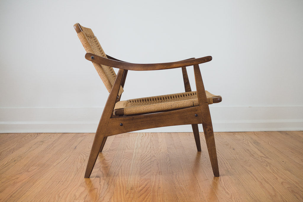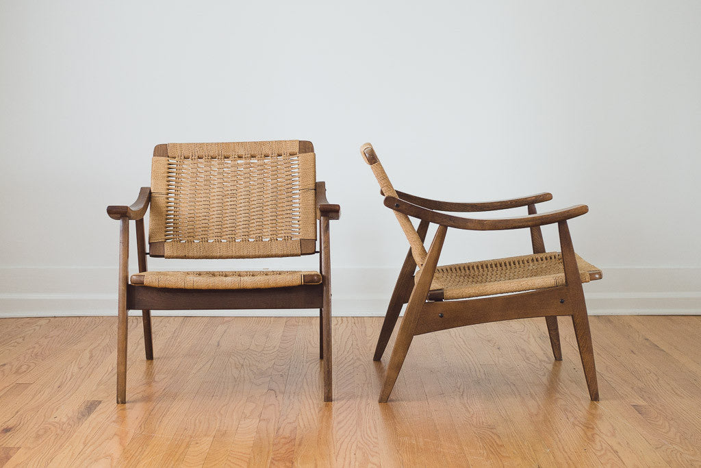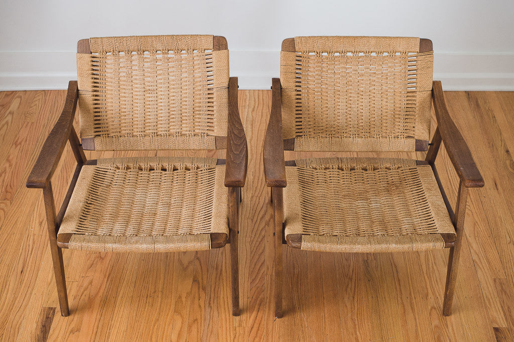 This pair of Mid Century chairs have woven jute upholstery on a wood frame. They're in good shape with age related wear. See pictures for detailed condition. Price is for the pair.