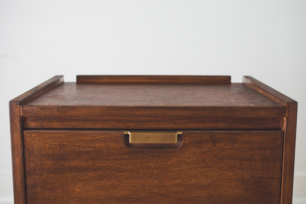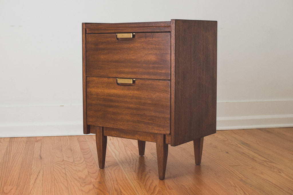This Mid Century mahogany nightstand was made in the US by Mainline. It has two drawers with brass pulls and a wood top. It's in good shape with age related wear. See pictures for detailed condition.