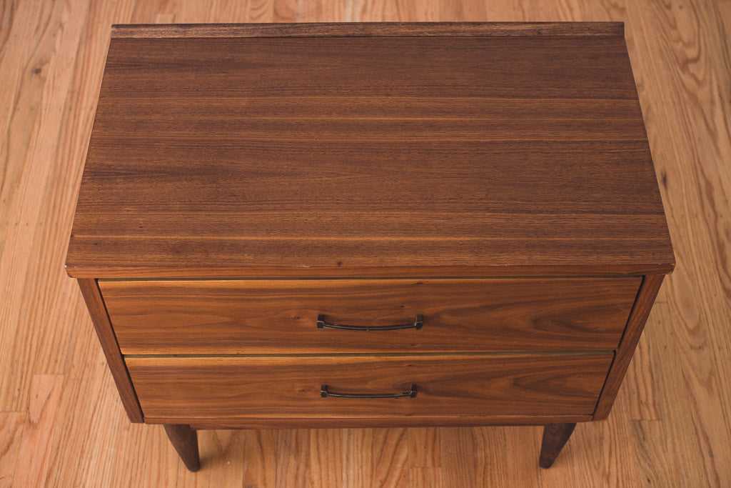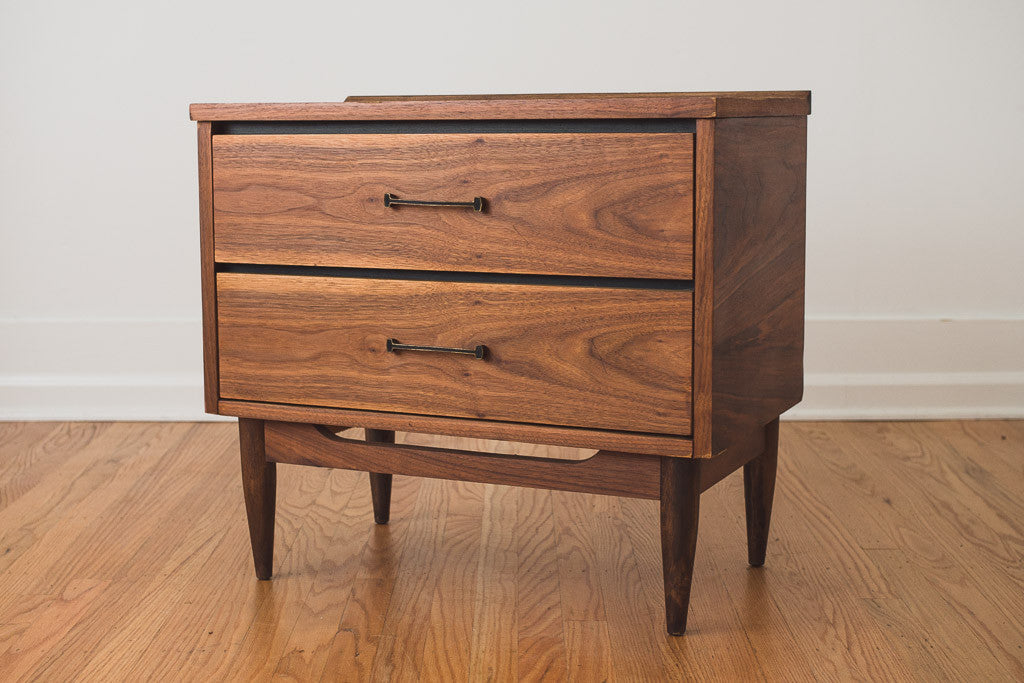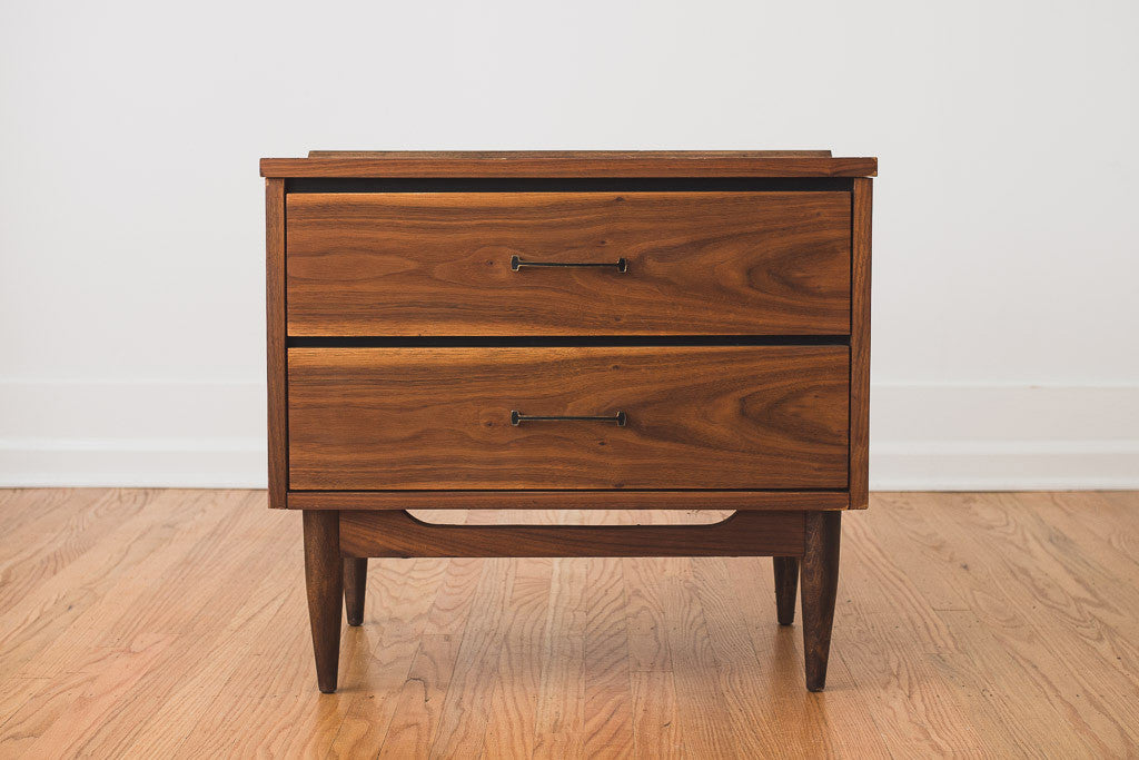 This Mid Century nightstand was manufactured in the US. It has two drawers with metal pulls and a wood top. It's in good shape with age related wear. See pictures for detailed condition.