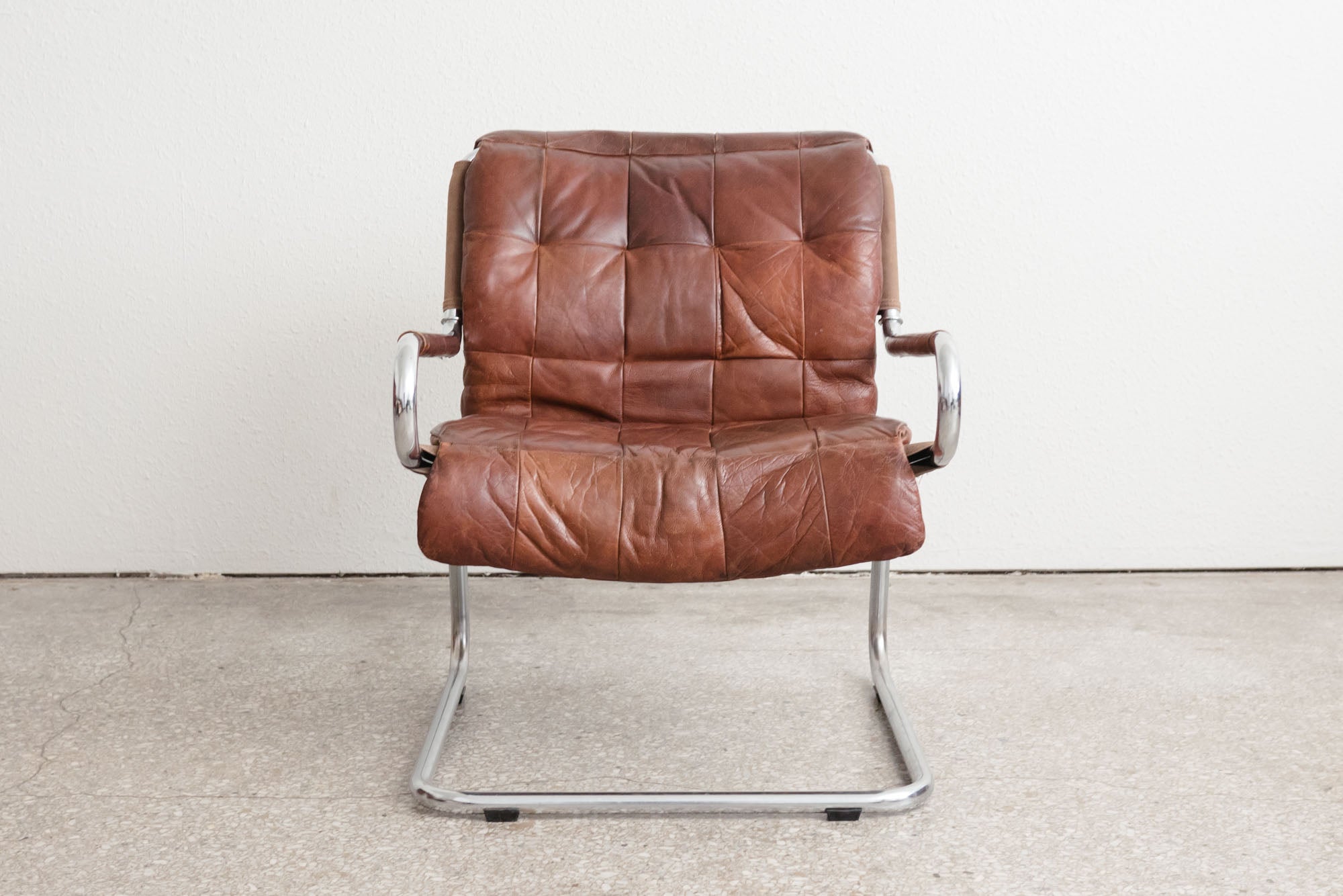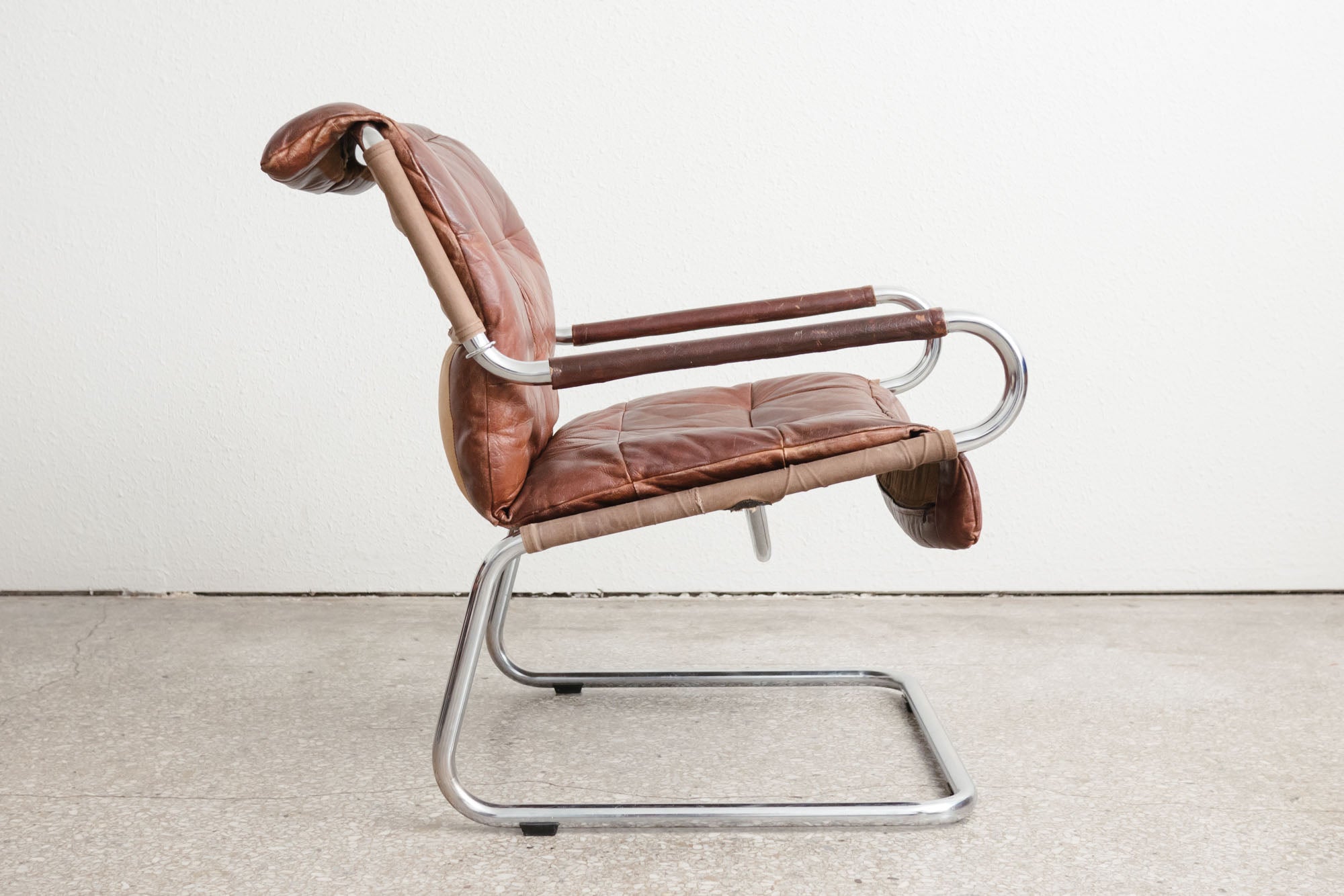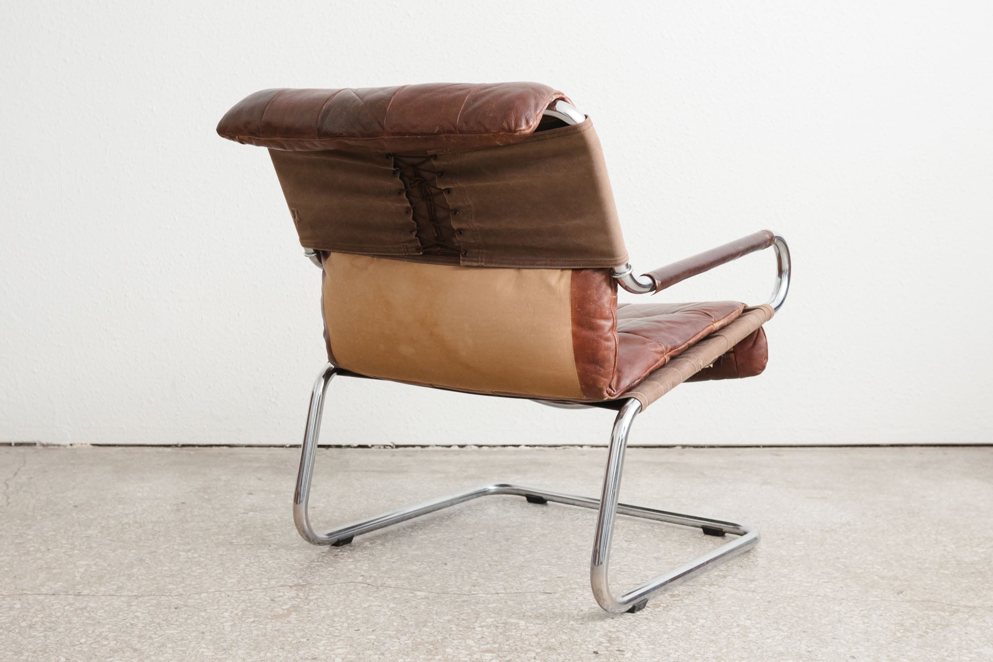 style: modern, leather, cantilever, lounge chairmaterial: metal, chrome, leather, canvascolor: brownage: vintage, Mid-Centurycondition: good, age related wear - see pictures