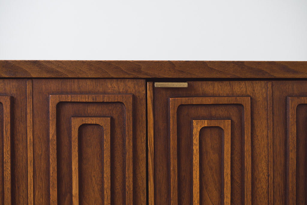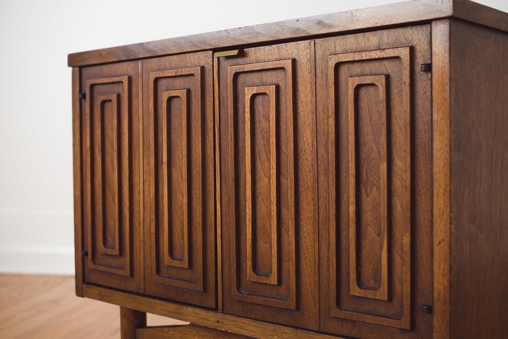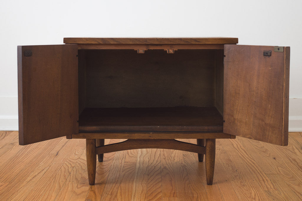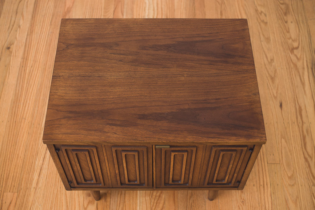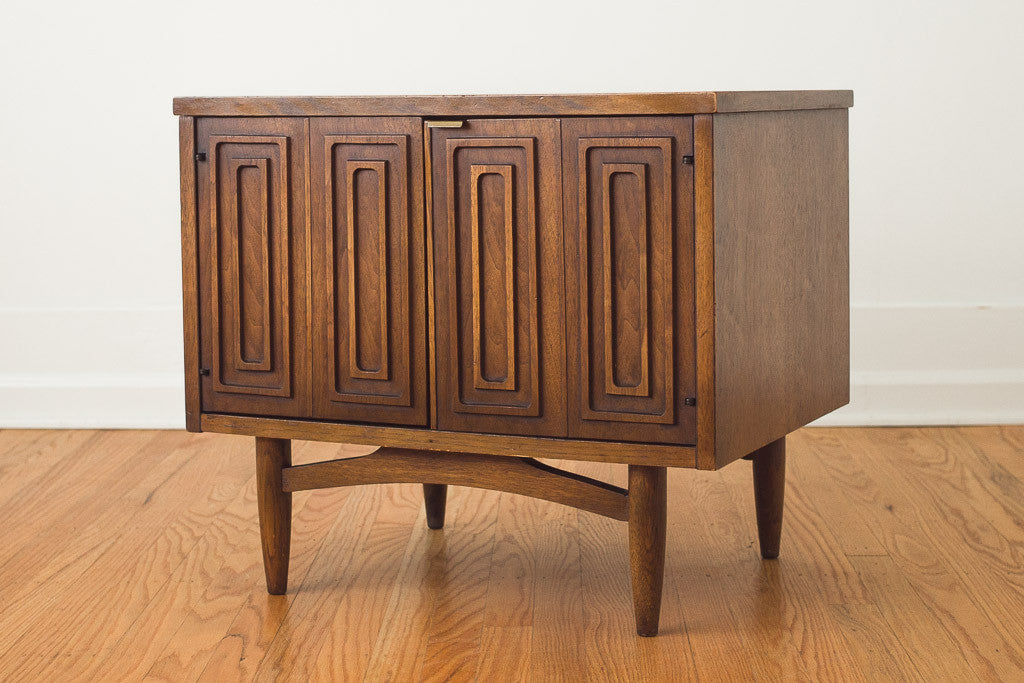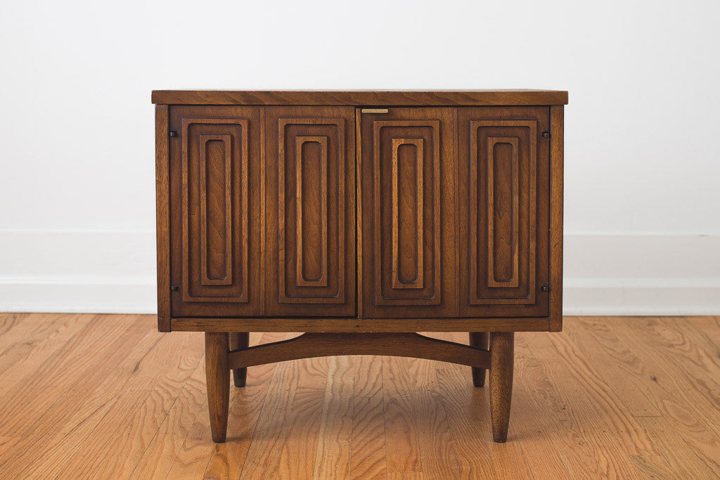 This Mid Century nightstand was made in the US by Broyhill for their Sculptra line. It has open storage behind double doors, so it can also store records. It's in good shape with age related wear. See pictures for detailed condition.