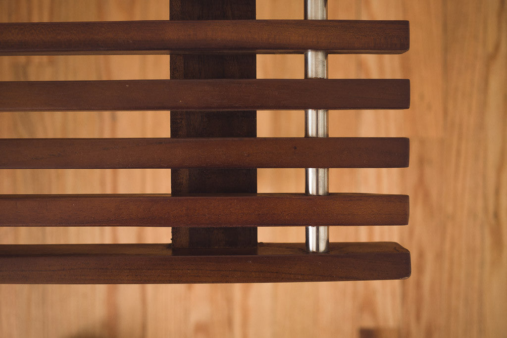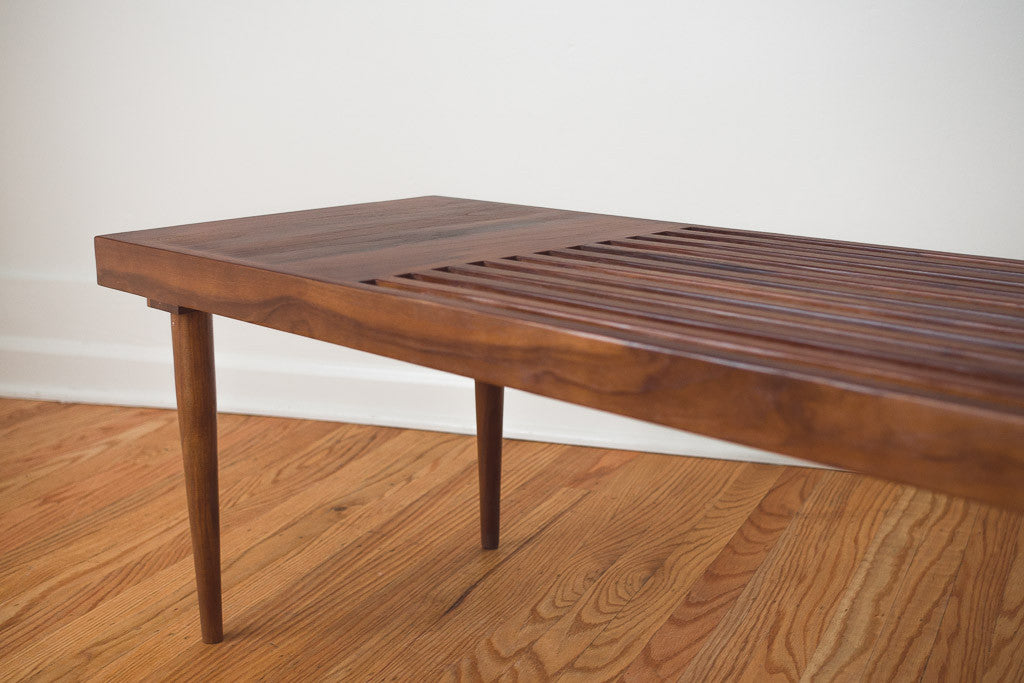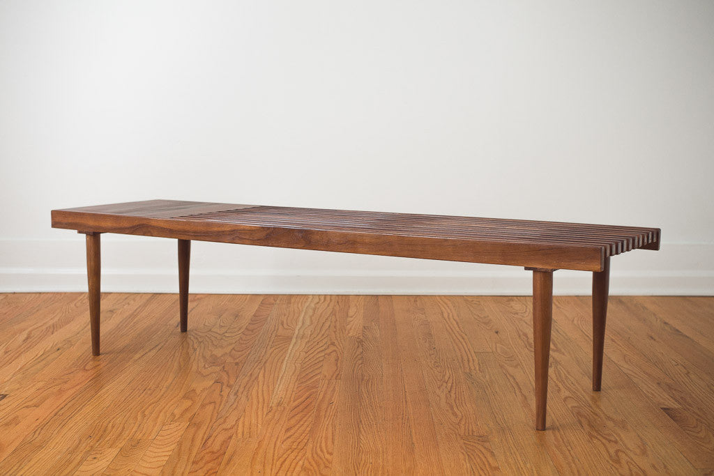 This Mid Century style slat bench/coffee table was hand crafted in Seattle. It's wood with tapered legs and metal accents. It's in good shape with light wear. See pictures for detailed condition.