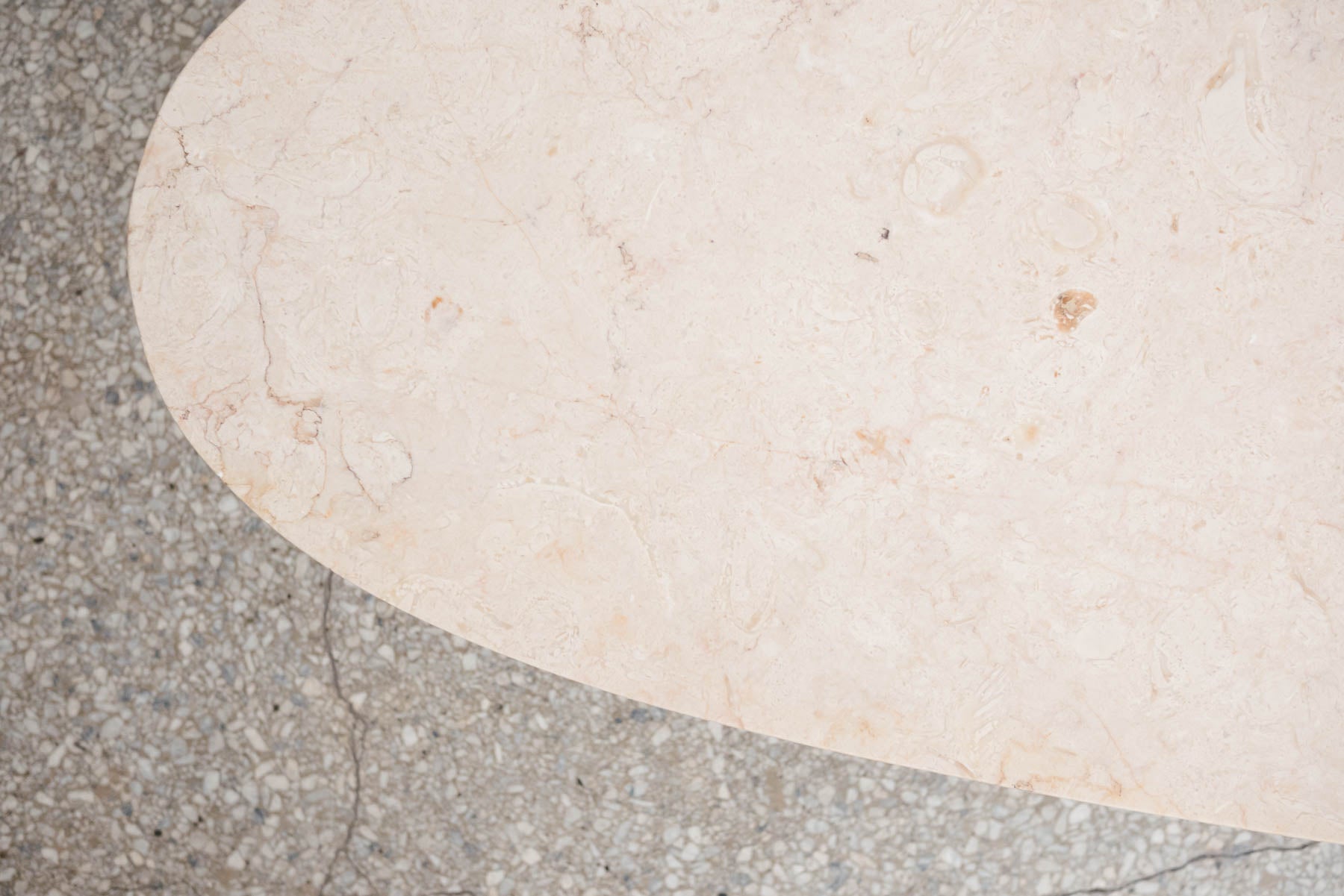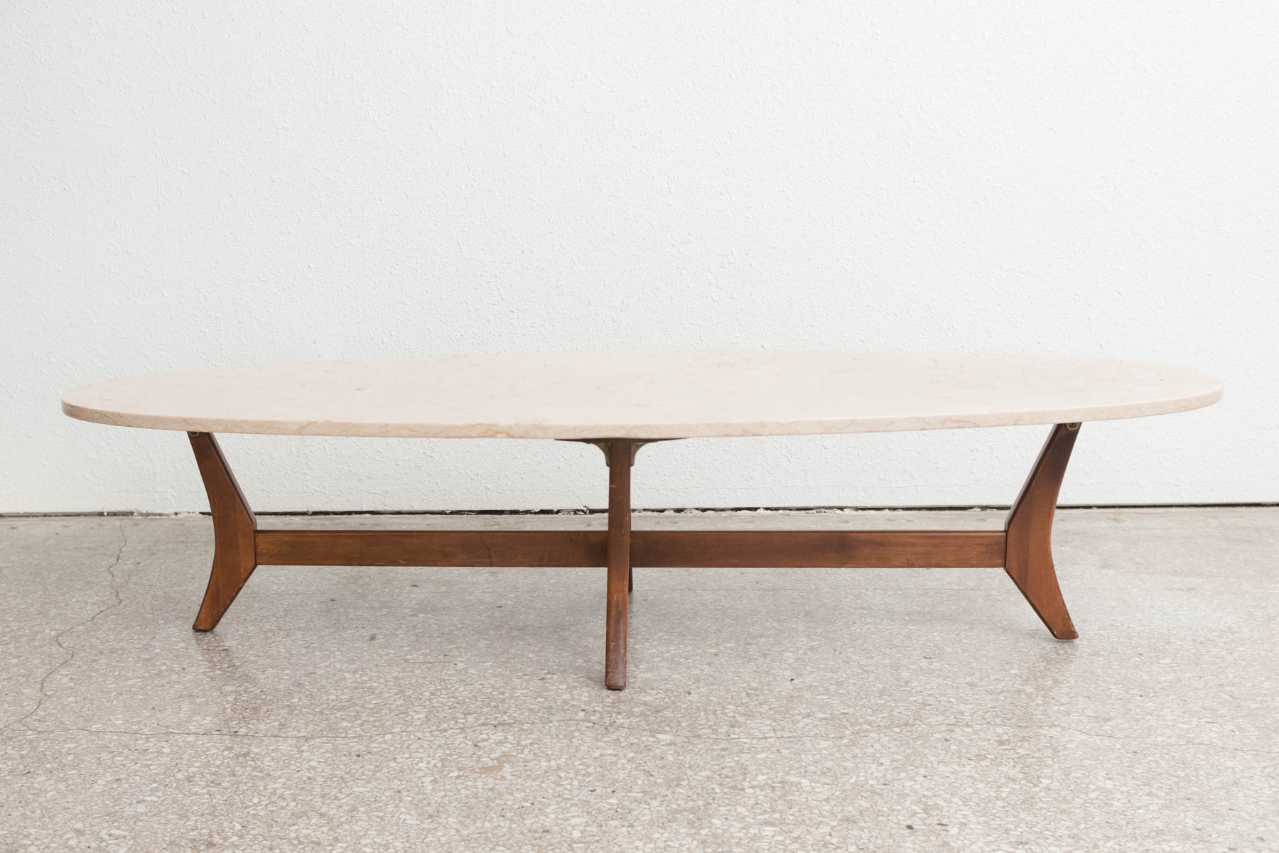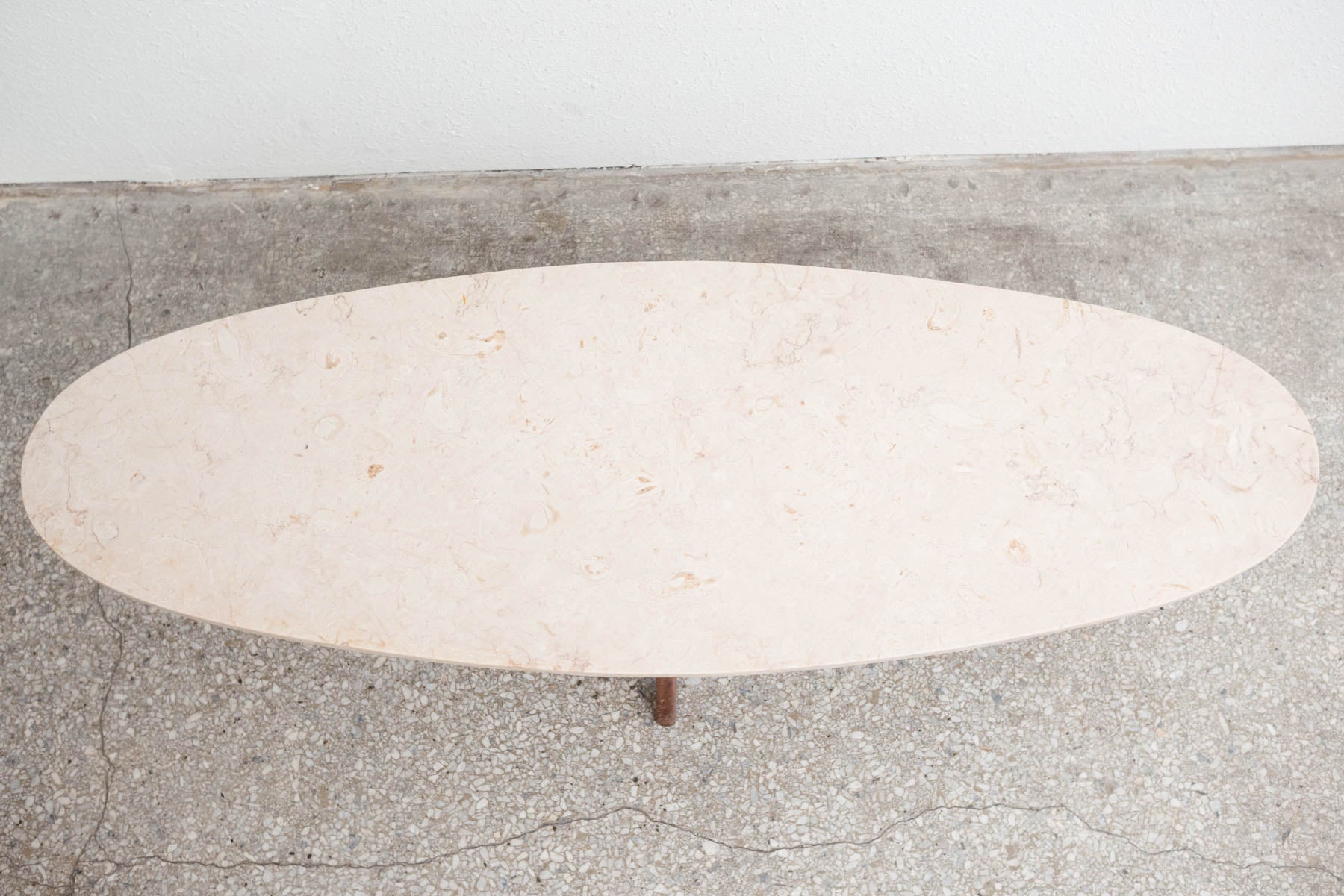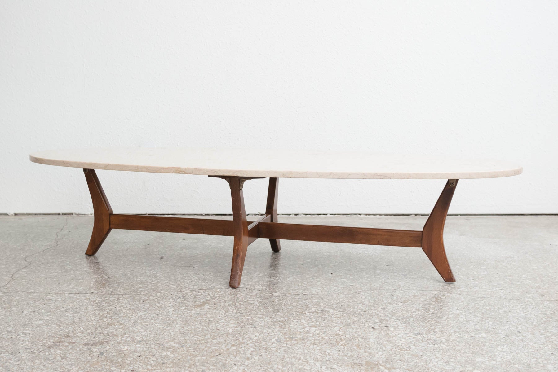 style: Mid Century, modern, oval, display, stone, coffee table material: stone (Travertine), wood (walnut) age: vintage condition: good, age related wear - see pictures