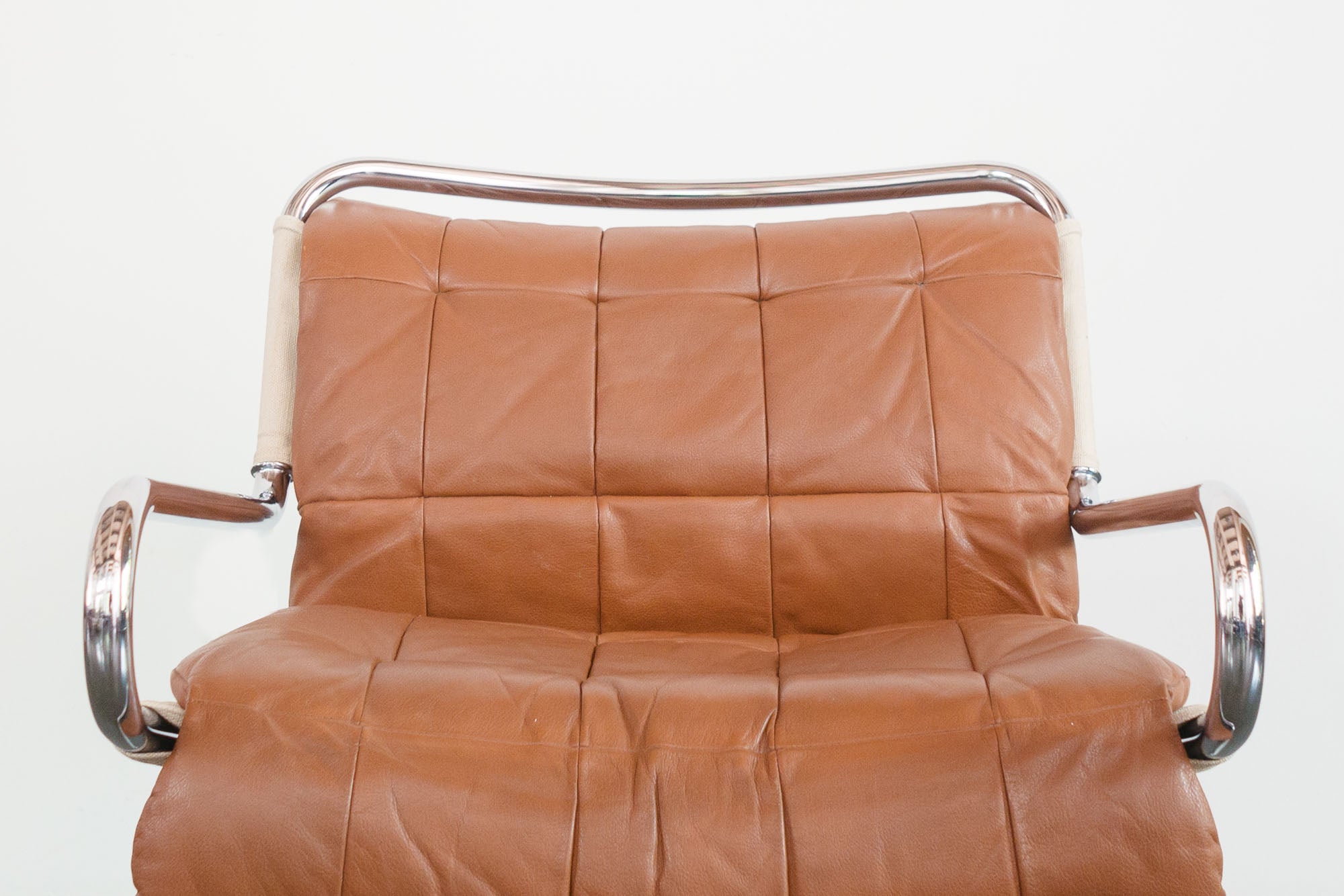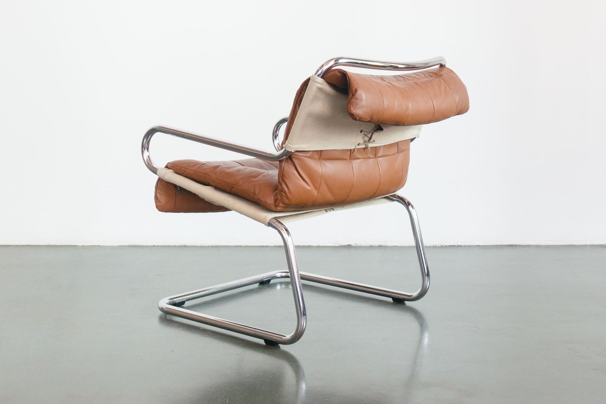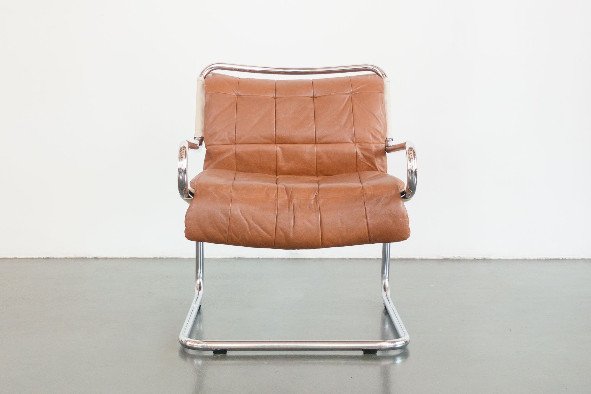 style: modern, leather, cantilever, lounge, arm chair material: metal (chrome steel), brown leather age: vintage condition: good, age related wear - see pictures
