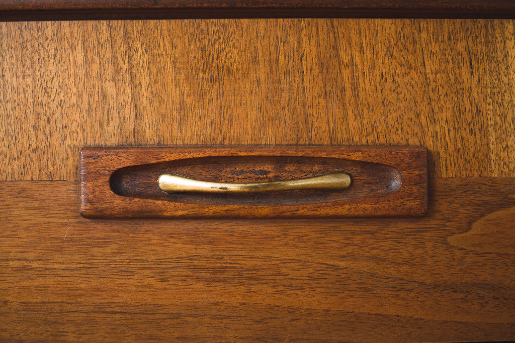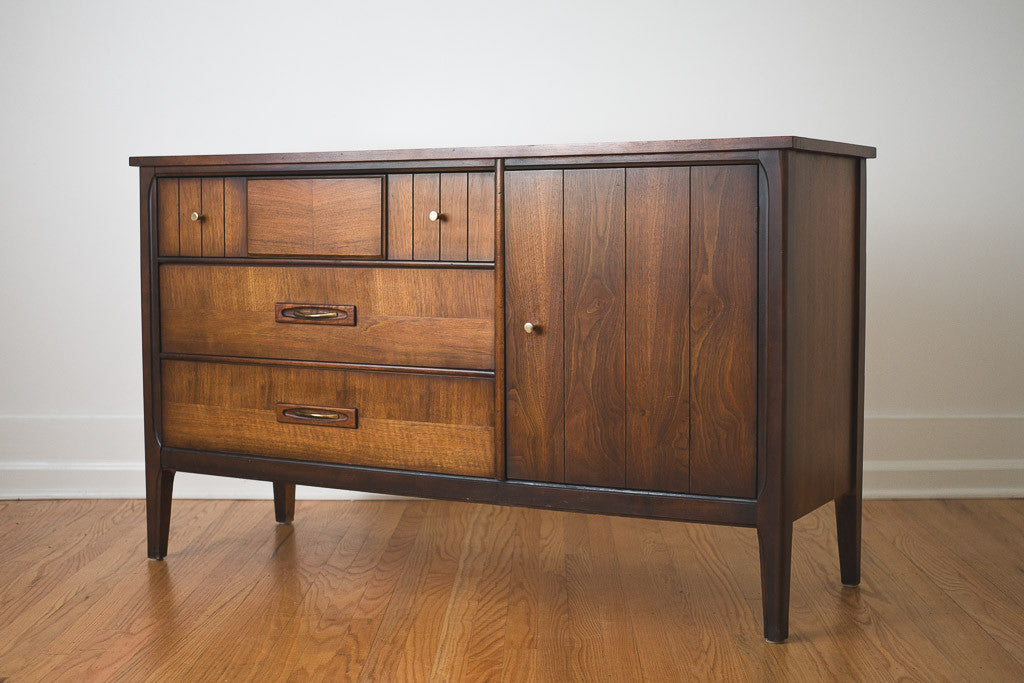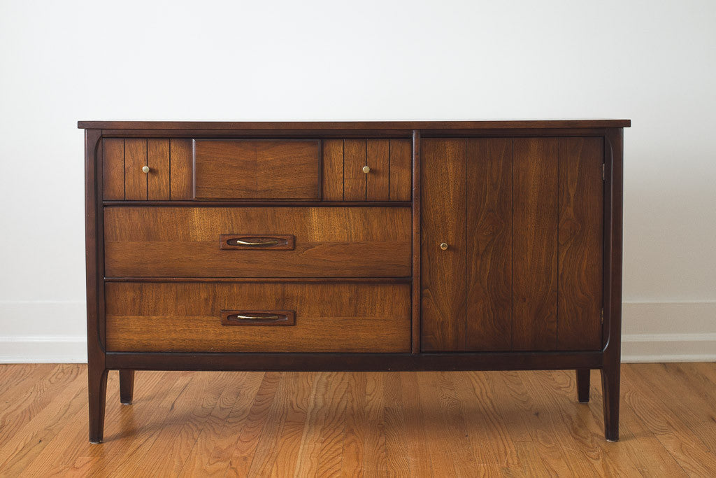 This Mid Century walnut credenza was manufactured in the US. It has metal pulls, a wood top and is in good shape with age related wear. It could also be used as a sideboard, buffet or dresser. See pictures for detailed condition.