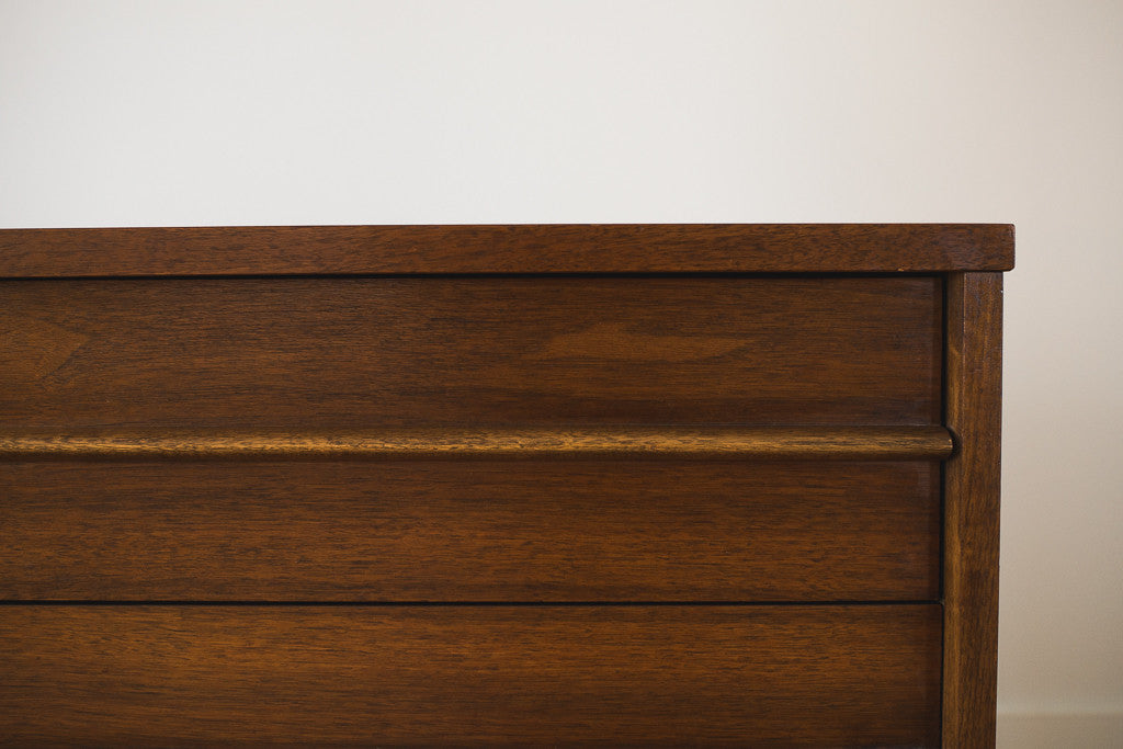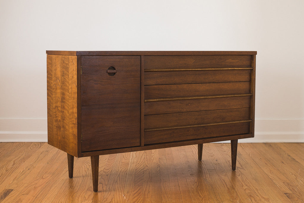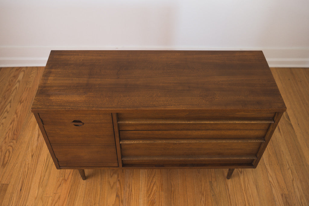 This Mid Century walnut credenza was manufactured in the US. It has minimalist carved wood pulls and a wood top. It's in good shape with age related wear and could also be used as a sideboard, buffet or dresser. See pictures for detailed condition.