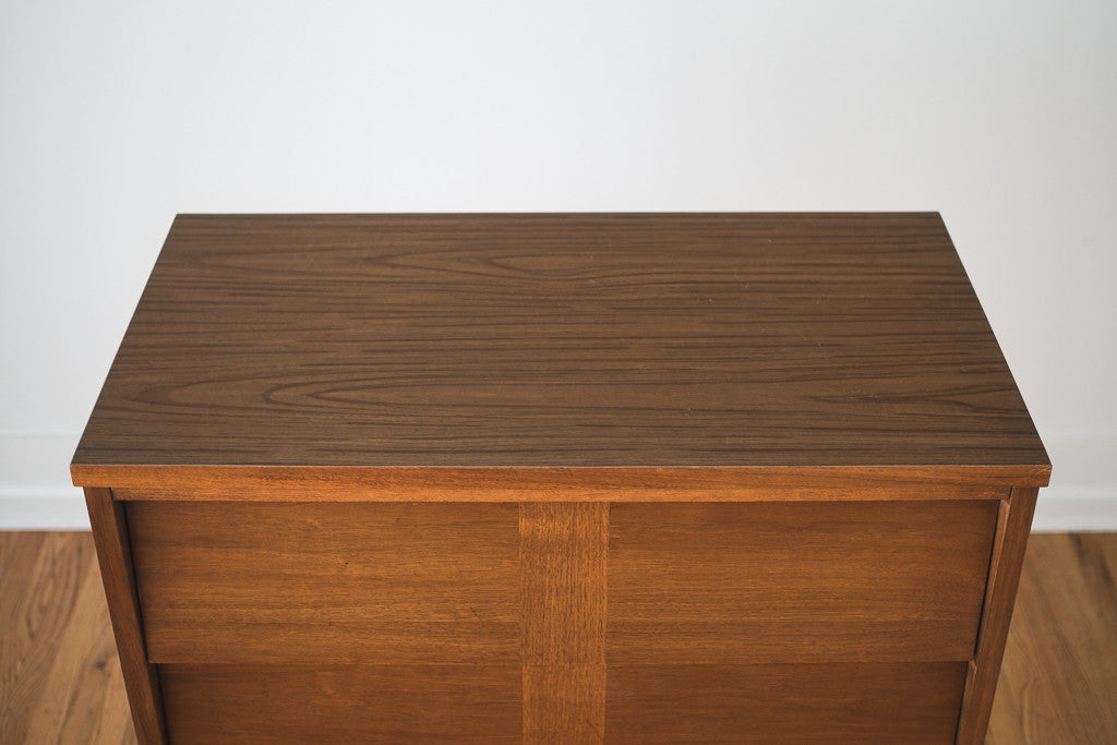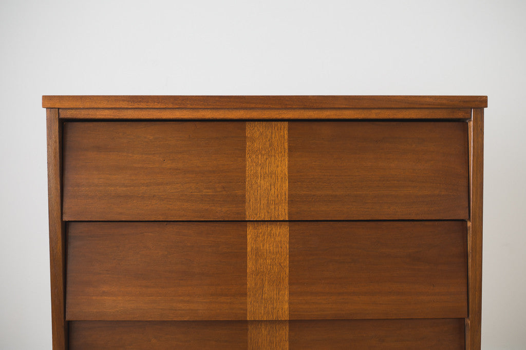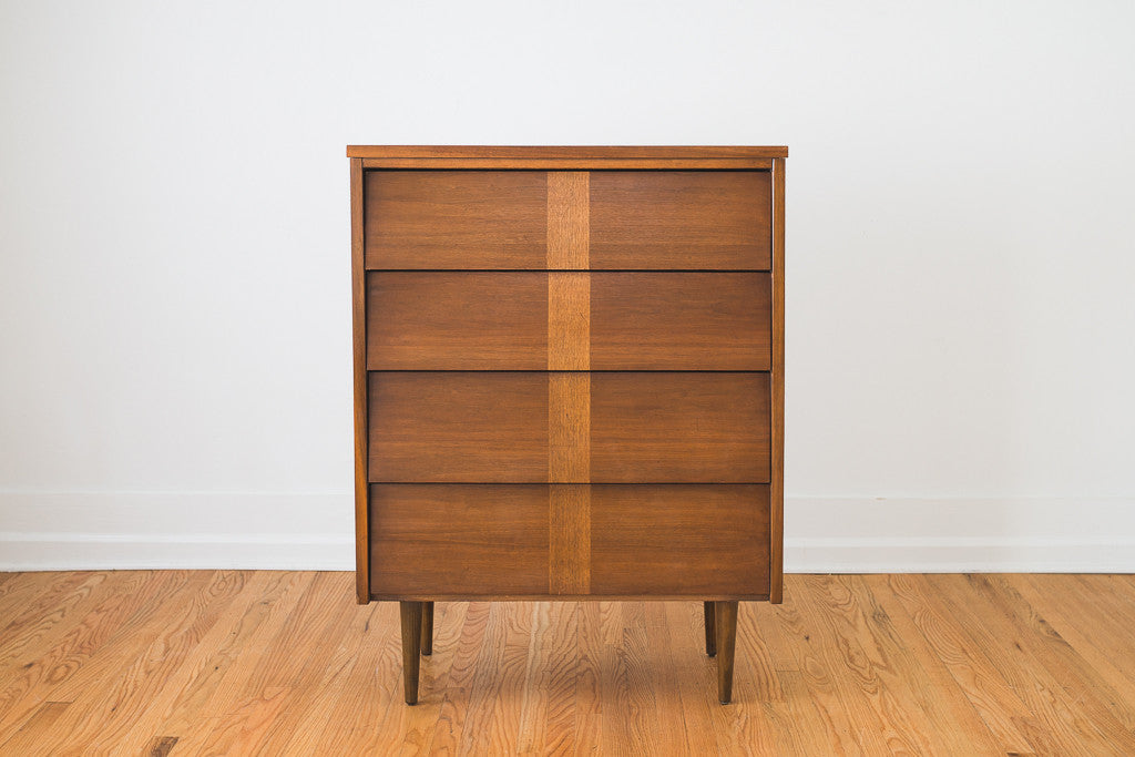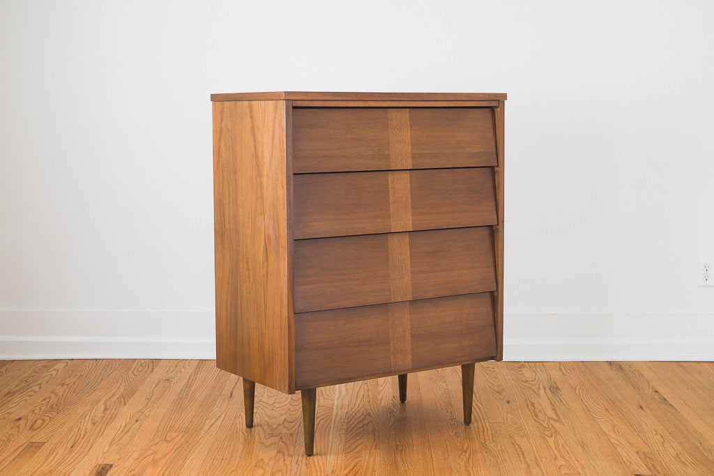 This Mid Century walnut four drawer highboy dresser was manufactured in the US by Ward. It has a step-front with recessed pulls and a solid surface wood grain top. It's in good shape with age related wear. See pictures for detailed condition.
