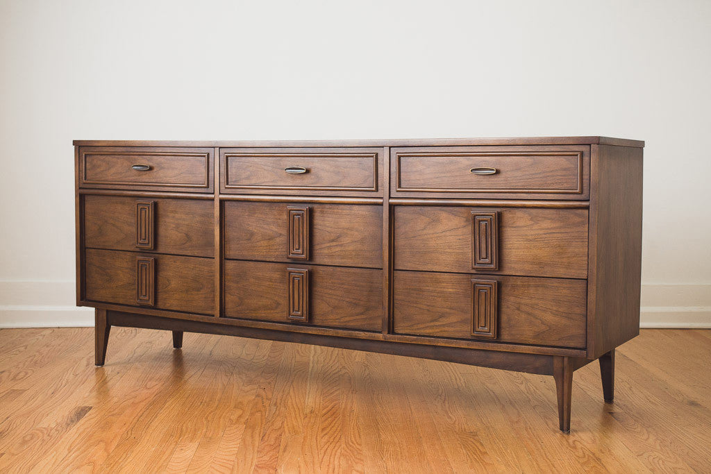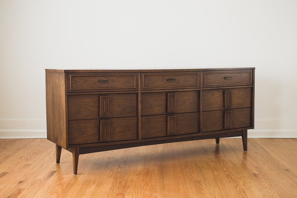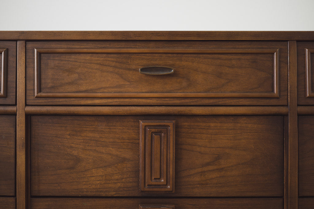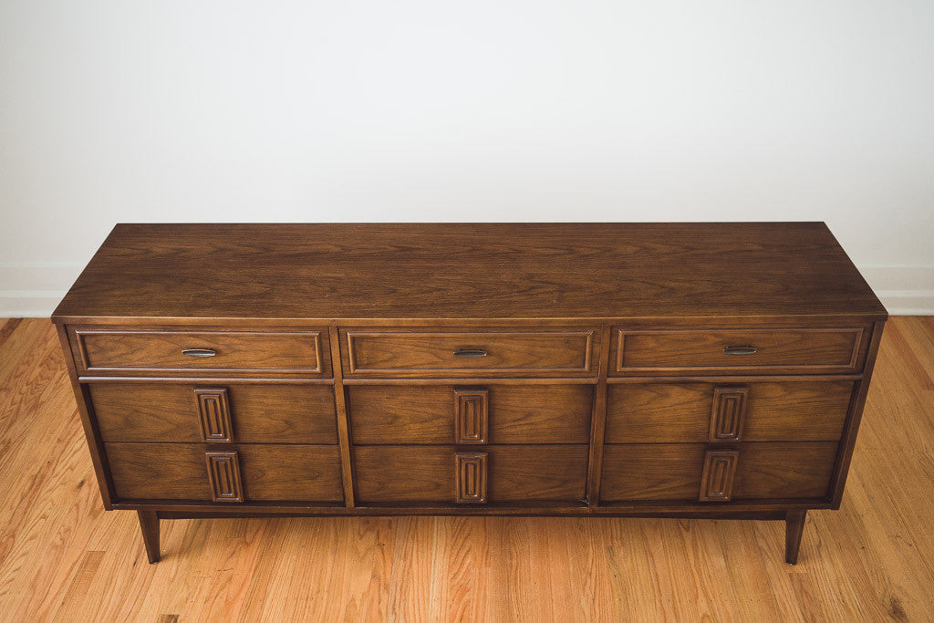 This Mid Century walnut nine drawer lowboy dresser was manufactured in the US. It has carved wood and brass pulls with a coated wood top. It's in good shape with age related wear and could also be used as a sideboard, buffet or credenza. See pictures for detailed condition.