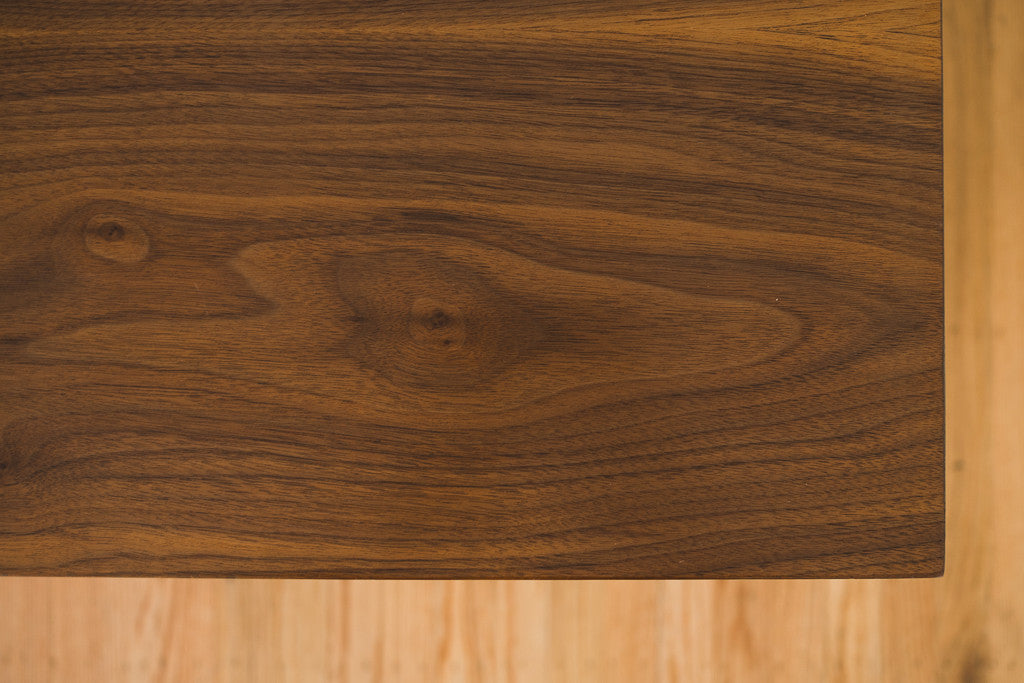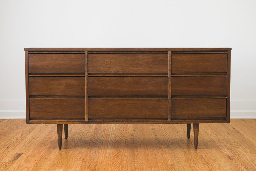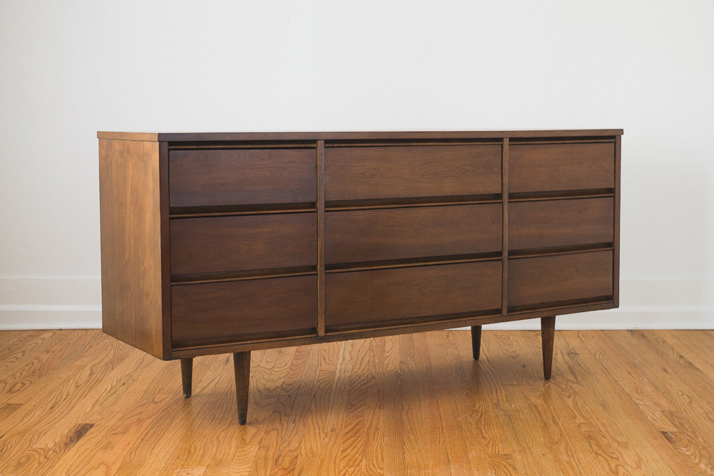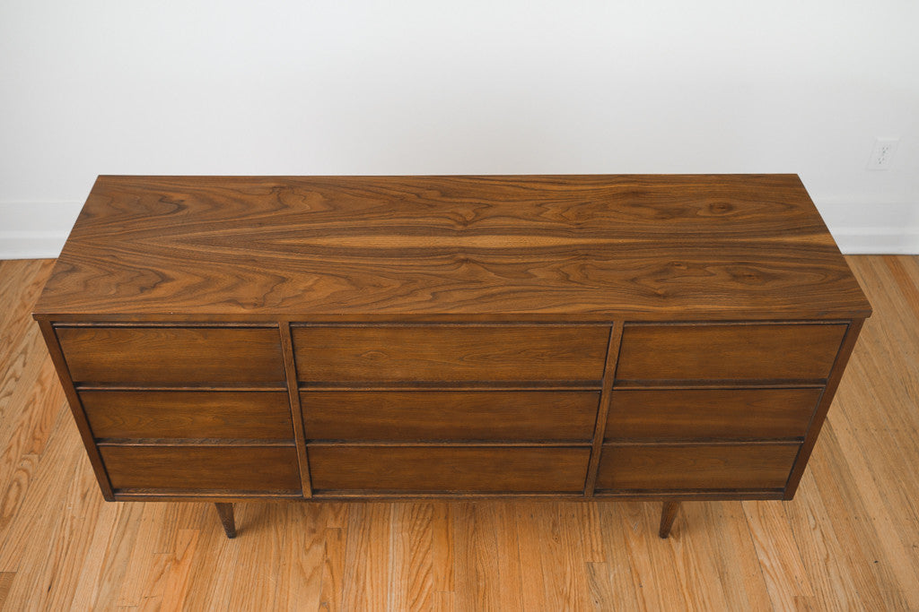 This Mid Century walnut nine drawer lowboy dresser was manufactured in the US by Ward. It has recessed pulls and a wood top. It's in good shape with age related wear and could also be used as a sideboard, buffet or credenza. See pictures for detailed condition.