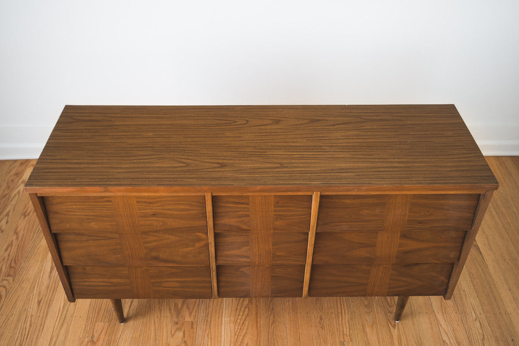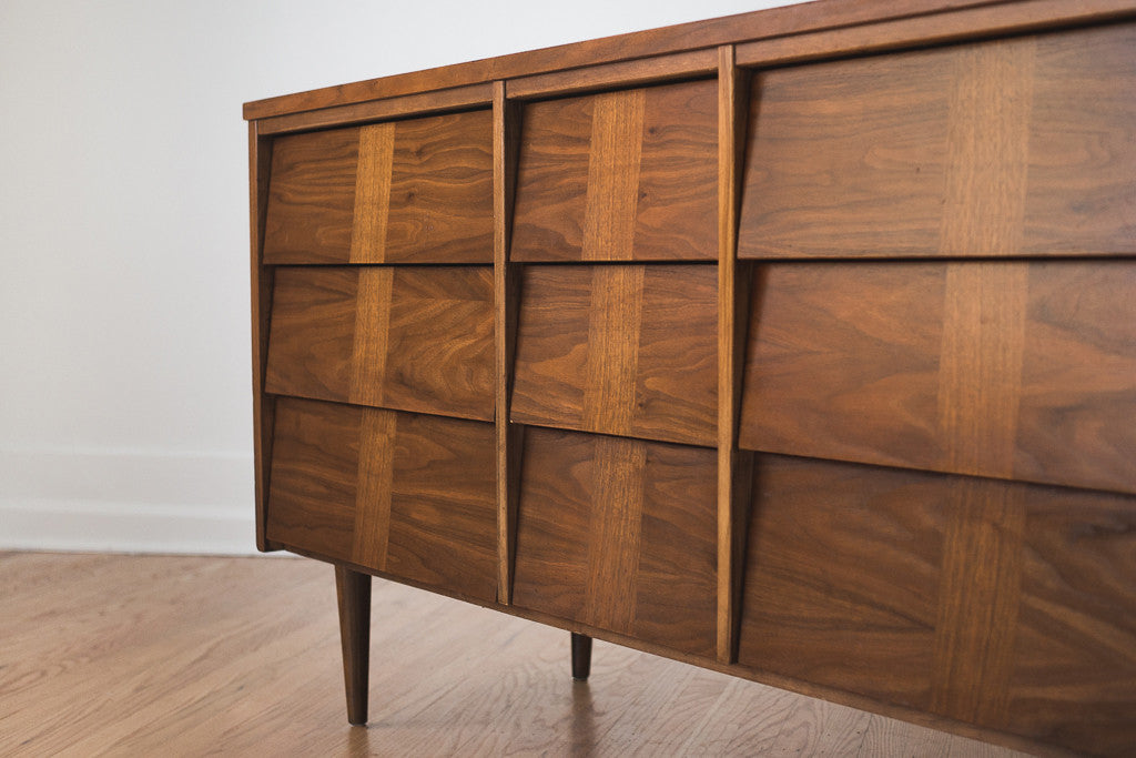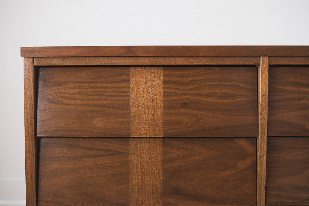This Mid Century walnut nine drawer lowboy dresser was manufactured in the US by Ward. It has a step front with recessed pulls and a solid surface wood grain top. It's in good shape with age related wear and could also be used as a sideboard, buffet or credenza. See pictures for detailed condition.