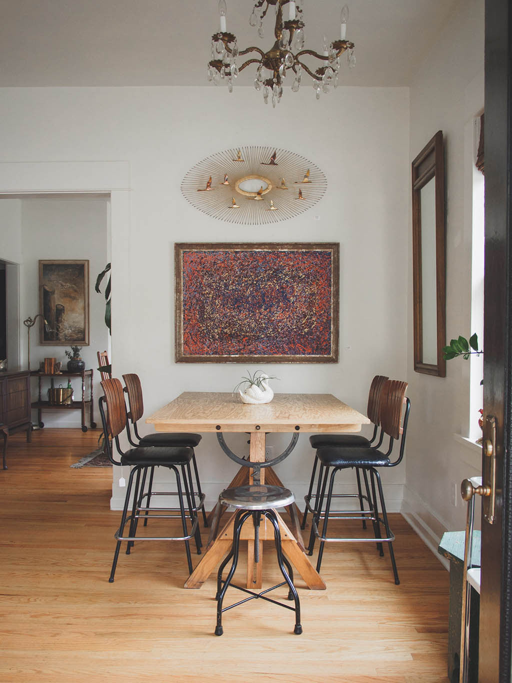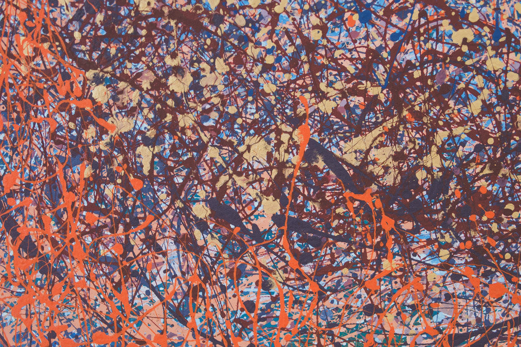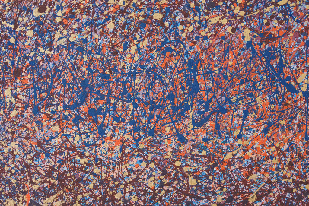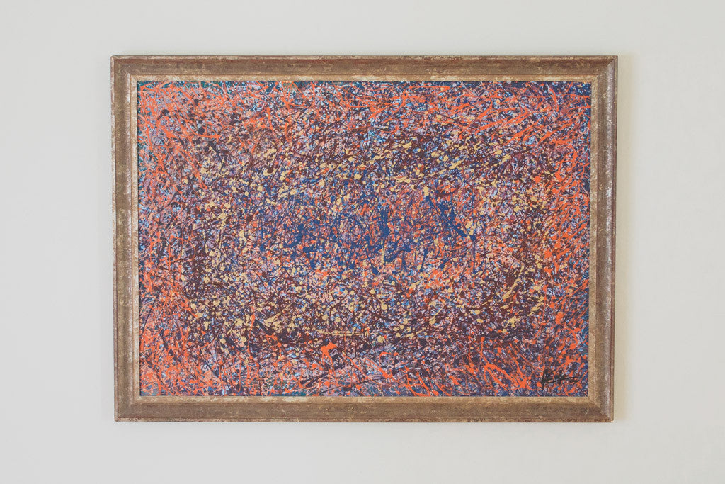 This vintage Mid Century abstract painting was made in the style of Jackson Pollock and signed what appears to be "A Enehe 64". It has shades of red-orange, blue, gold, purple, burgundy, teal, pink and light blue oil paint and a gold wood frame. It's in good shape with age related wear. Please see pictures for detailed condition.