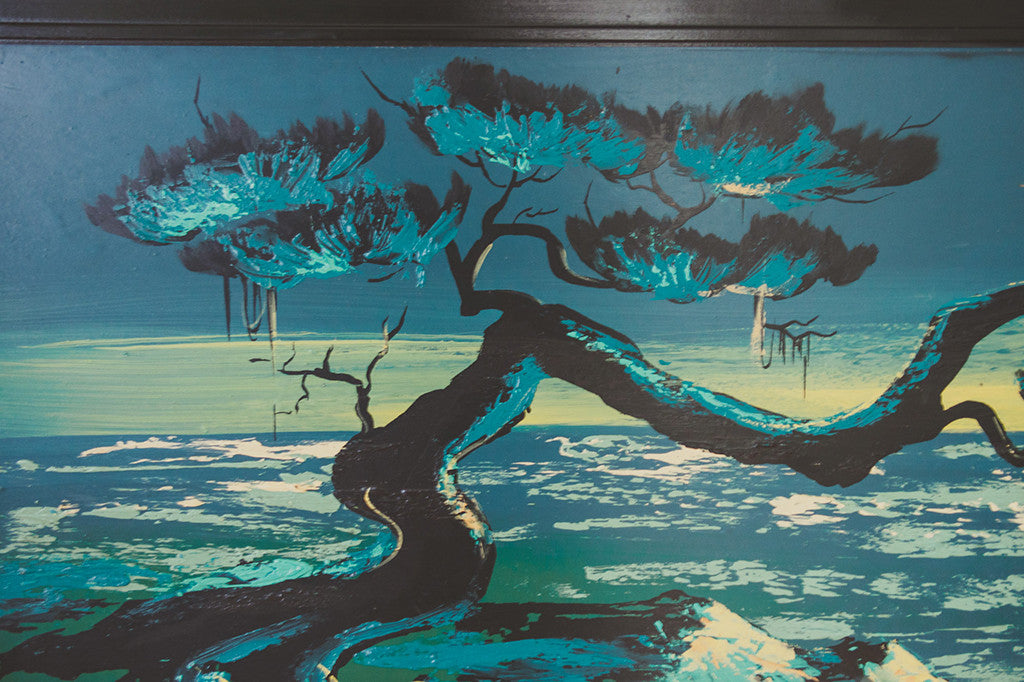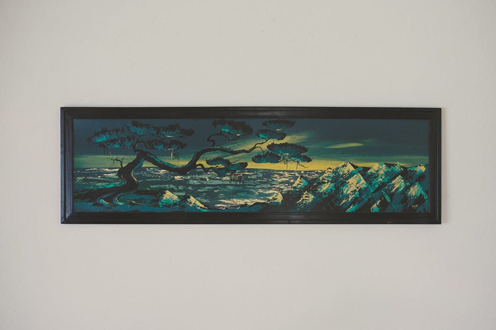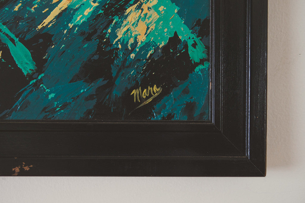 style: Mid Century, ocean, mountain, landscape, Asian material: wood frame, paint, board text: Mara age: vintage condition: good, age related wear - see pictures