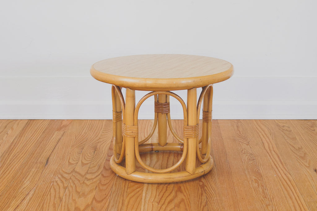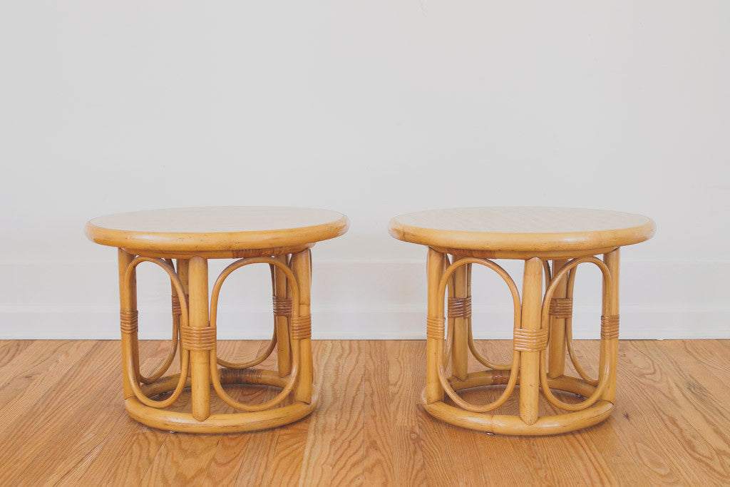 These vintage side tables have sturdy bamboo frames and round solid surface wood-grain tops. They're in good shape with light age related wear. Price is for the pair. Please see pictures for detailed condition.