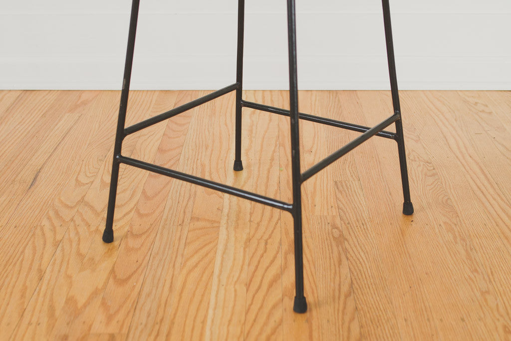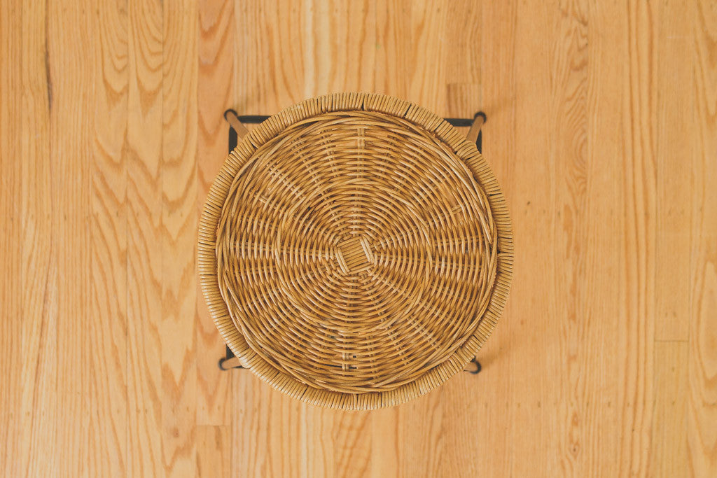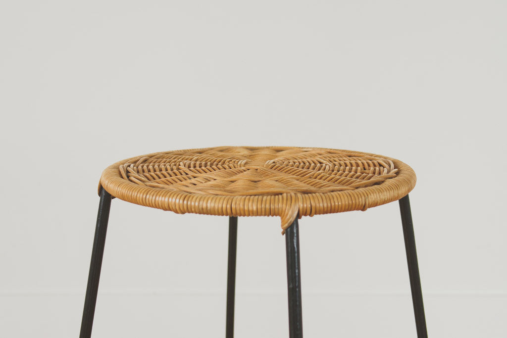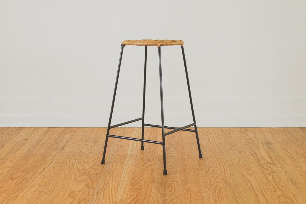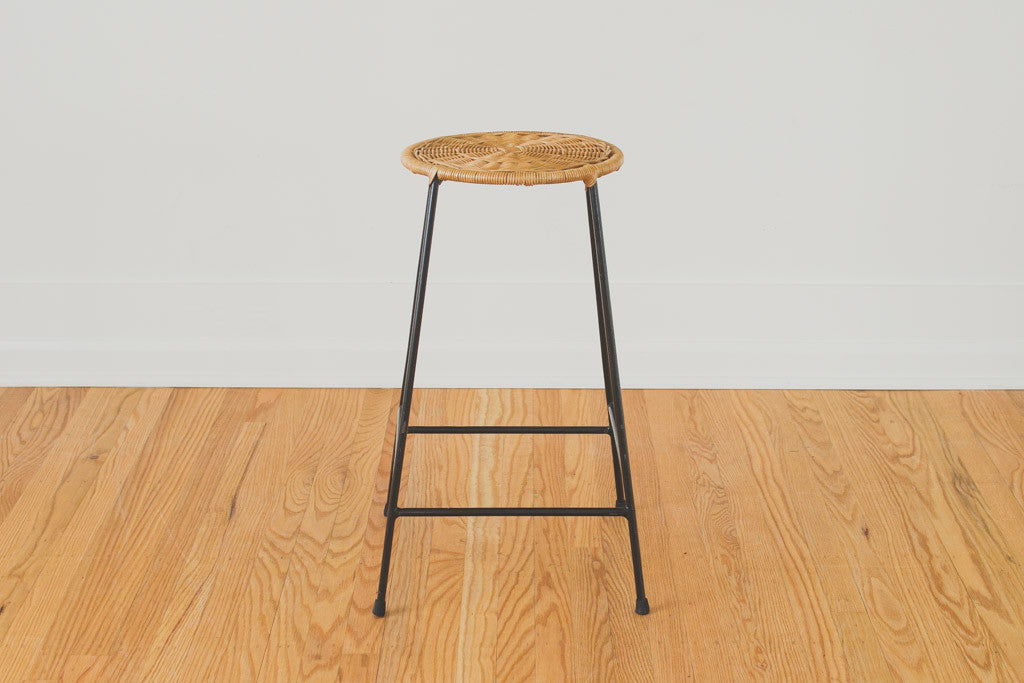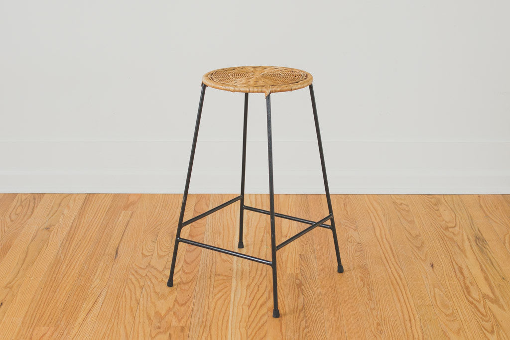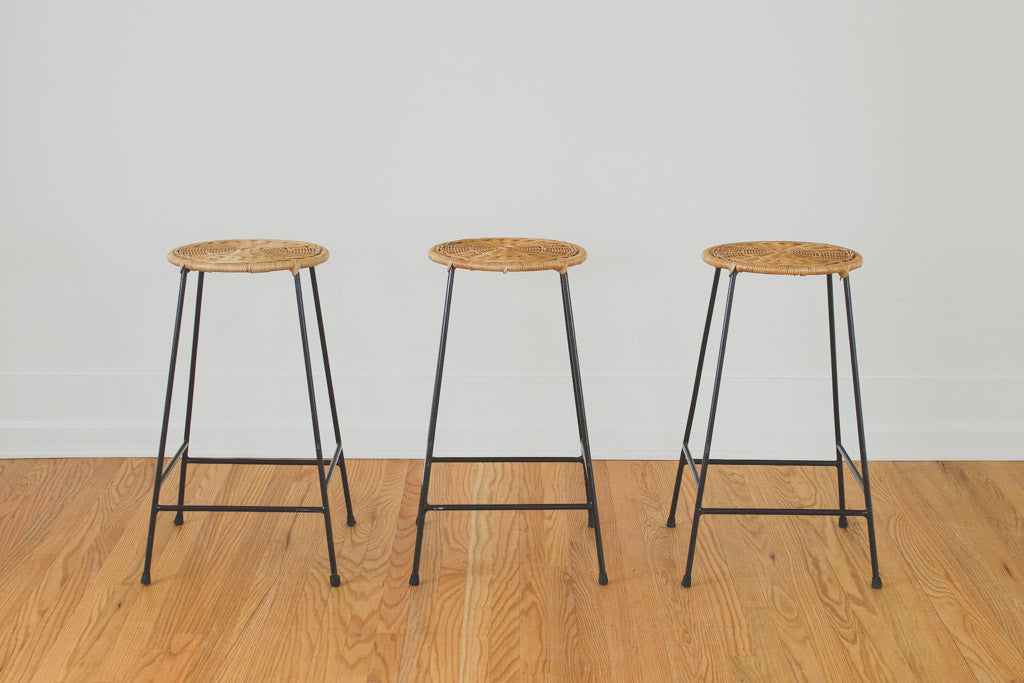 These three Mid Century bar stools have black metal frames with footrests and circular wicker tops. They're sturdy and in good shape with light age related wear. Please see pictures for detailed condition.