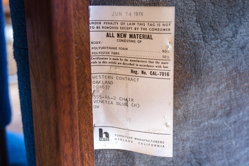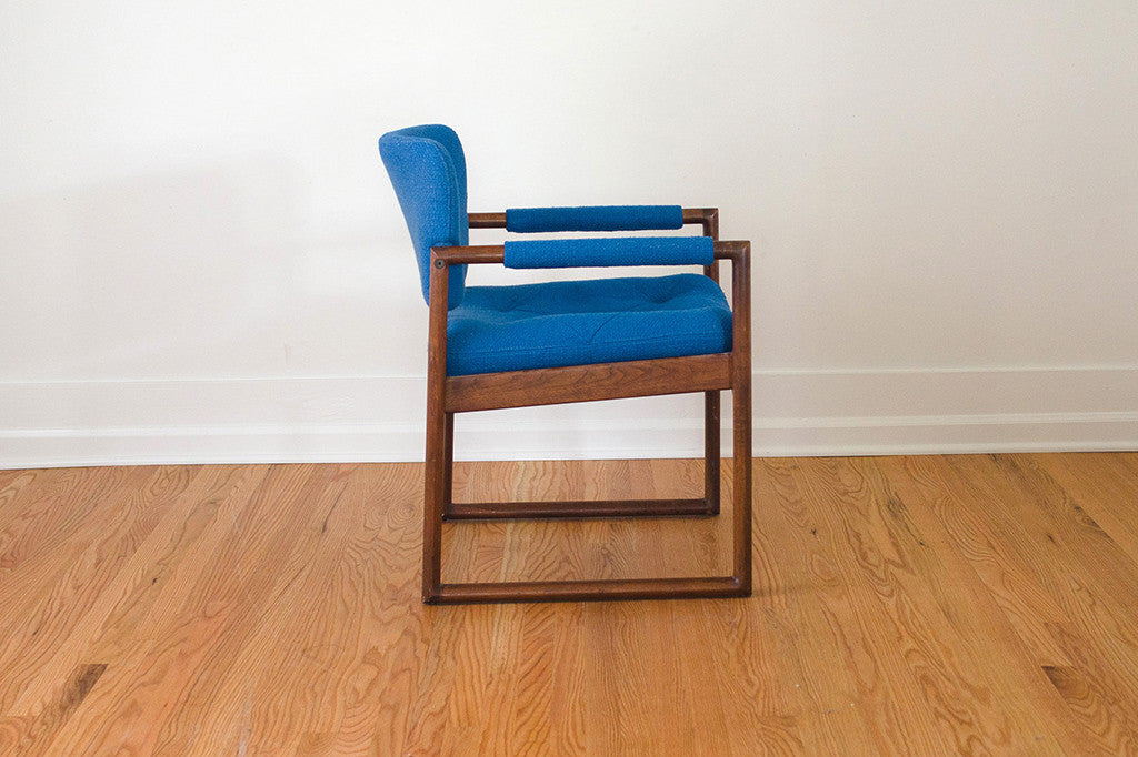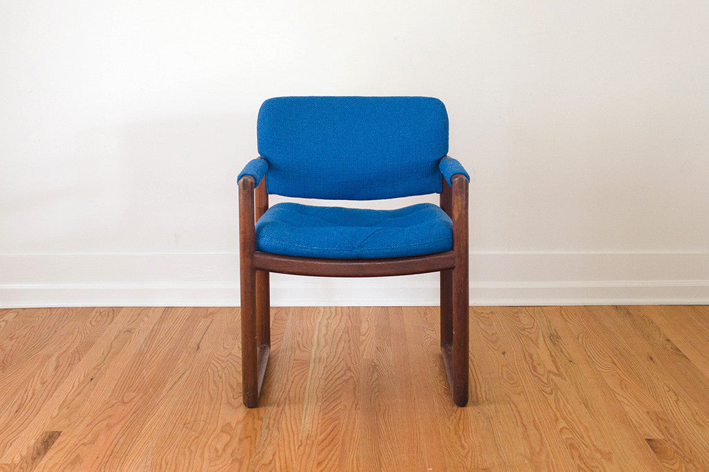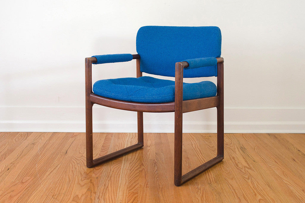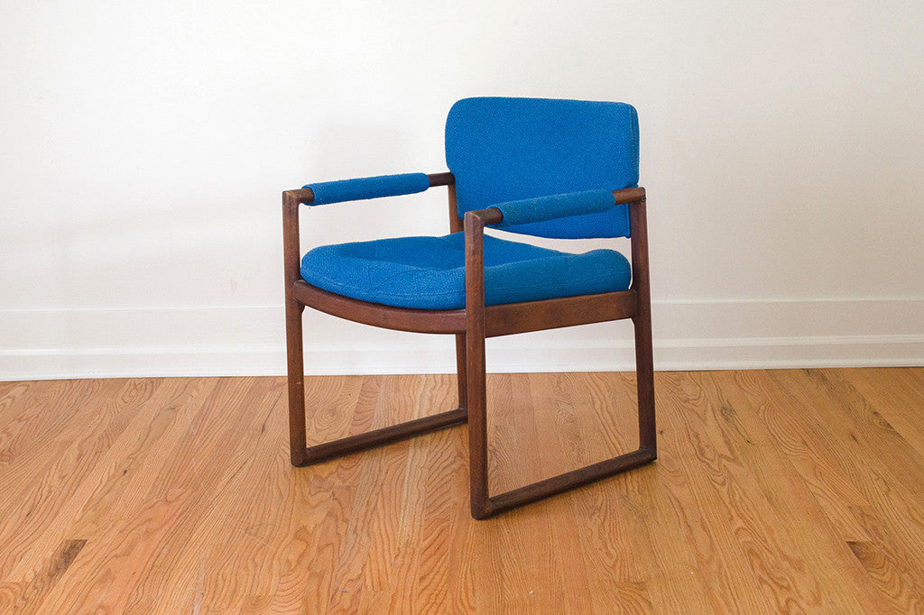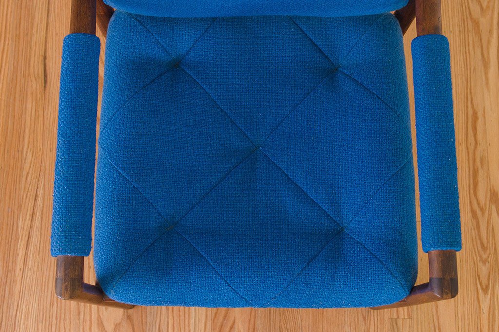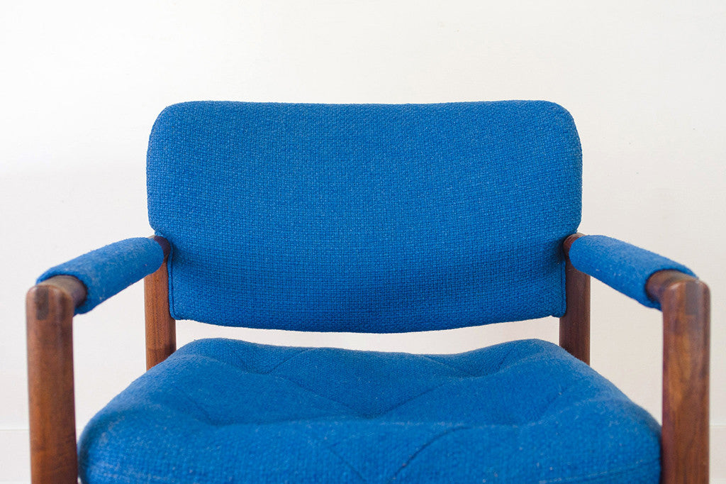 upholstered in an awesome bright blue tweed fabric. It has a teak wood
