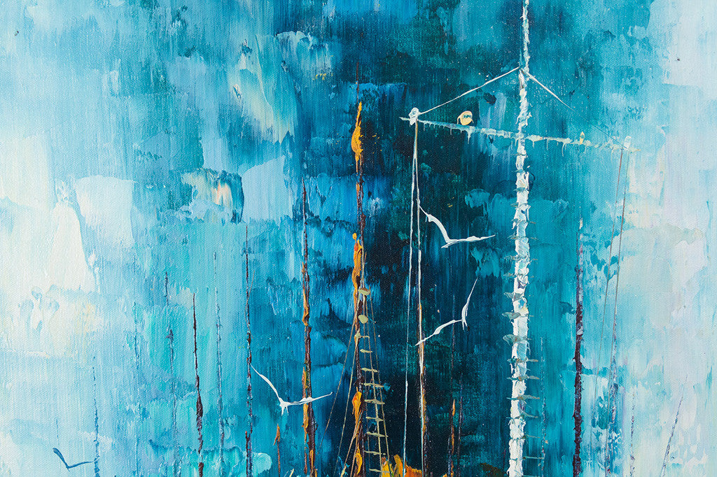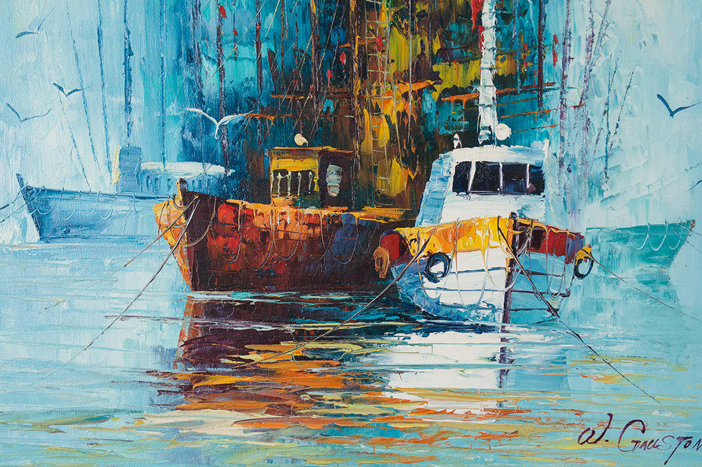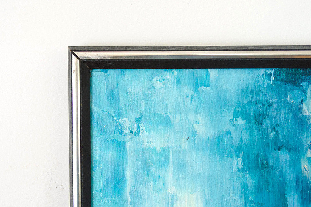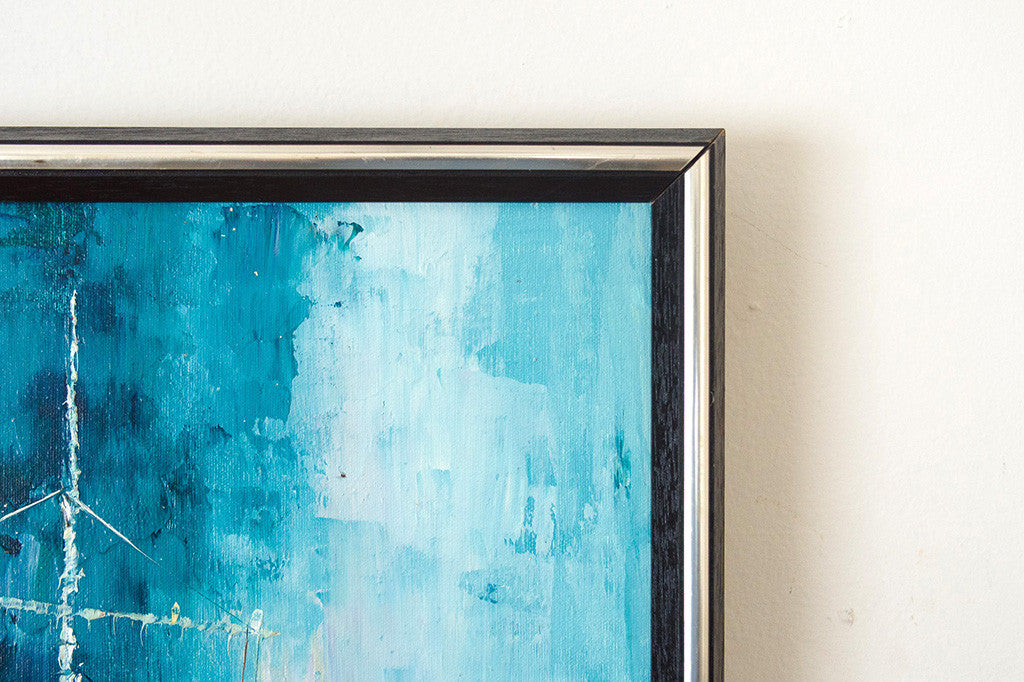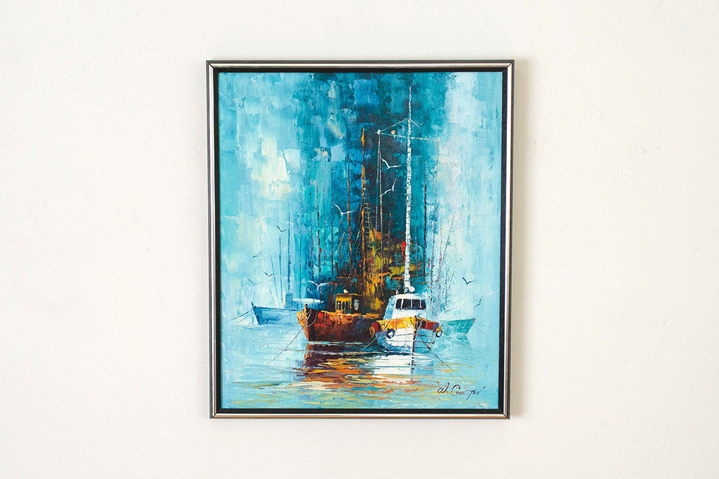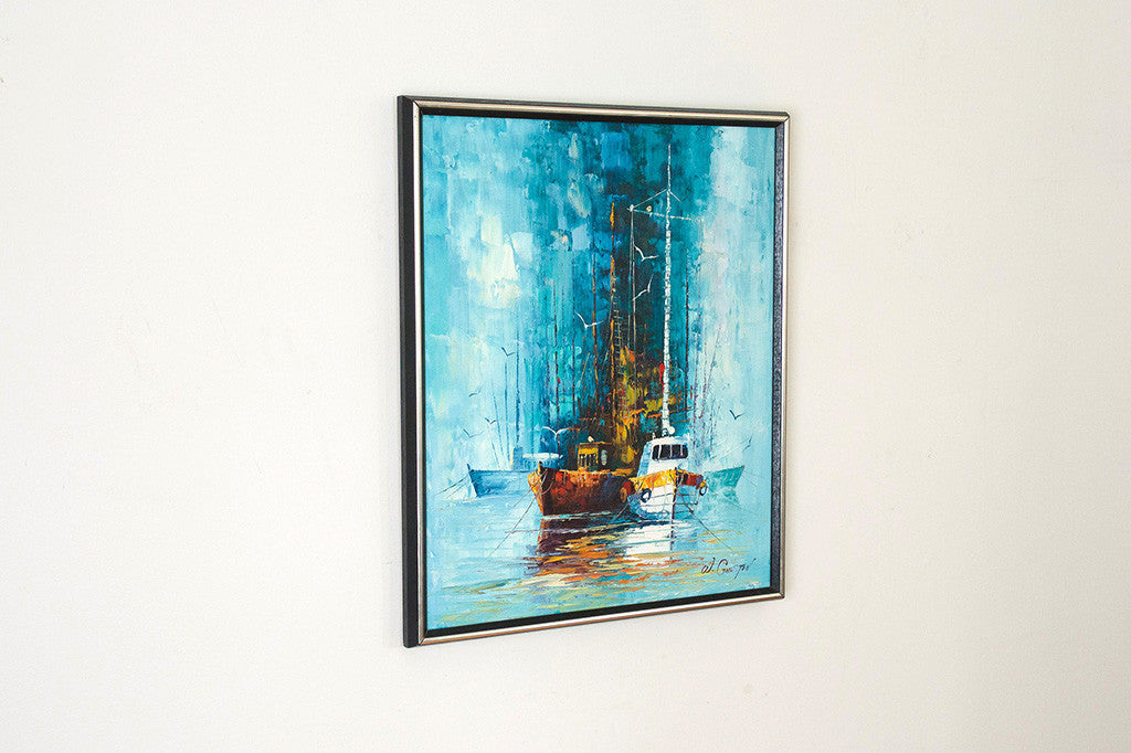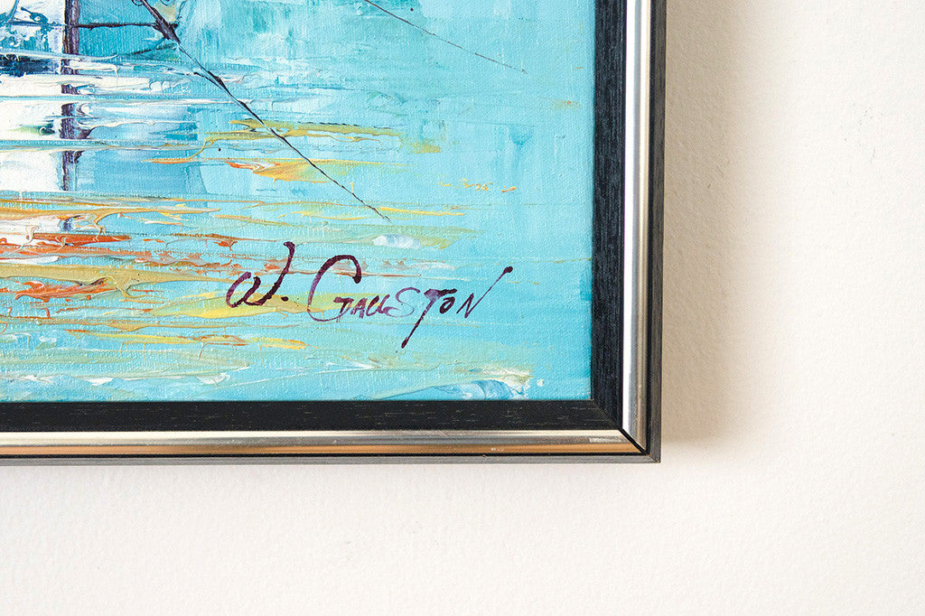 This medium-sized framed vintage painting is signed, "W. Gauston". It has a black and chrome frame and features an orange and white boat on a bright blue background. It's in great overall shape and is ready to hang. Please see pictures for detailed condition of this piece.