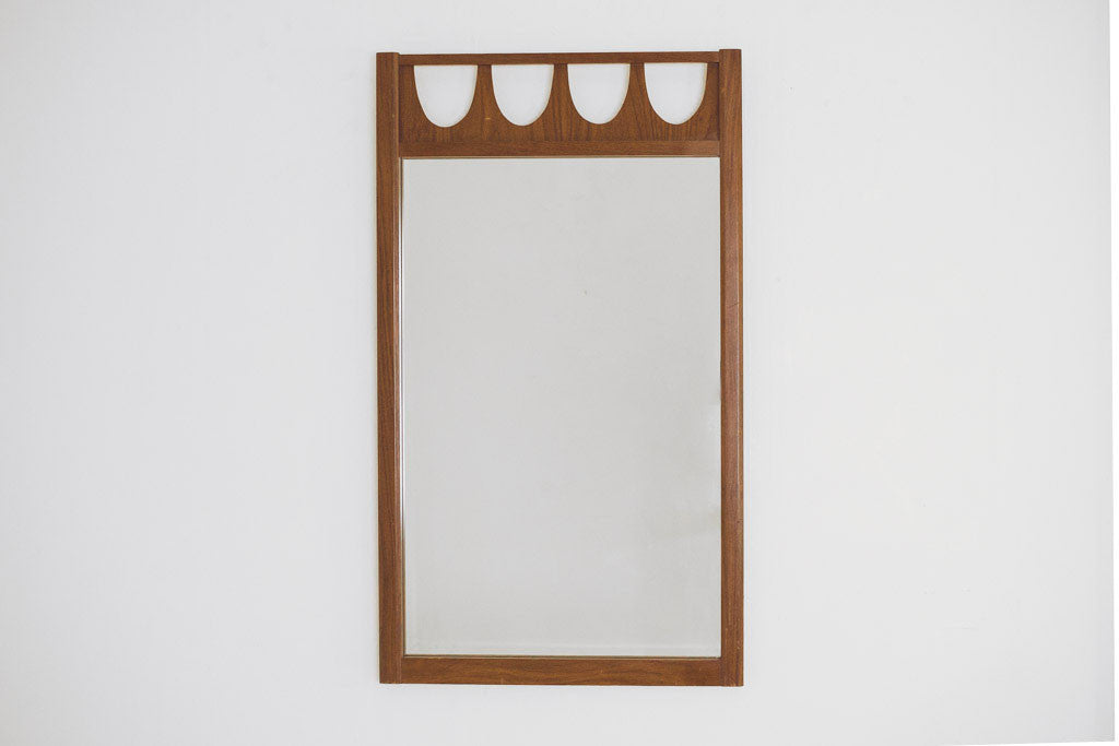 This vintage Broyhill Brasilia style mirror has a craved walnut frame. It's in great shape and would be a nice addition over a bathroom vanity, dresser or in an entryway. See pictures for detailed condition.
