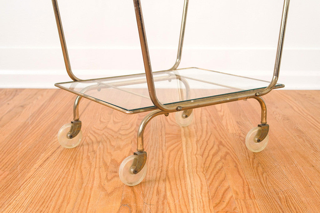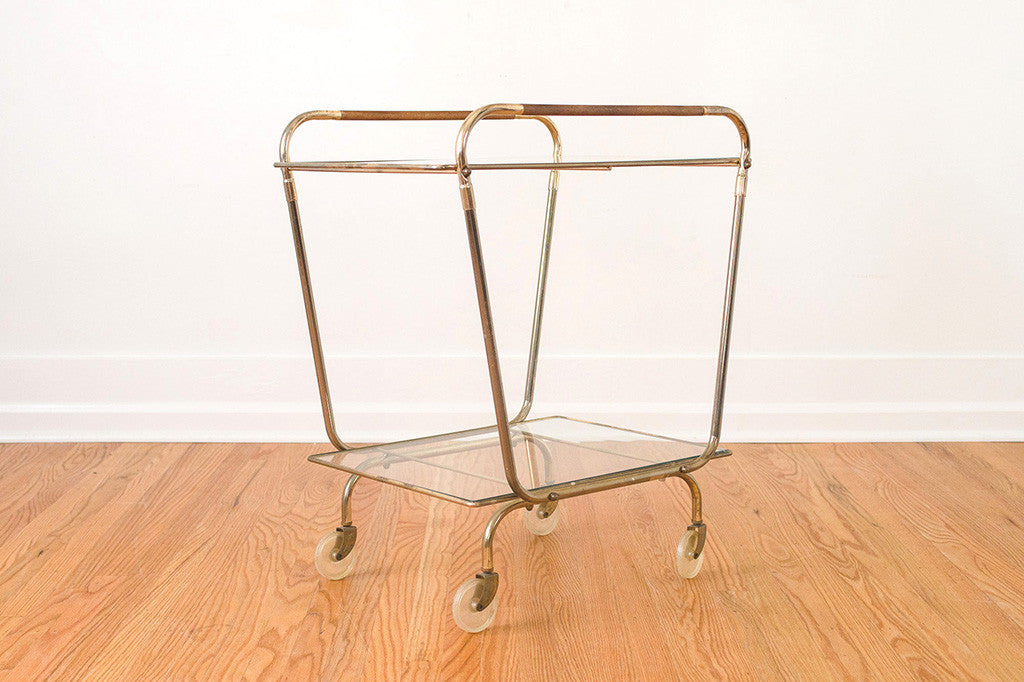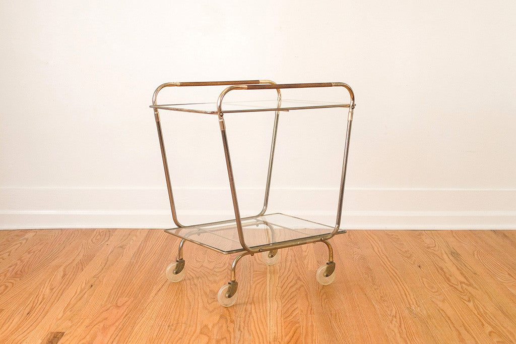 This Mid Century bar cart has a brass frame with walnut handles and two glass shelves. It's in great shape and would look good with a variety of decorating styles. Please see pictures for detailed condition of this piece.