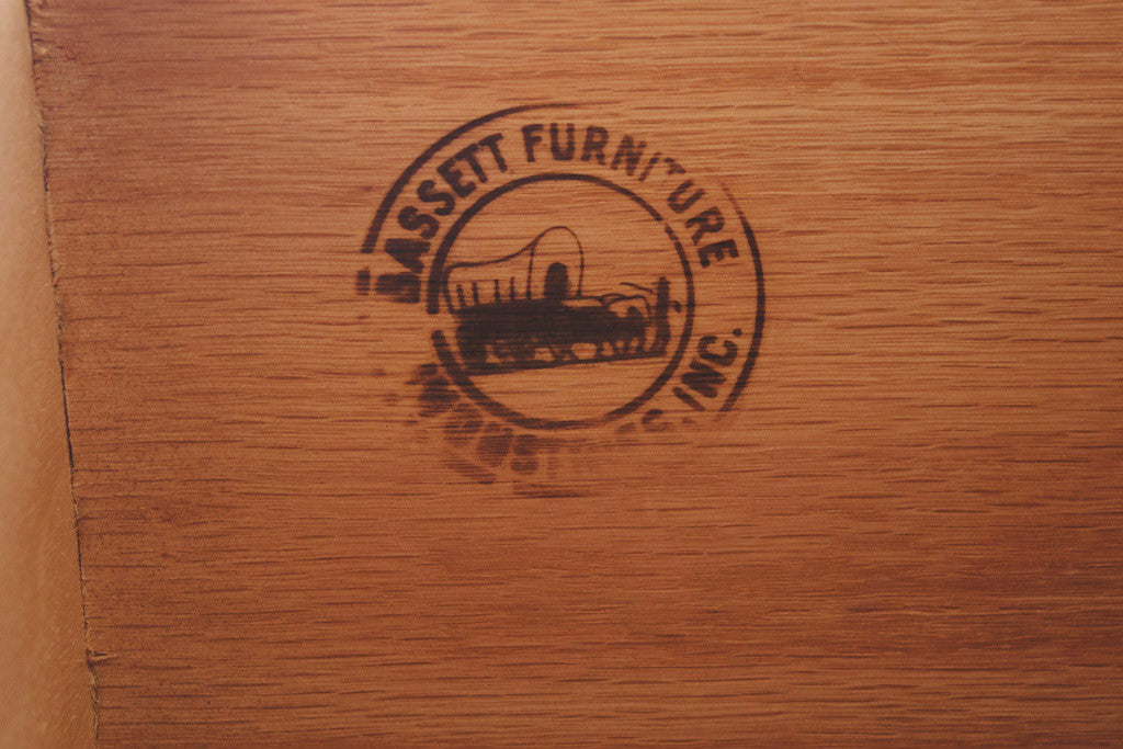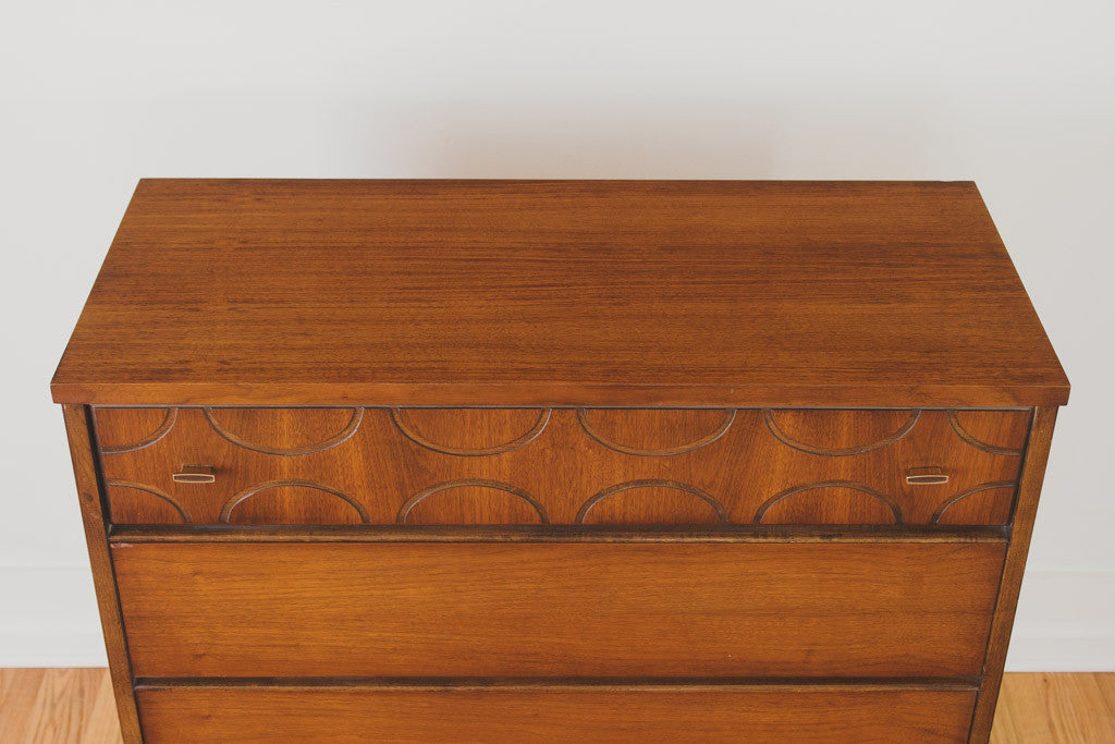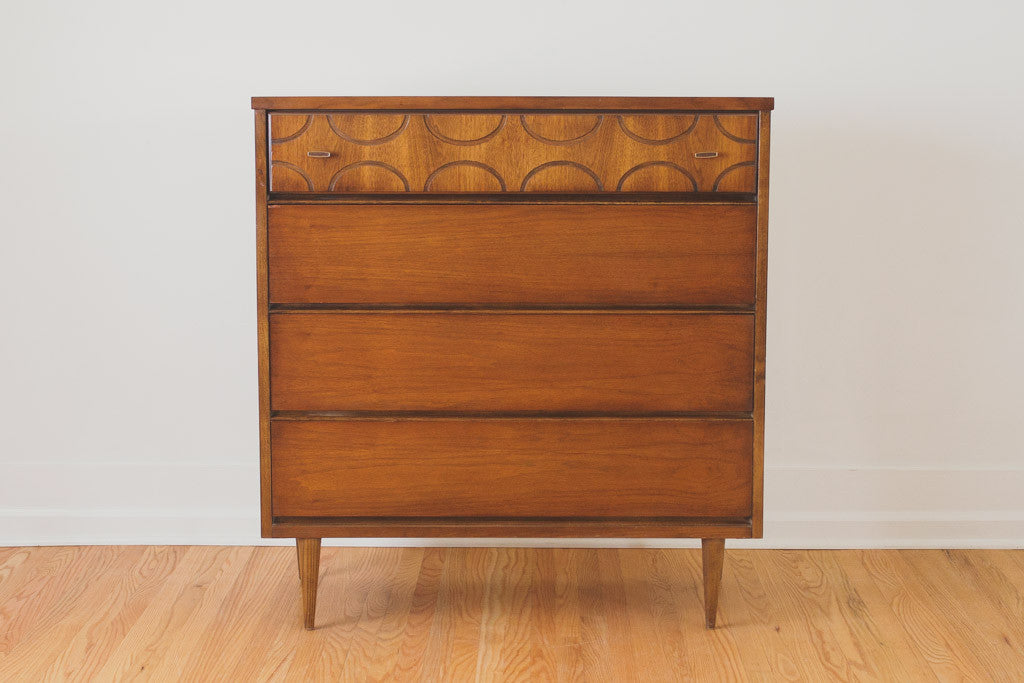 This Mid Century walnut four drawer highboy dresser has brass pulls, carved wood details, peg legs and a wood top. It's in great shape with some age related wear. Please see pictures for detailed condition.