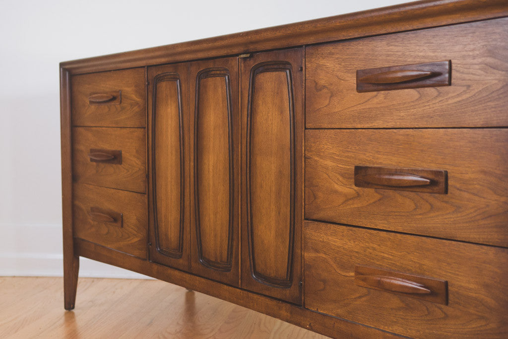 This Mid Century walnut credenza was made by Broyhill as part of their Emphasis line. It has a carved pulls, a wood top and is in good shape with age related wear. It could also be used as a sideboard, buffet or dresser. See pictures for detailed condition.