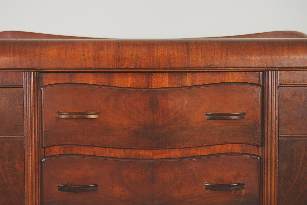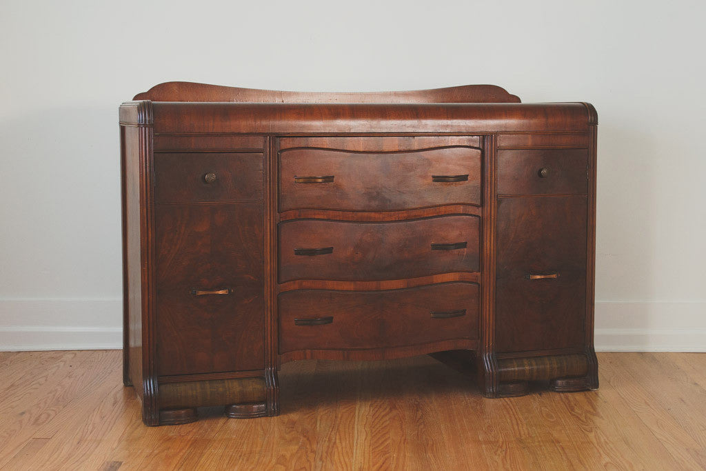 This vintage Art Deco credenza has three drawers, open shelving behind french doors and carved feet. It could also be used as a buffet, dresser or bar. It's in good shape with some age related wear. Please see pictures for detailed condition.