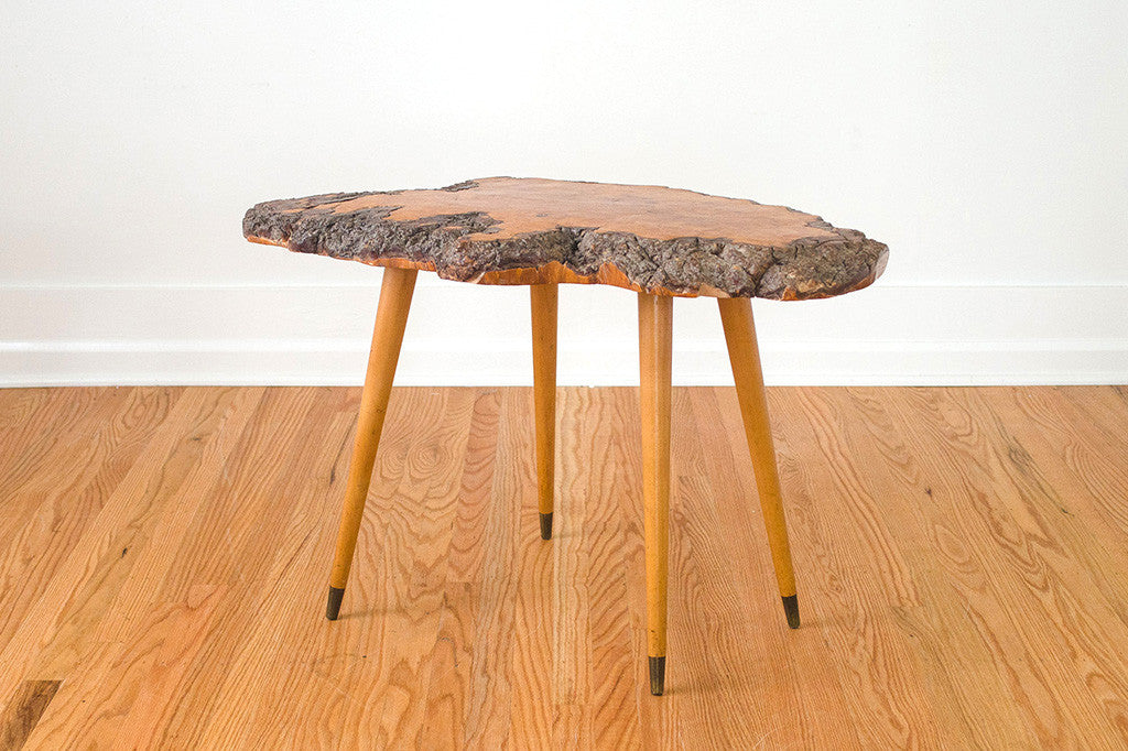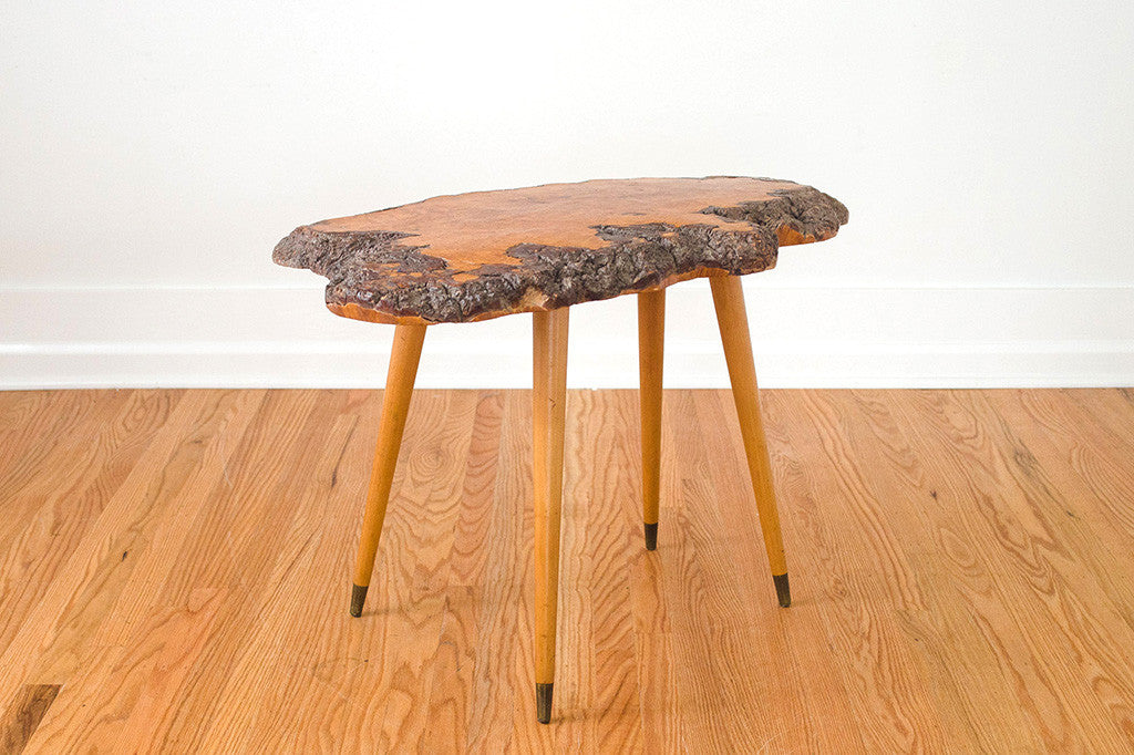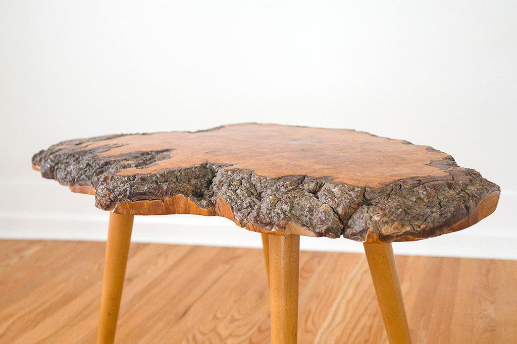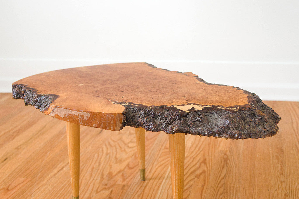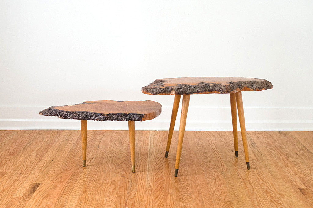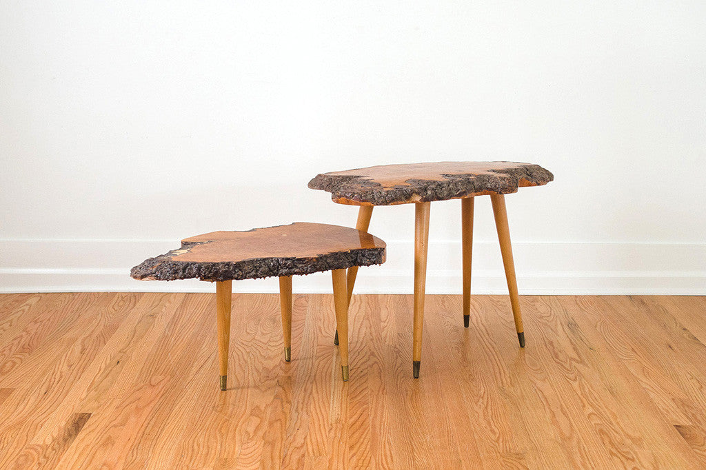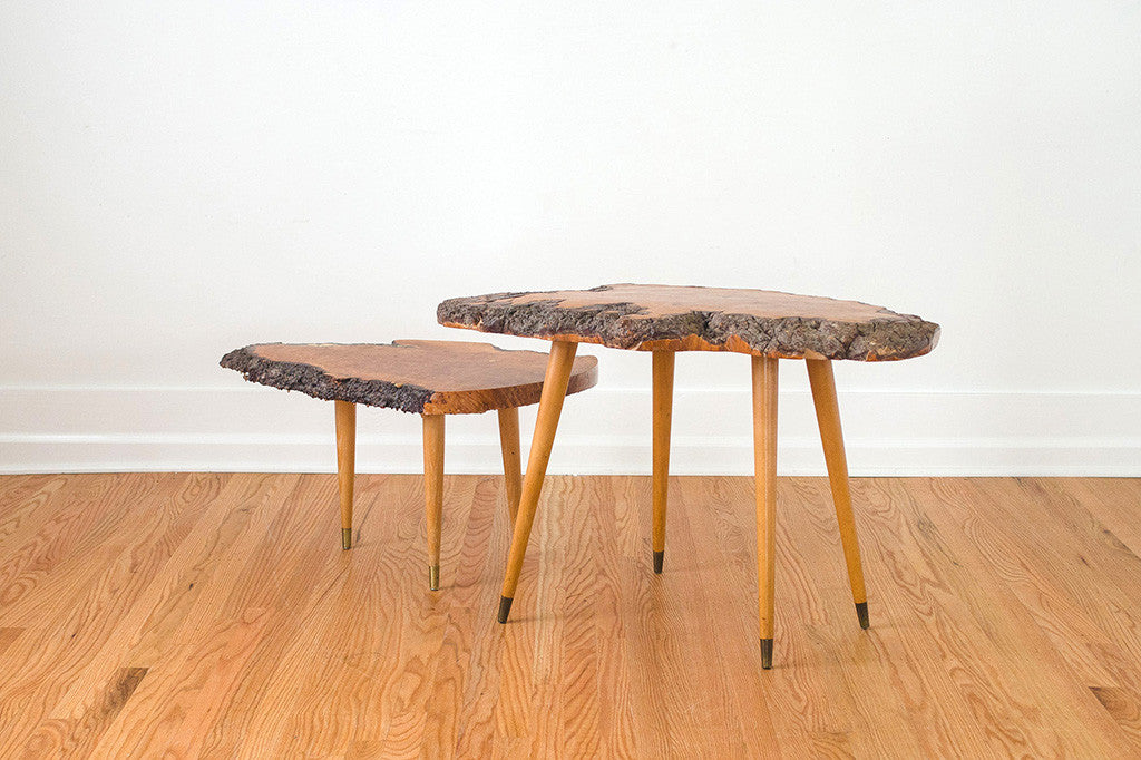 We have a really special set of live edge burlwood nesting tables in the shop. They have an oiled finish and peg leg base. They make perfect side tables, night stands or used together as a coffee table. This style of table works really well in both Mid Century and rustic spaces. Please see pictures for detailed condition of this piece.