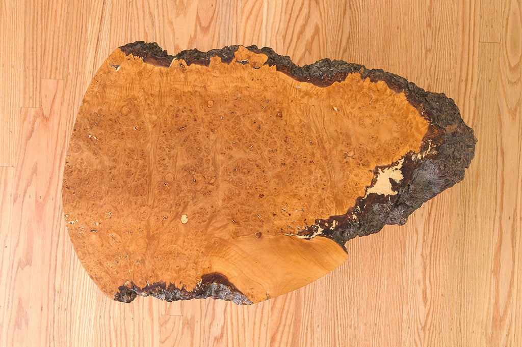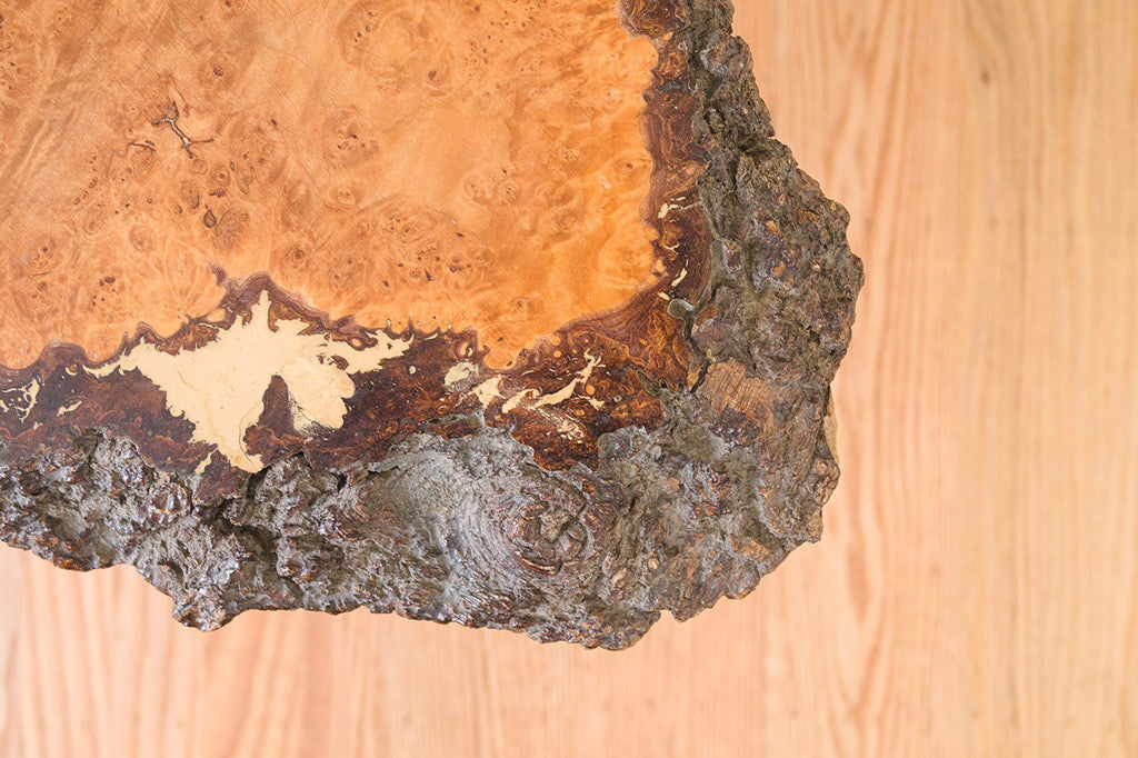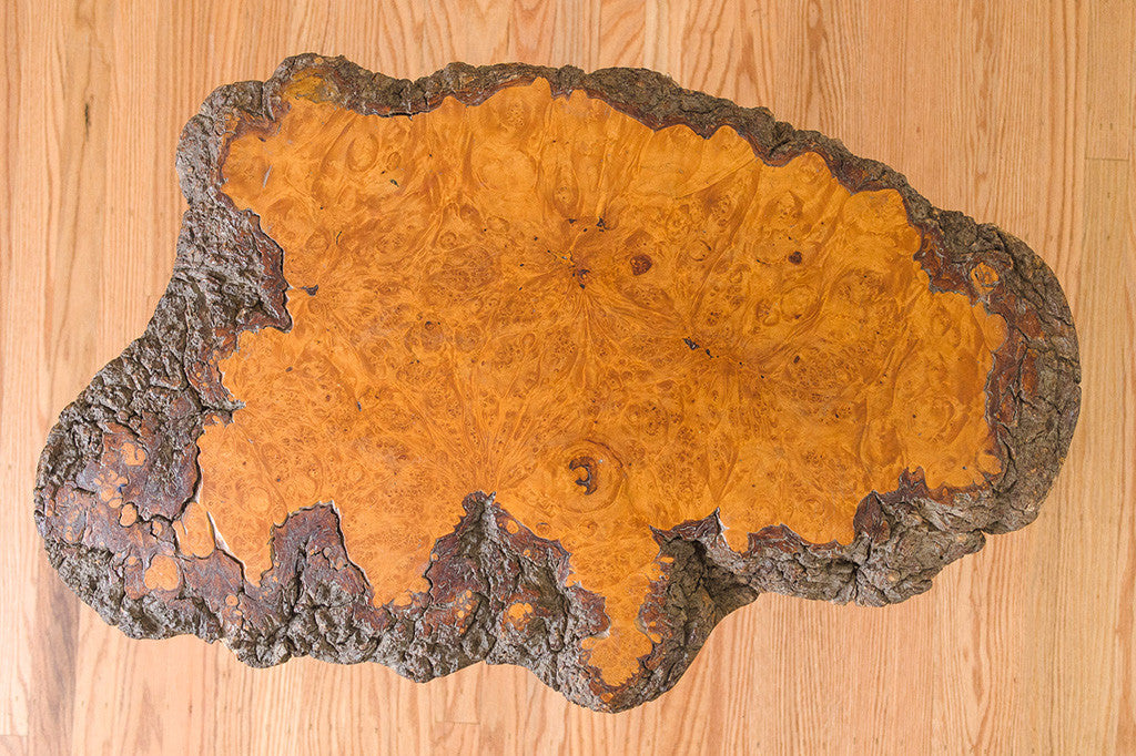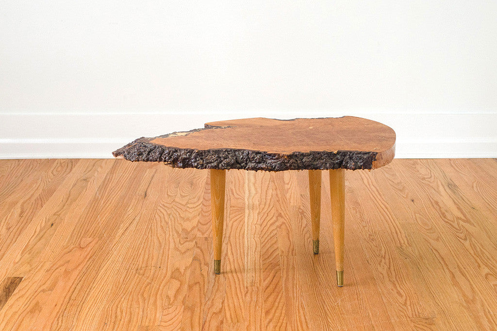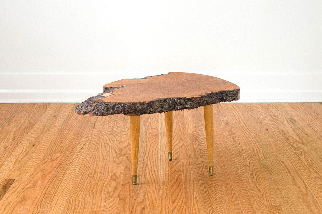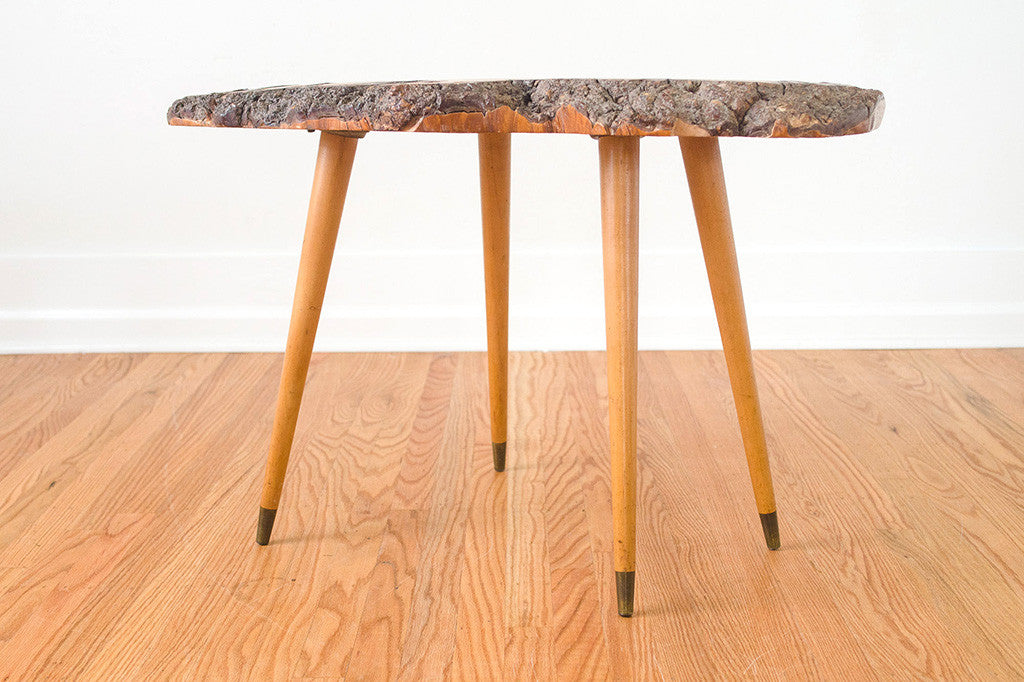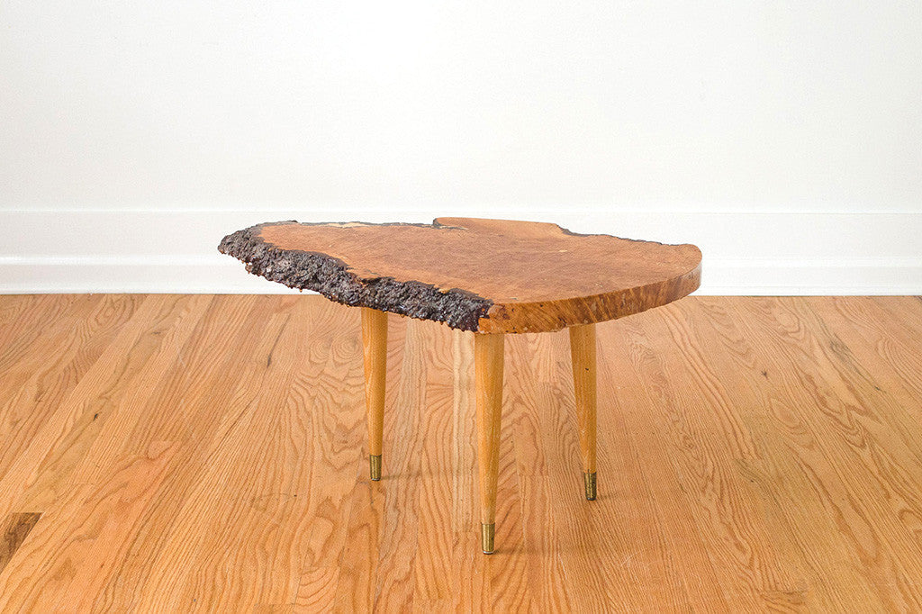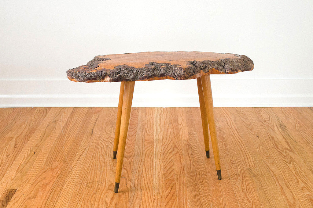 We have a really special set of live edge burlwood nesting tables in the shop. They have an oiled finish and peg leg base. They make perfect side tables, night stands or used together as a coffee table. This style of table works really well in both Mid Century and rustic spaces. Please see pictures for detailed condition of this piece.