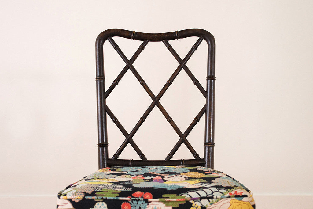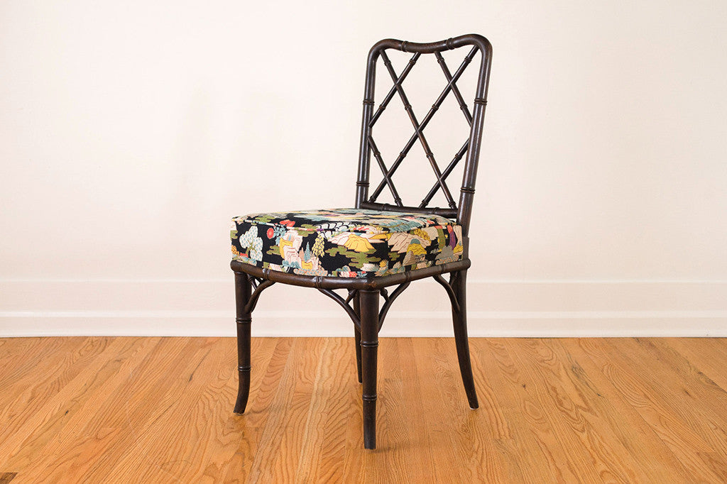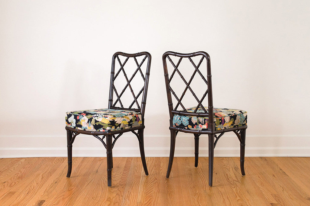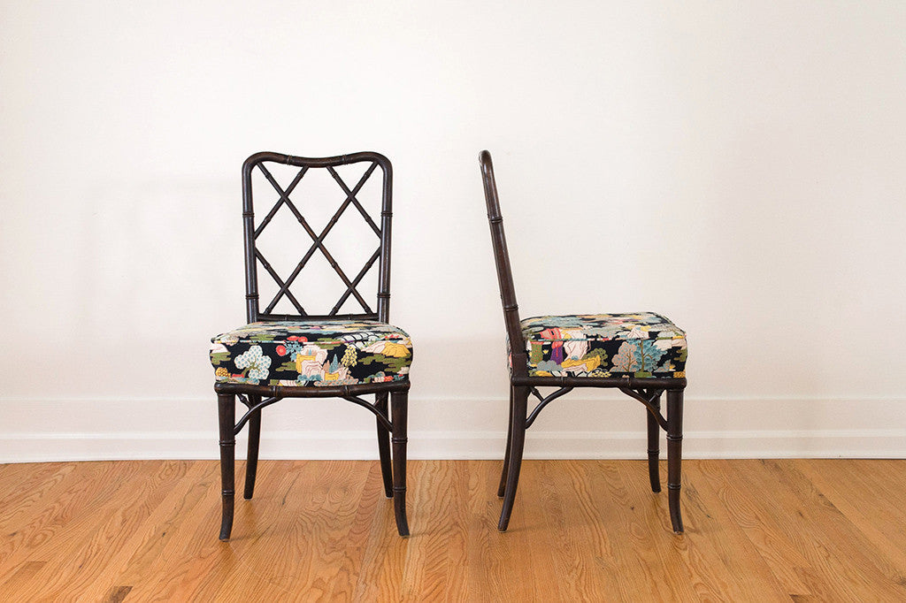 This pair of custom upholstered bamboo style chairs exceeded our expectations. They were upholstered in a colorful vintage bark cloth fabric. They have dark wood frames and new foam cushions. They are in great overall shape with some light wear to the frame and upholstery. The price is for the set.
