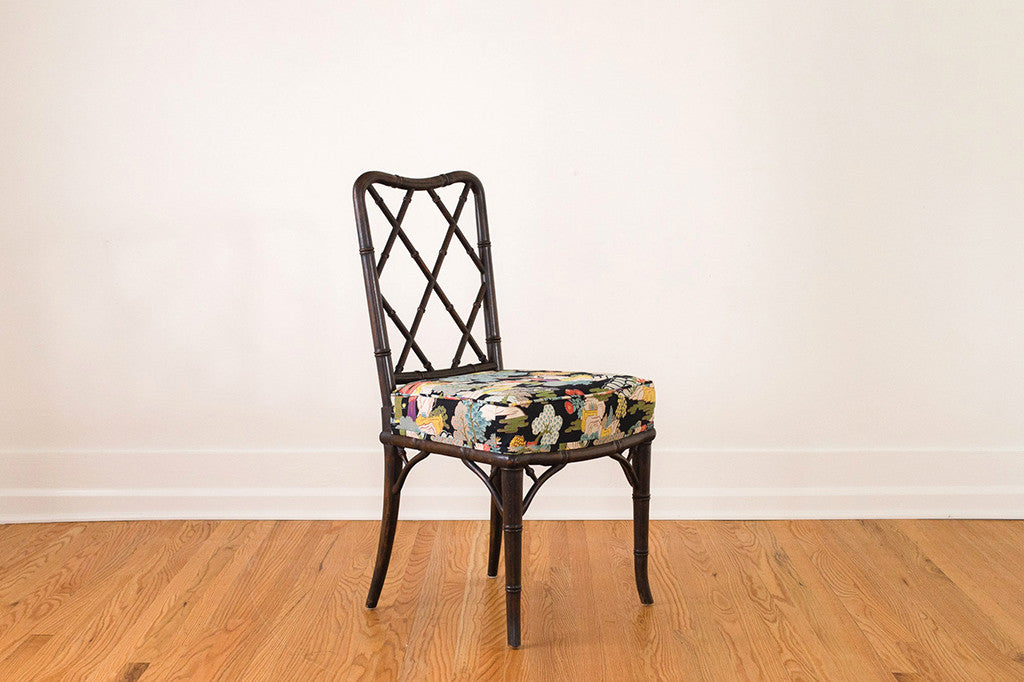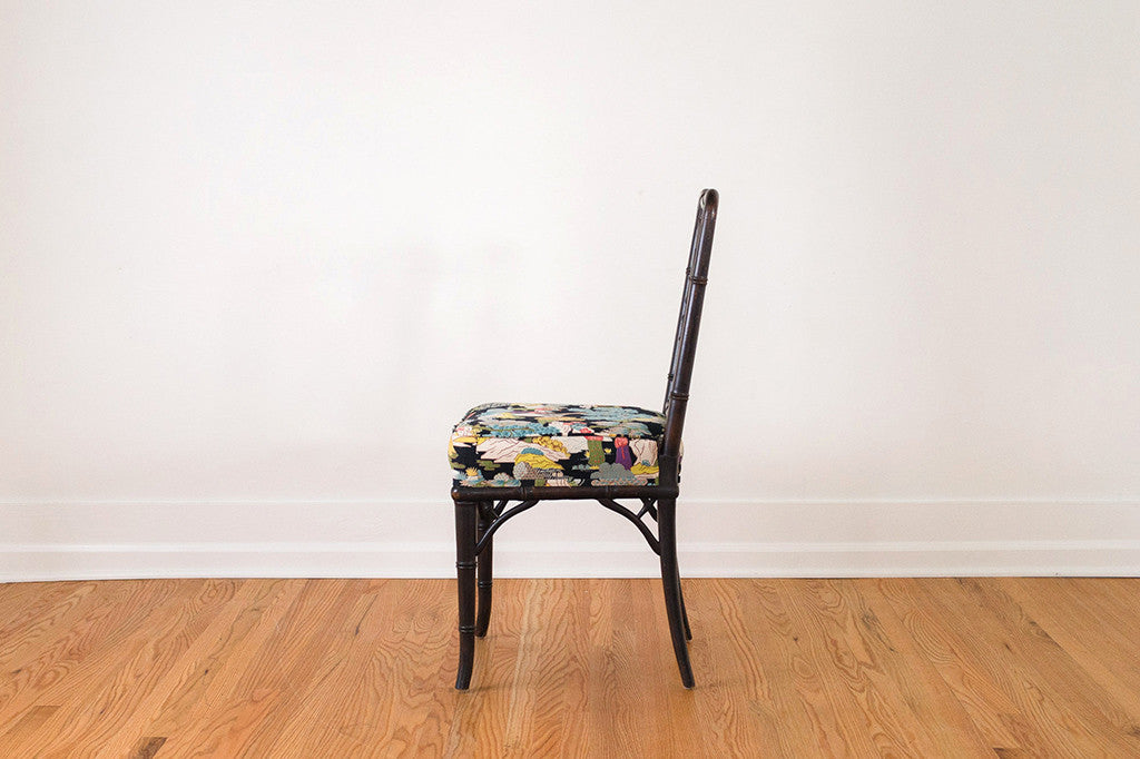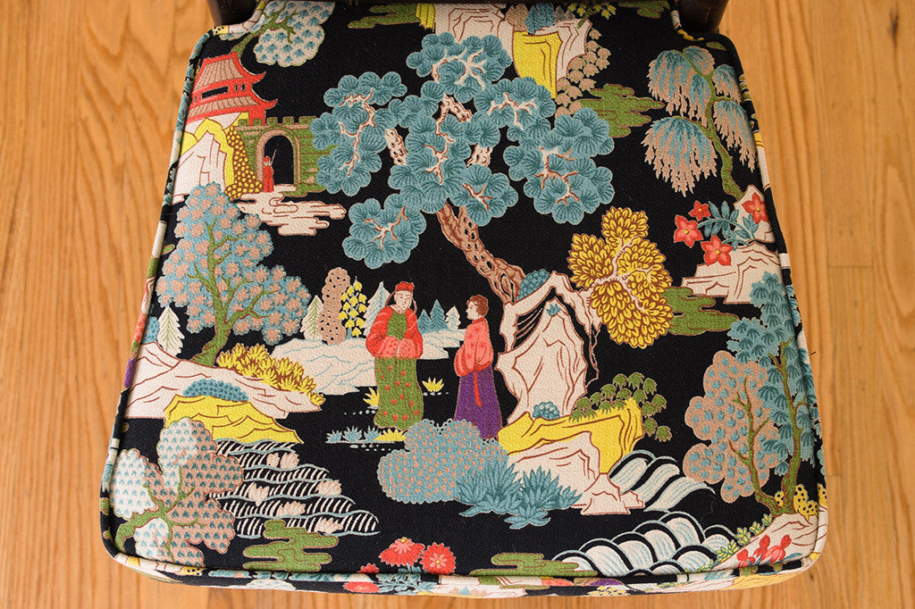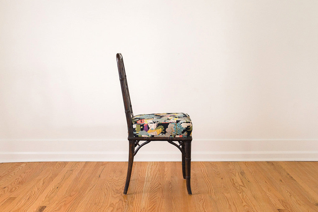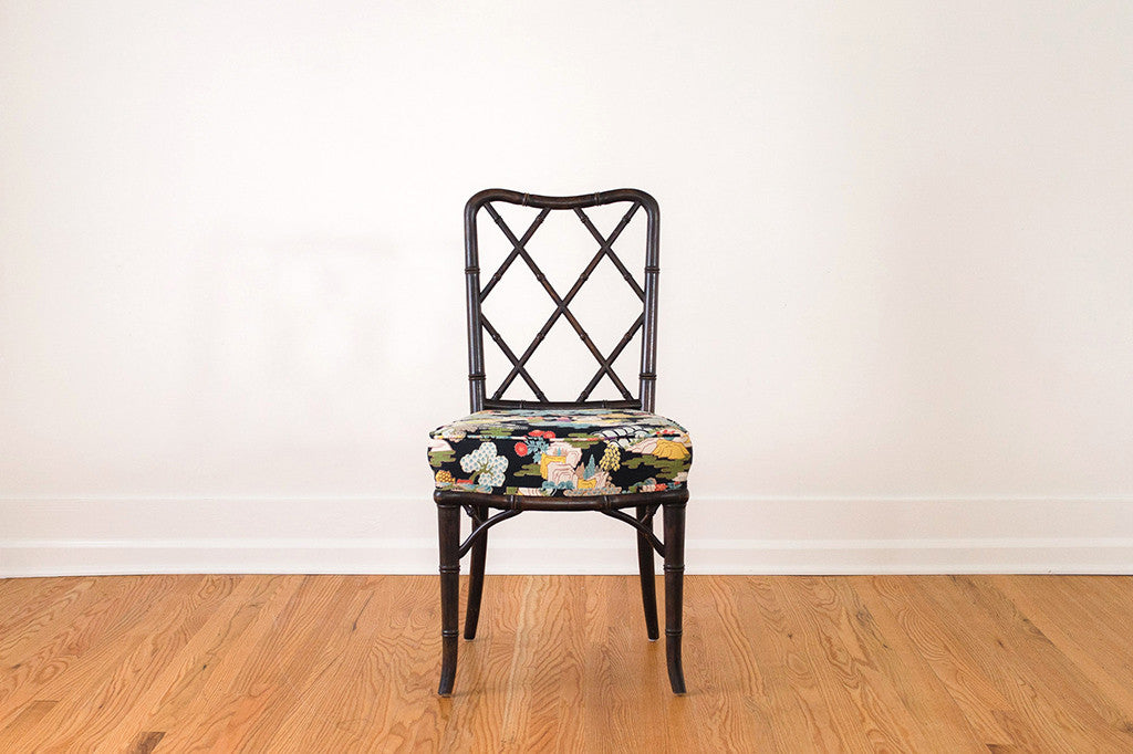 This pair of custom upholstered bamboo style chairs exceeded our expectations. They were upholstered in a colorful vintage bark cloth fabric. They have dark wood frames and new foam cushions. They are in great overall shape with some light wear to the frame and upholstery. The price is for the set.