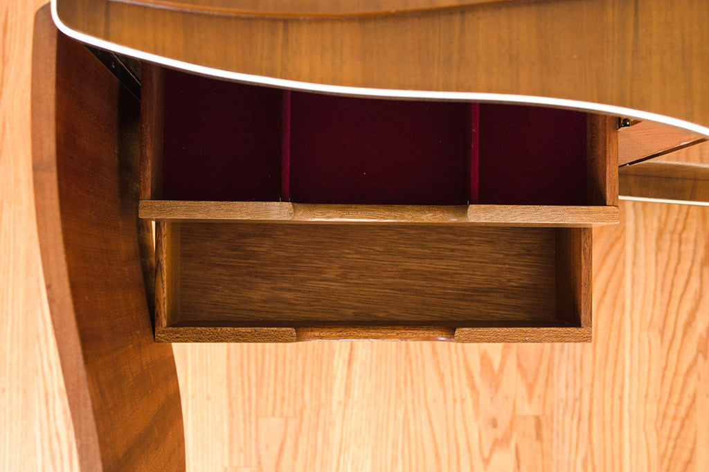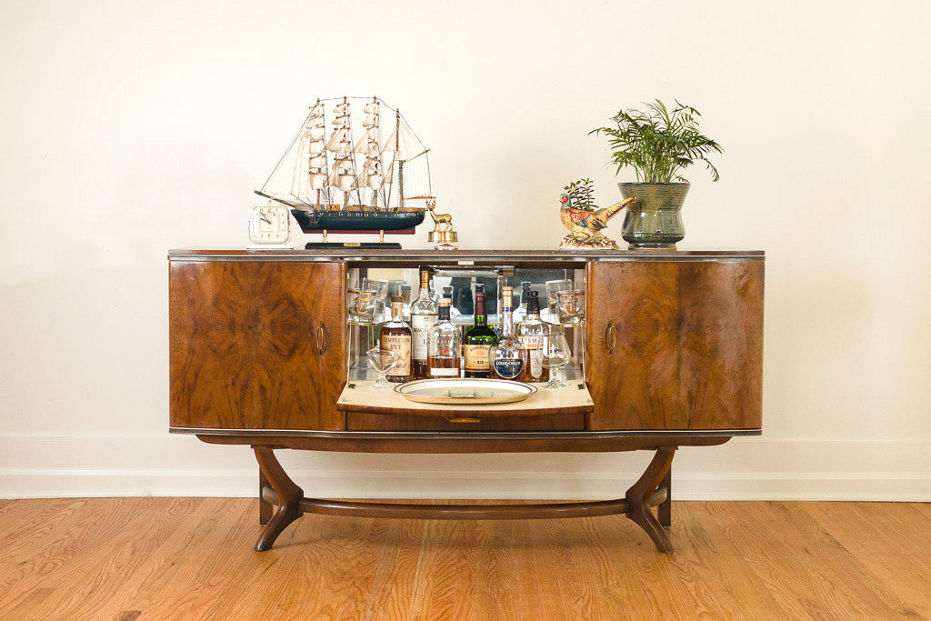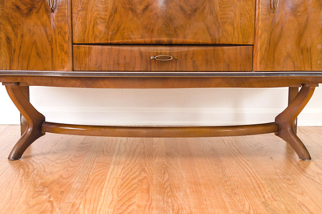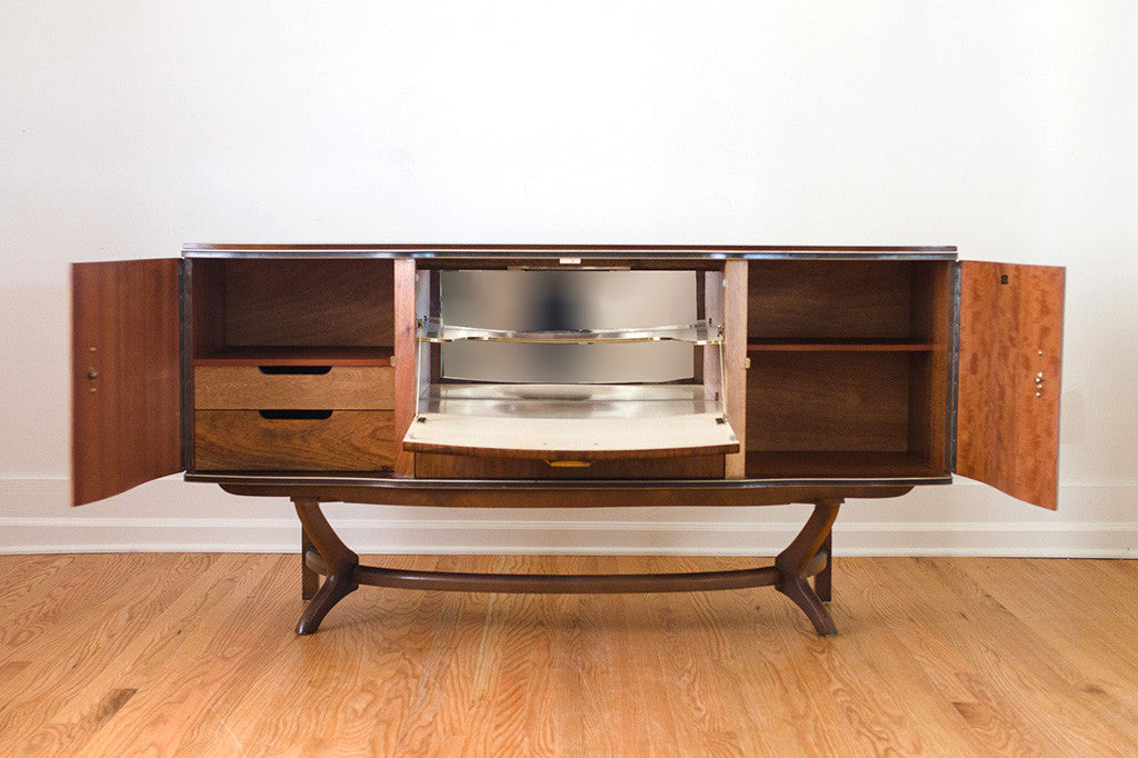 This vintage Mid Century bar cabinet was imported from England. It has a pull-down bar is in the middle with storage on either side and one long drawer under the bar. This piece has a solid wood top, brass handles and is in overall great shape with some age related wear. It would be a perfect credenza, sideboard or buffet in a dining room. Please see pictures for detailed condition of this piece.