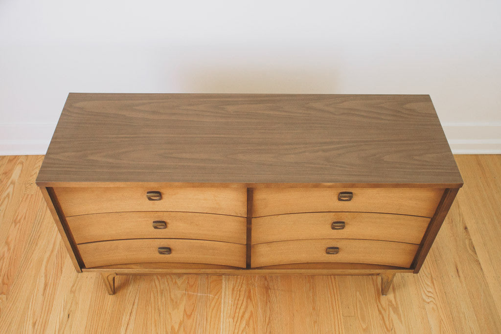 This Mid Century walnut lowboy dresser has six curved-front drawers with brass pulls and a solid surface woodgrain top. It's in good shape with age related wear and could also be used as a credenza, sideboard or buffet. See pictures for detailed condition.