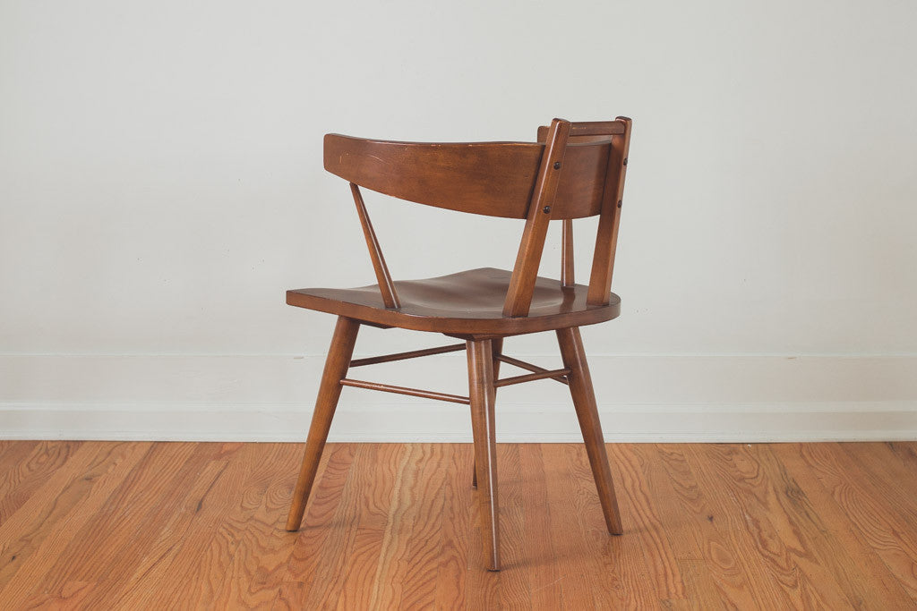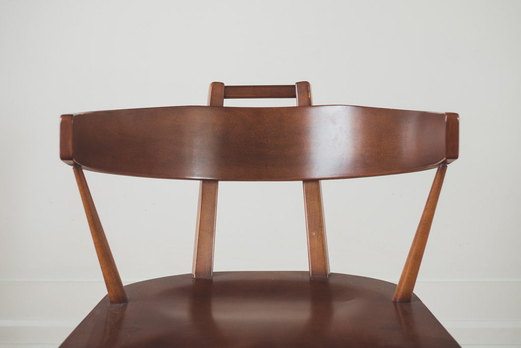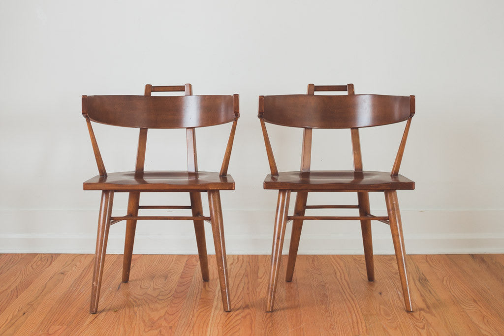 This pair of Mid Century chairs are unmarked but most likely a Russel Wright design. They have sturdy bentwood walnut frames with dowel details and handles. They're in good shape with age related wear. Price is for the pair. See pictures for detailed condition.