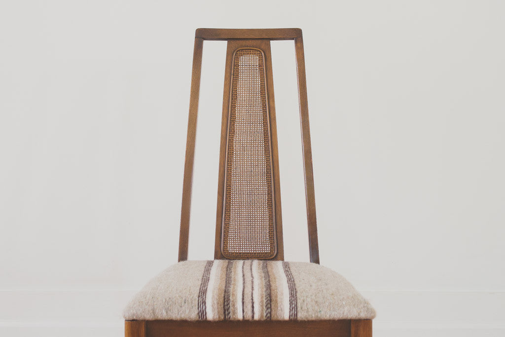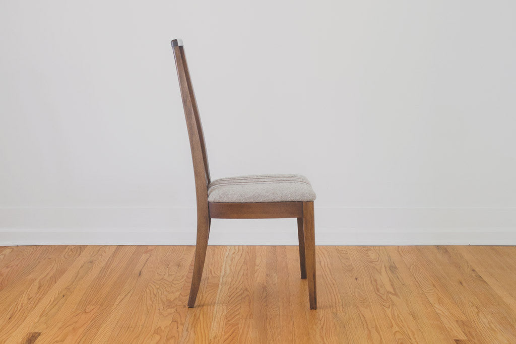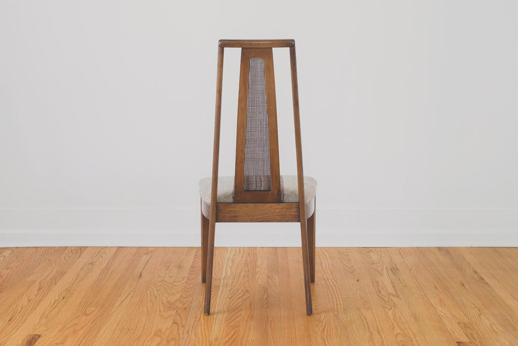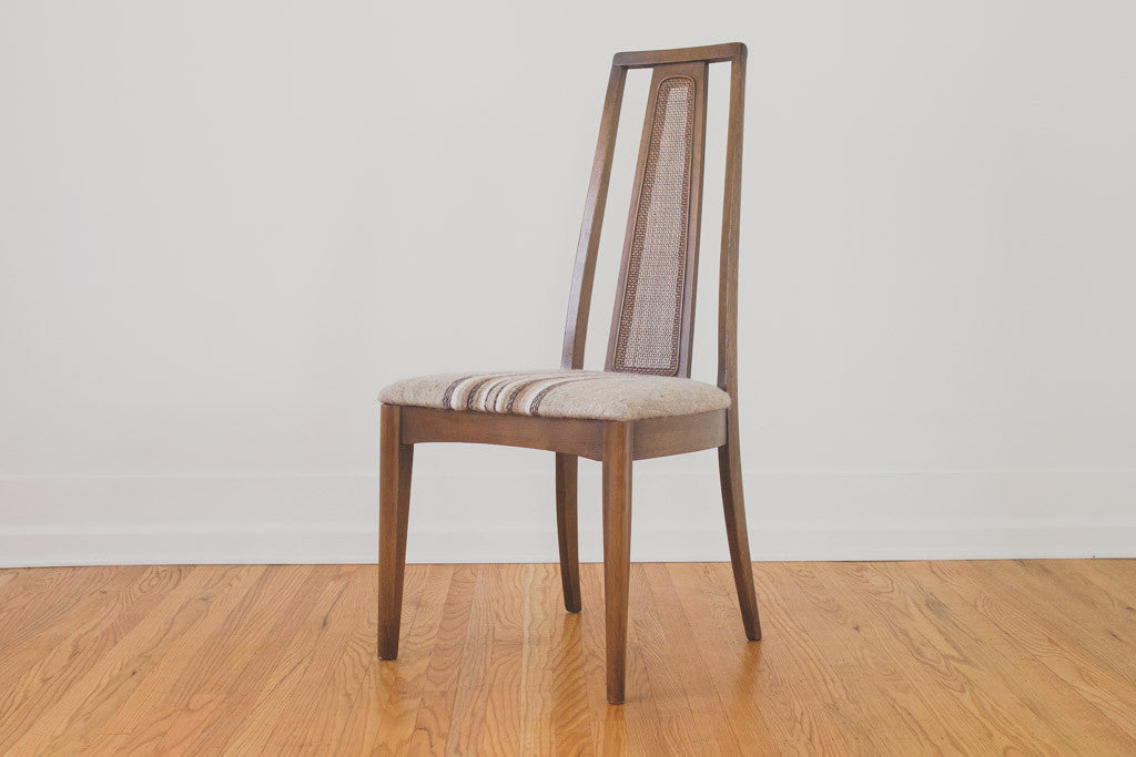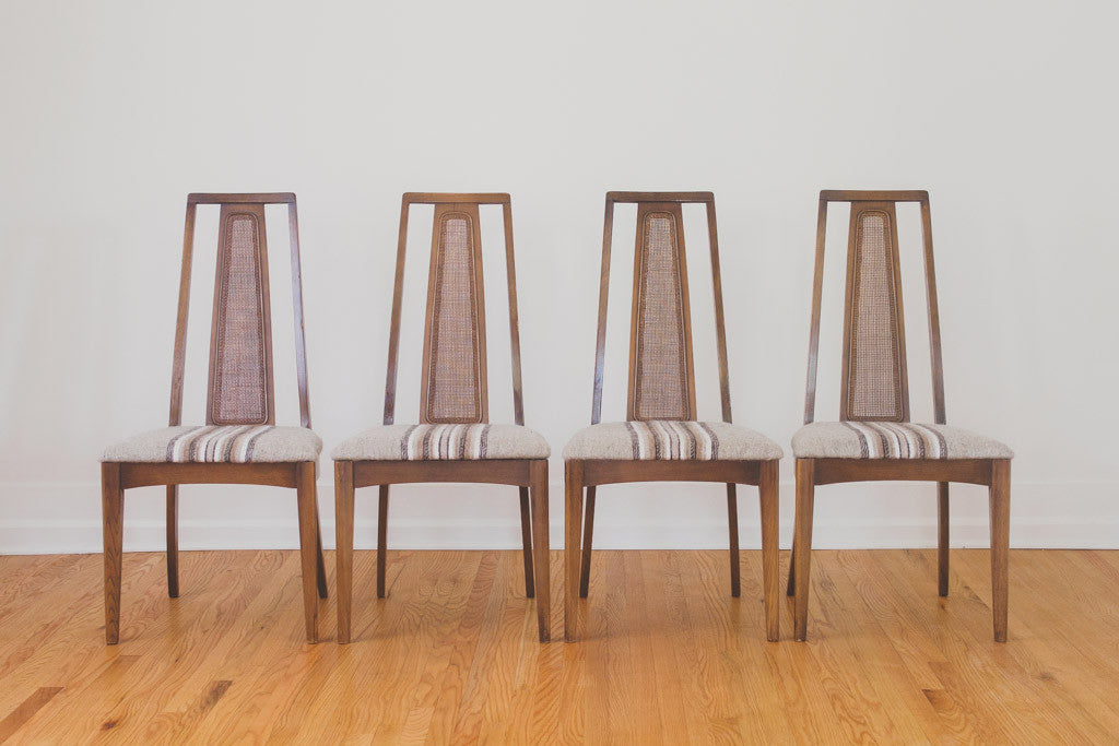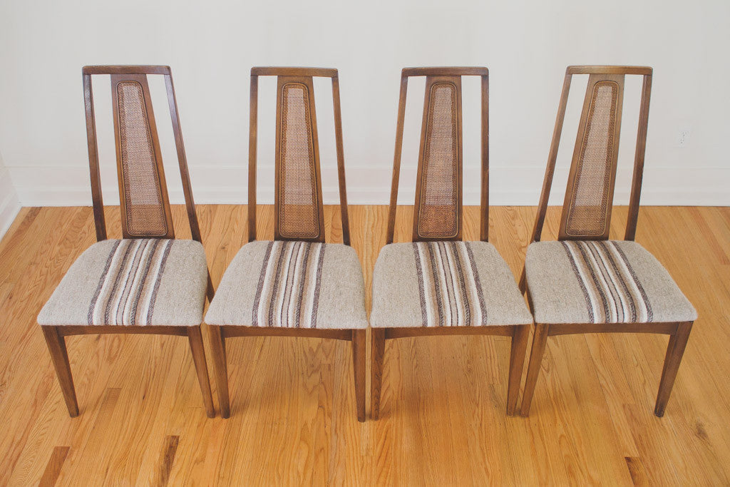 This set of four Mid Century dining chairs have walnut frames with tan, brown and cream wool upholstery. They're in good shape with age related wear to the frames and naturally occurring wear to the upholstery. Please see pictures for detailed condition.