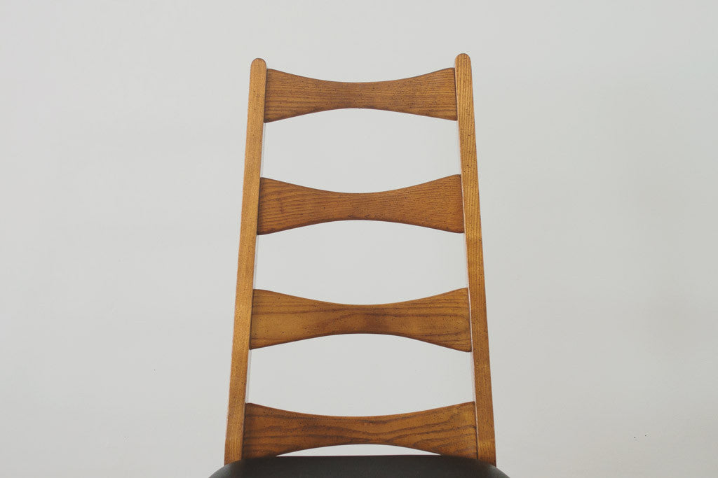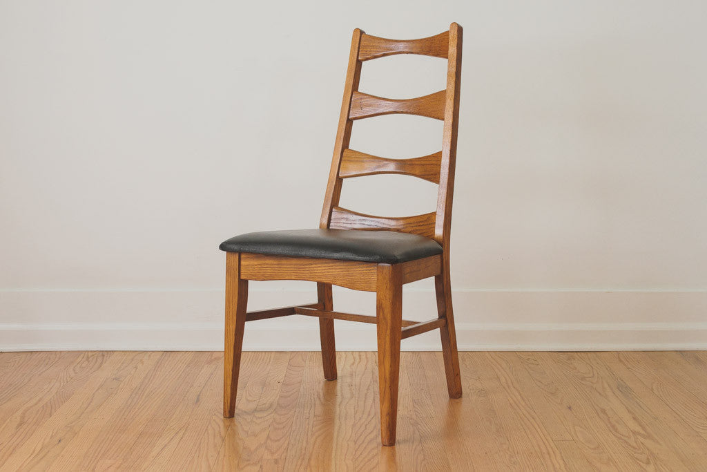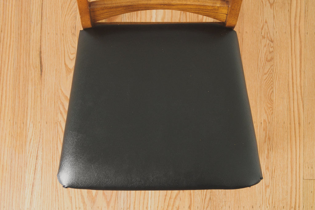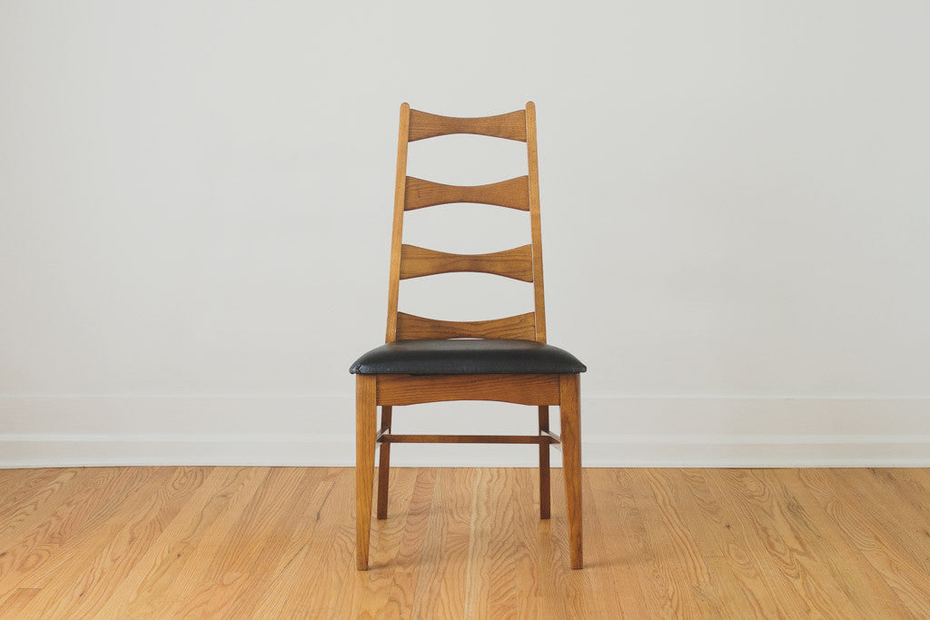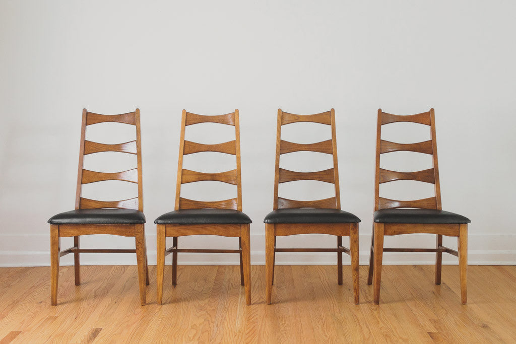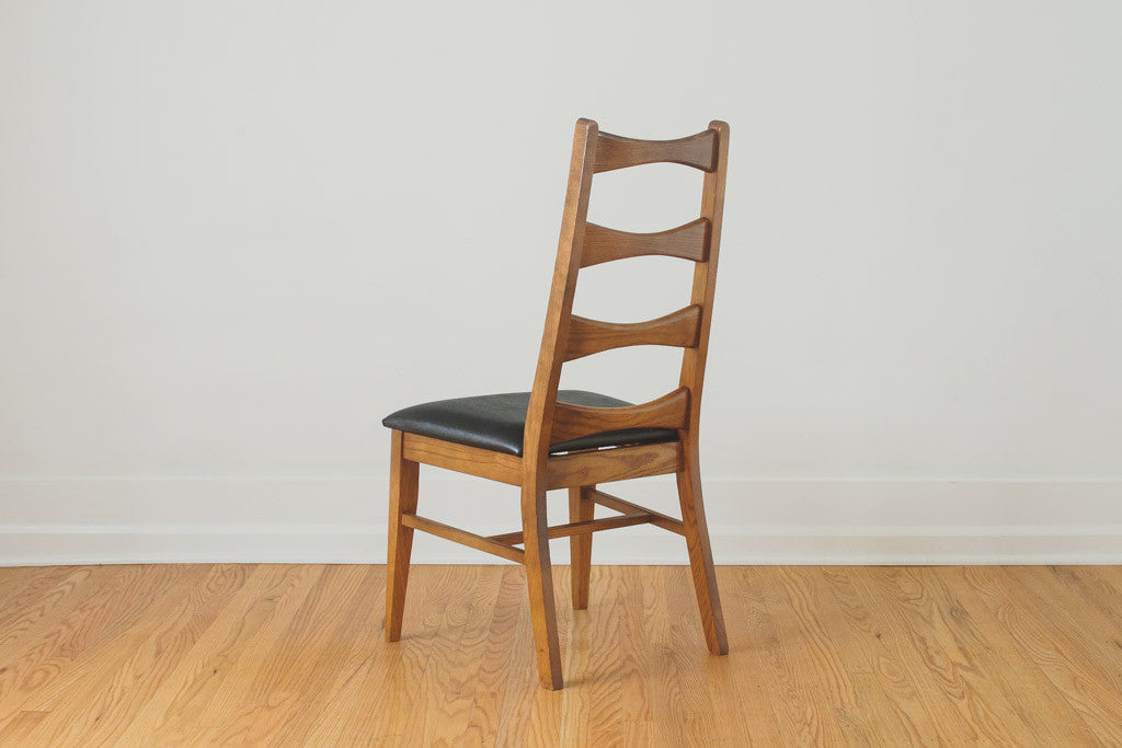 This set of four Mid Century oak dining chairs were manufactured by Liberty Chair Co. They have black naugahyde upholstery, they're sturdy and in great shape. Please see pictures for detailed condition.
