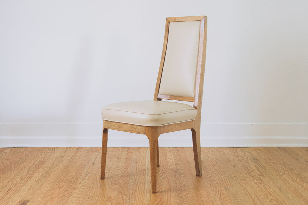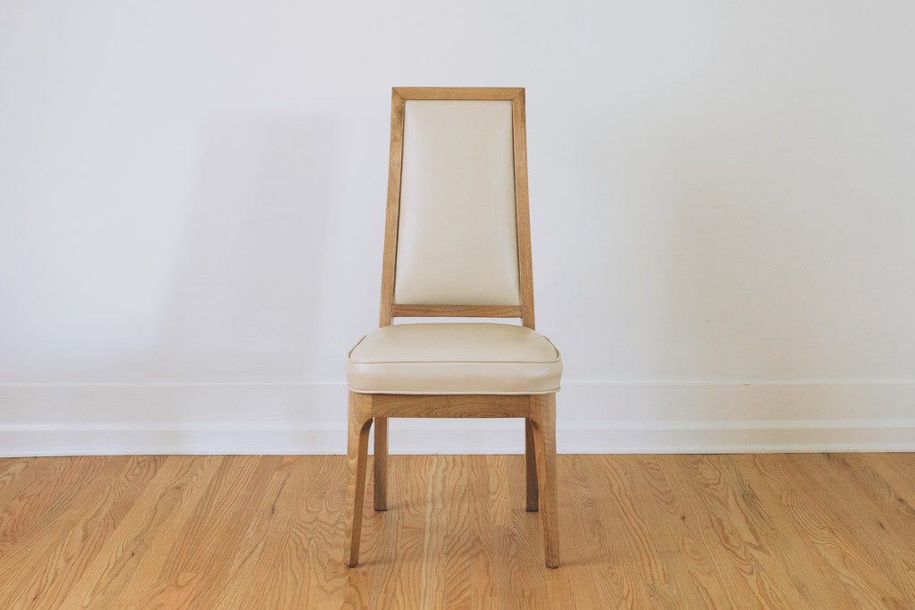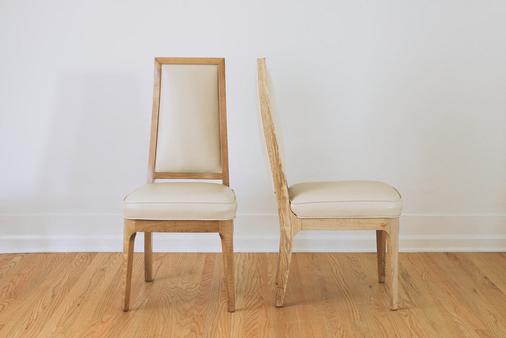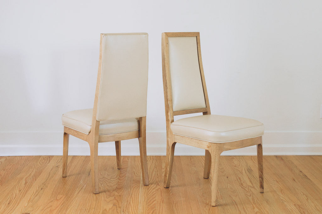 This pair of Mid Century chairs have walnut frames with off-white naugahyde upholstery and high backs. They're in good shape with age related wear. Price is for the pair. See pictures for detailed condition.