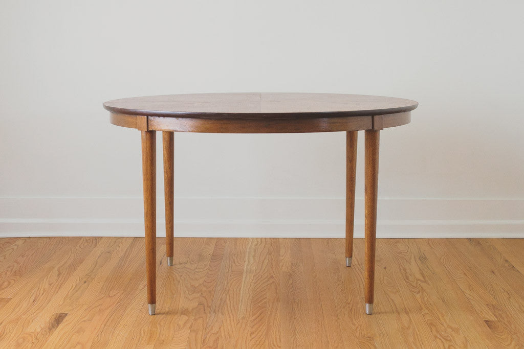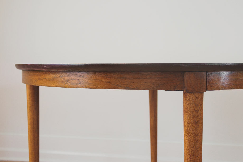 This vintage dark wood Mid Century dining table was manufactured by B.P. John Furniture. It's sturdy and in great shape with age related wear. Please see pictures for detailed condition.