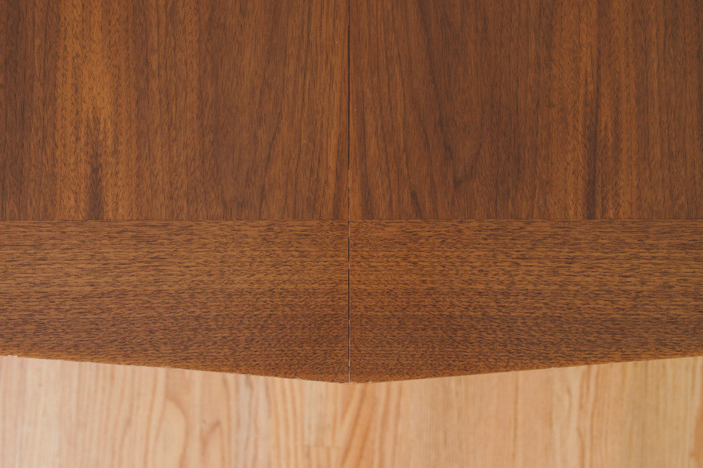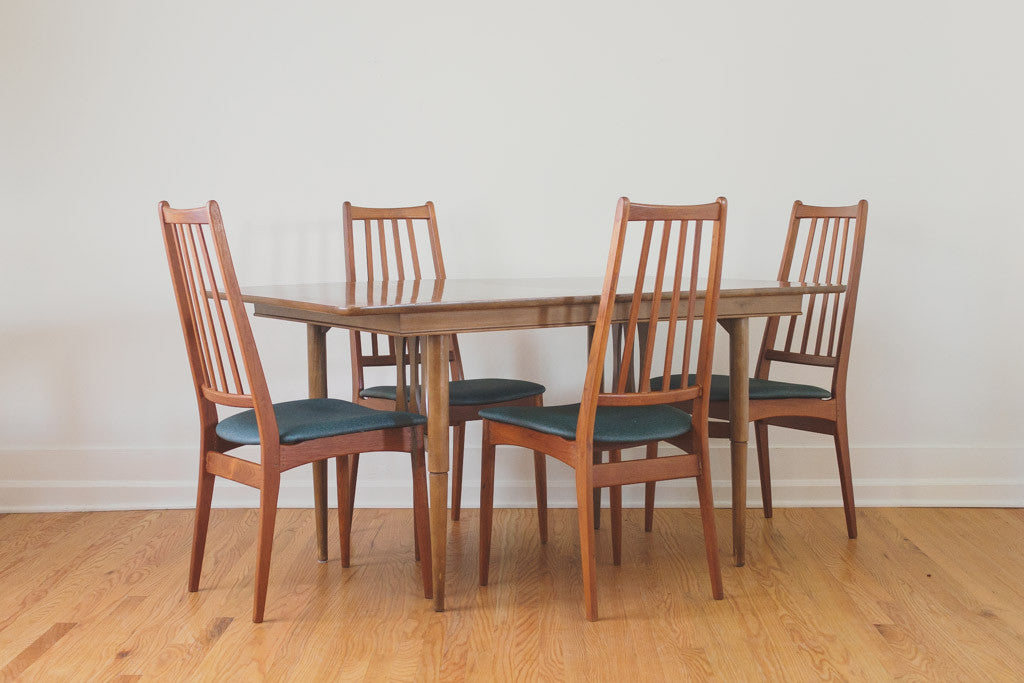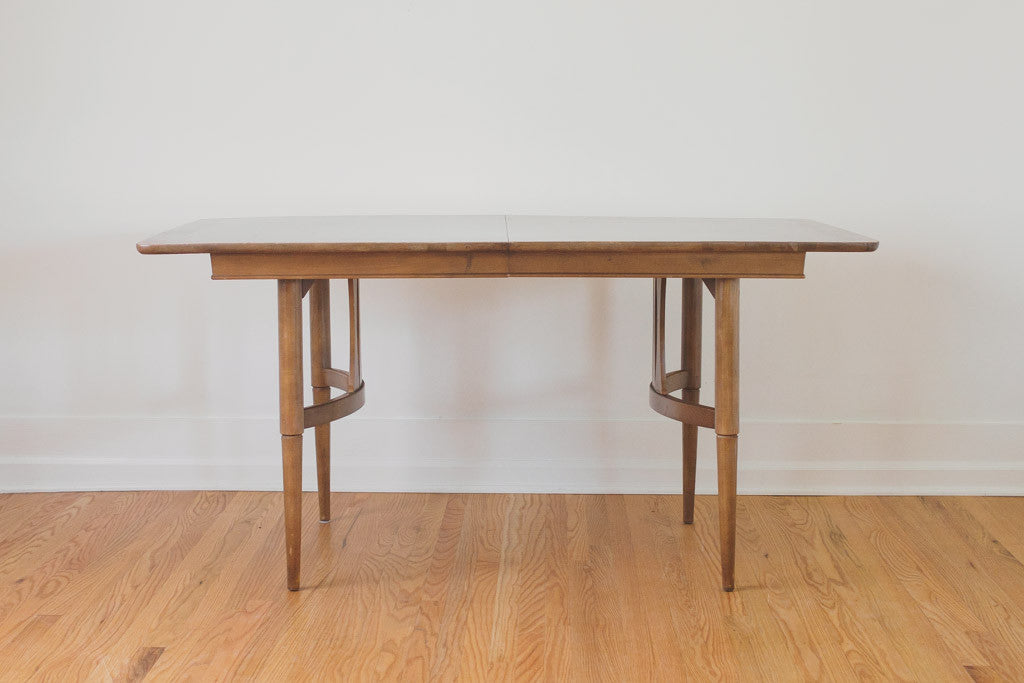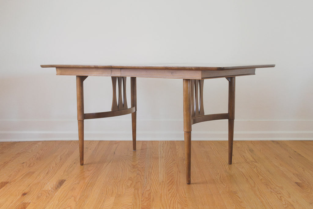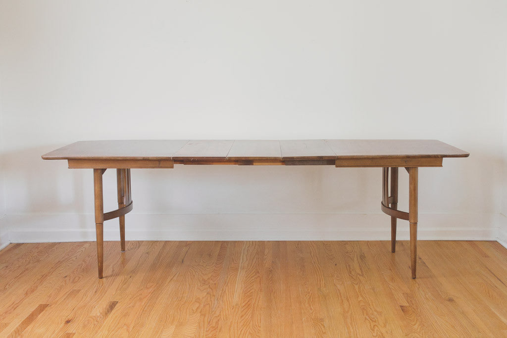 This vintage walnut Mid Century extendable dining table was manufactured by Jefferson Woodworking. It seats four comfortably and has three additional leaves. It's in good shape with age related wear. Please see pictures for detailed condition.