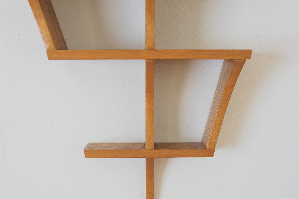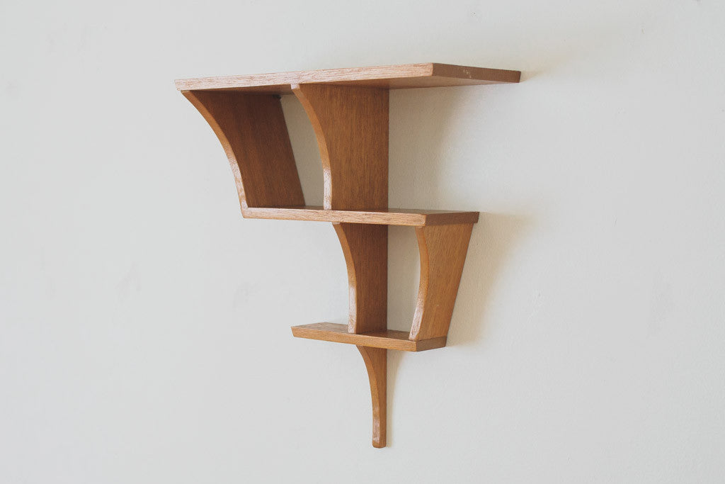 This Mid Century wall mount "S" shelf is wood with three levels for displaying your favorite smalls. It's in good shape and ready to hang. Please see pictures for detailed condition.