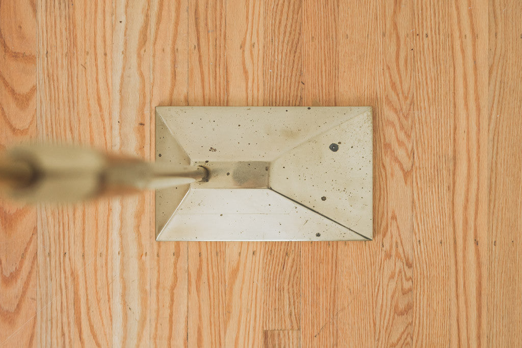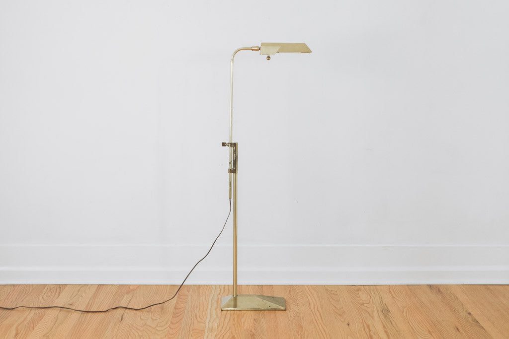 This vintage brass floor lamp is adjustable in height and direction. It has a dimmer knob and is in good shape with age related wear. See pictures for detailed condition.