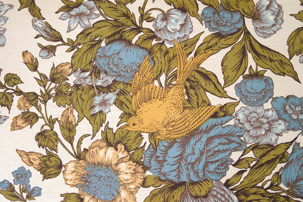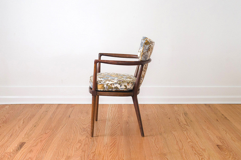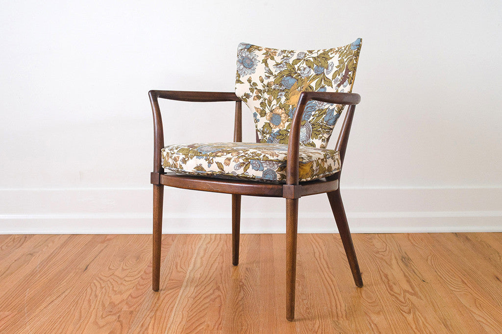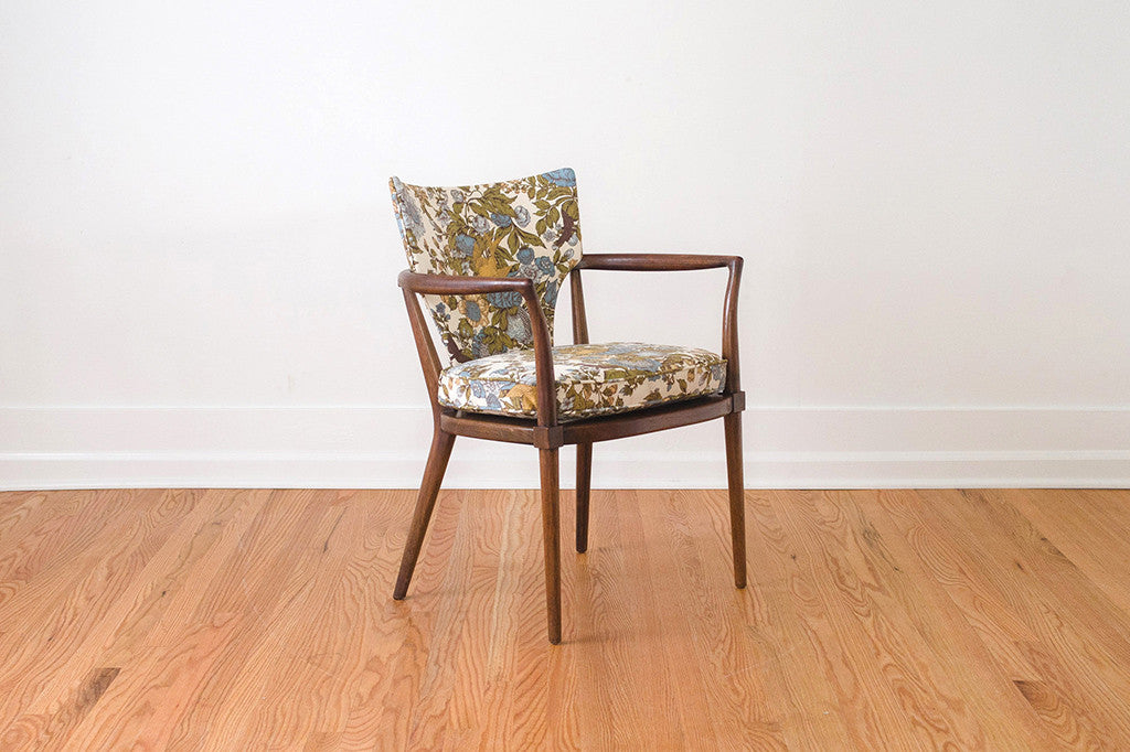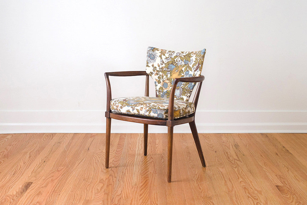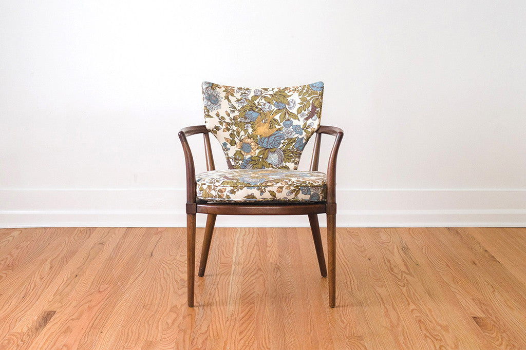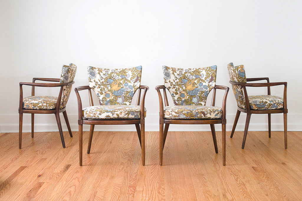 This set of four wood framed Mid Century dining chairs were reupholstered in a vintage floral and bird print fabric. All four chairs have arms, sturdy frames and very comfortable loose seat cushions. The colors in the upholstery are blues, greens and yellow. Please see pictures for detailed condition of this piece.