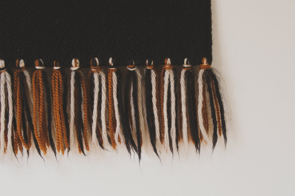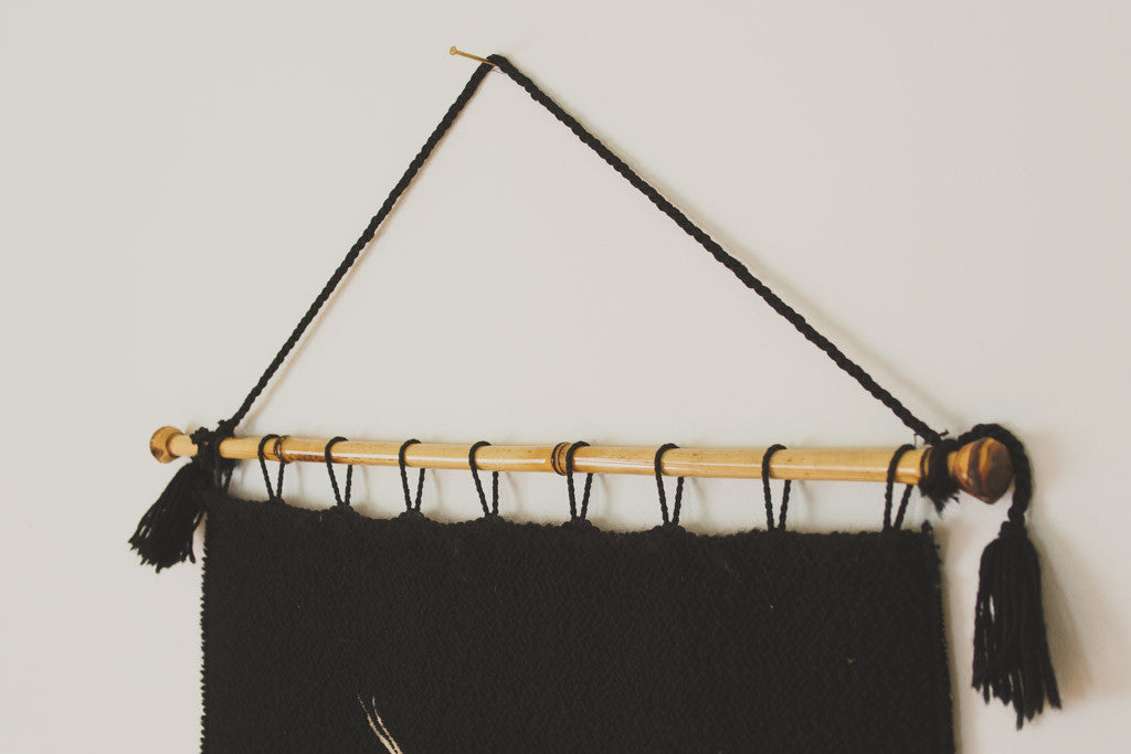 This Mid Century woven wall hanging is a black wool blend with two brown and white gazelles, fringe and a wooden dowel. It's in good shape and ready to hang. Please see pictures for detailed condition.