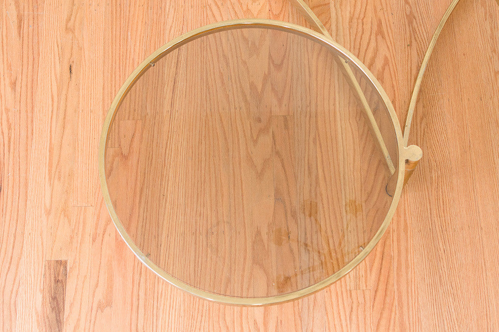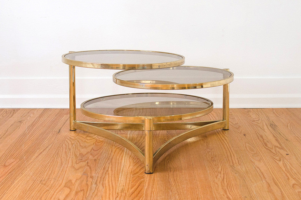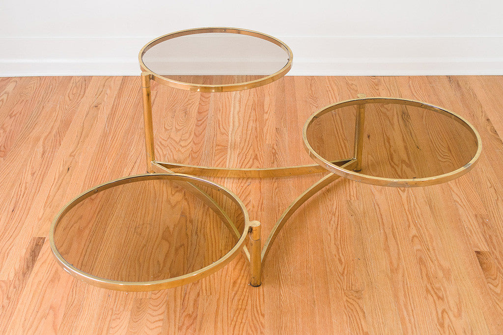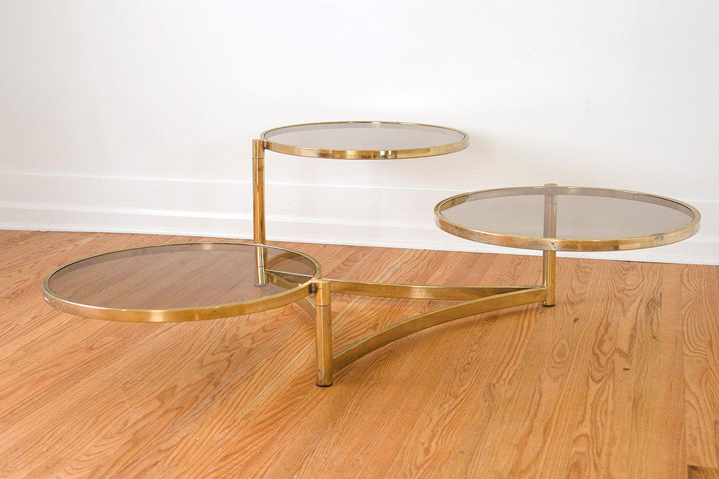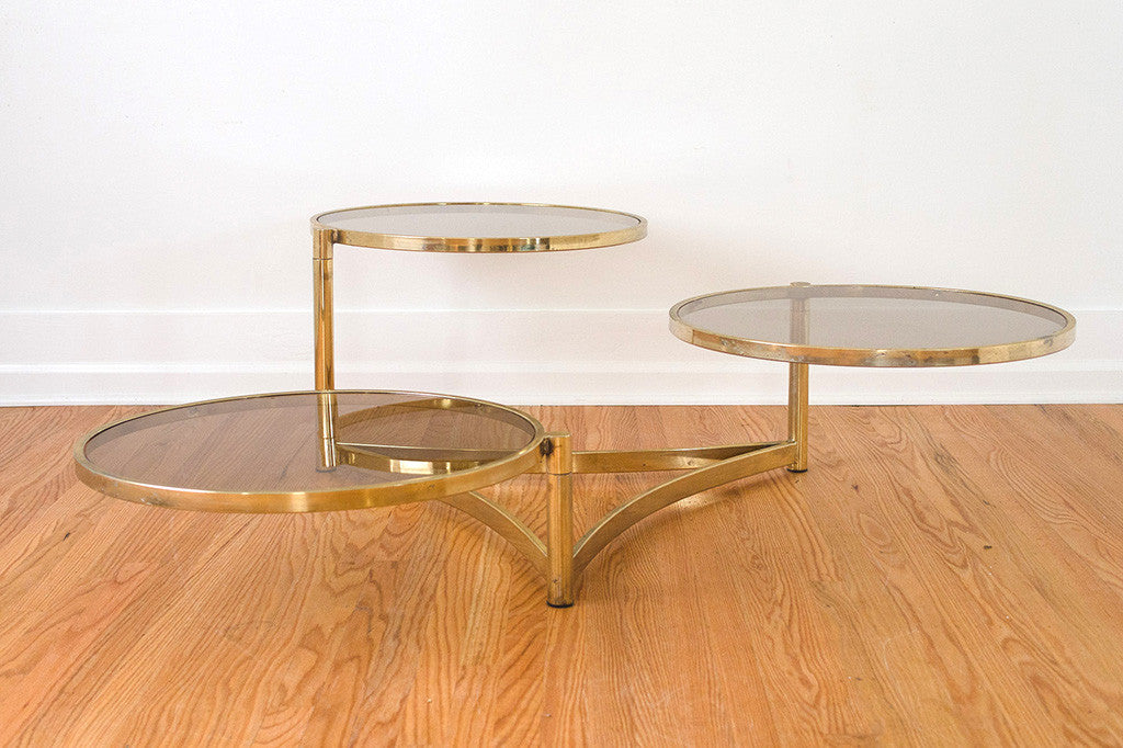This Mid Century coffee table has a brass frame and a very lightly smokey glass top. It can be a smaller compact size if all three circles are pulled inward or they can swivel out to create a larger table. This table has a clean geometric look and would work with a variety of decorating styles. It's in great shape with some light age related wear to the frame. Please see pictures for detailed condition of this piece.